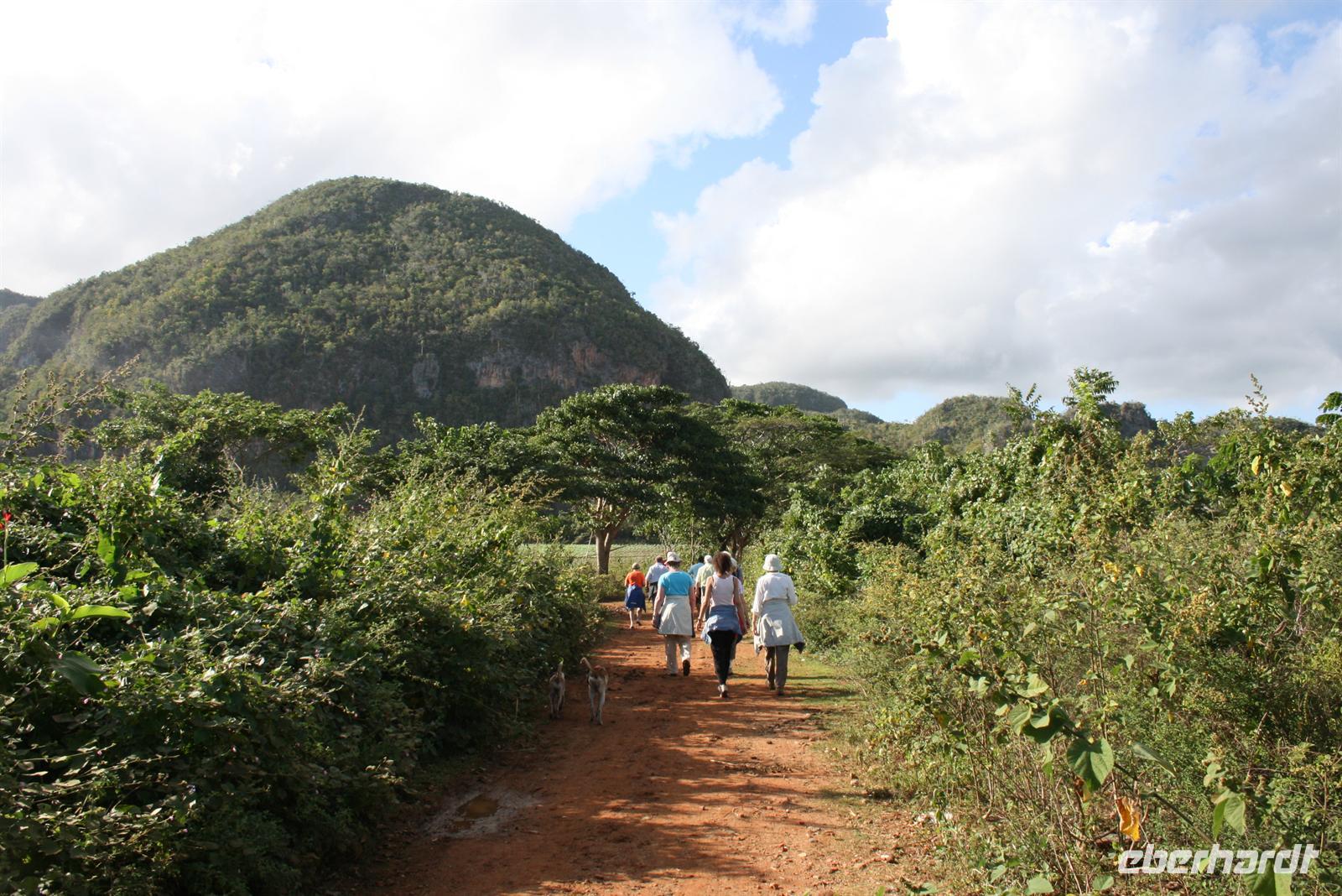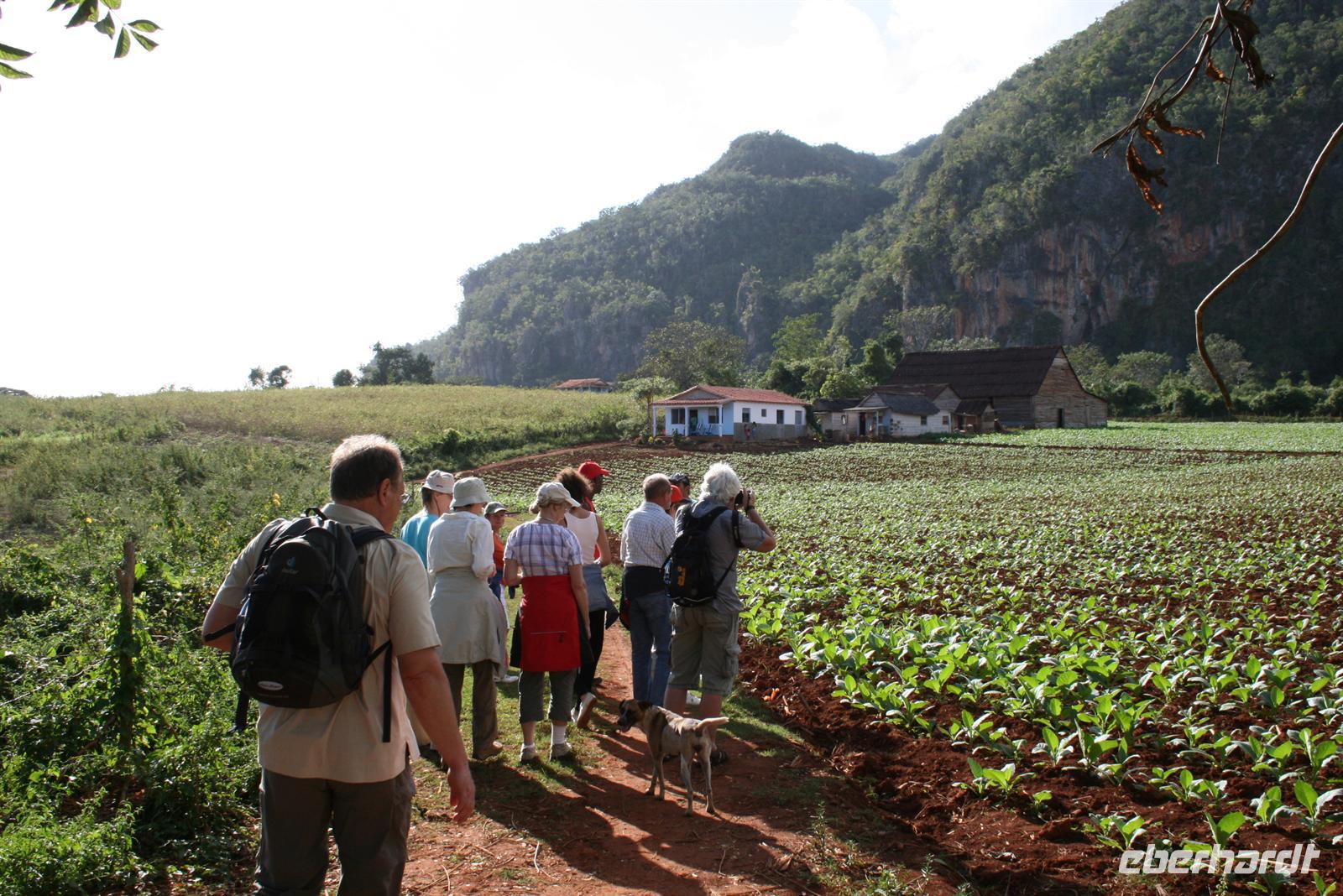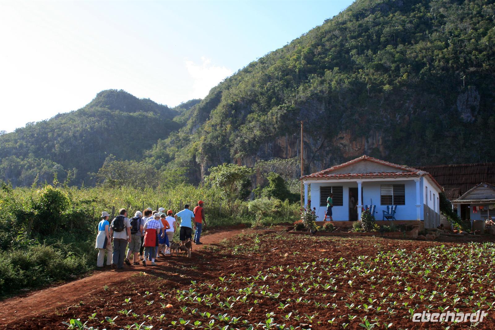 In Vinales erwartet uns ein örtlicher Führer zu einer kleinen zweistündigen Wanderung durch das Vinales-Tal. Wir besuchen einen Tabakbauern, besichtigen die jungen Tabakpflanzen, die Trockenscheune und das Haus, wo uns die Bäuerin zeigt, wie eine Zigarre gedreht wird. Man kann auch Zigarren und Kaffeebohnen kaufen.