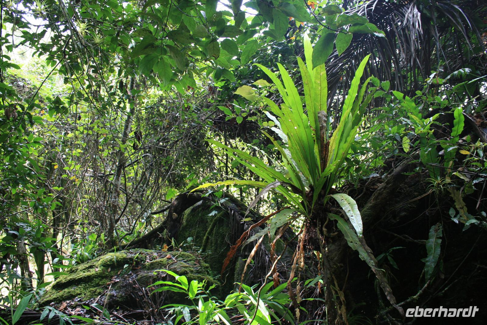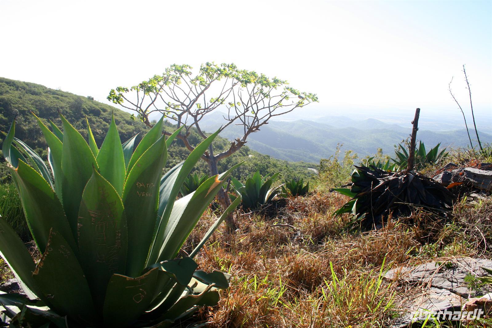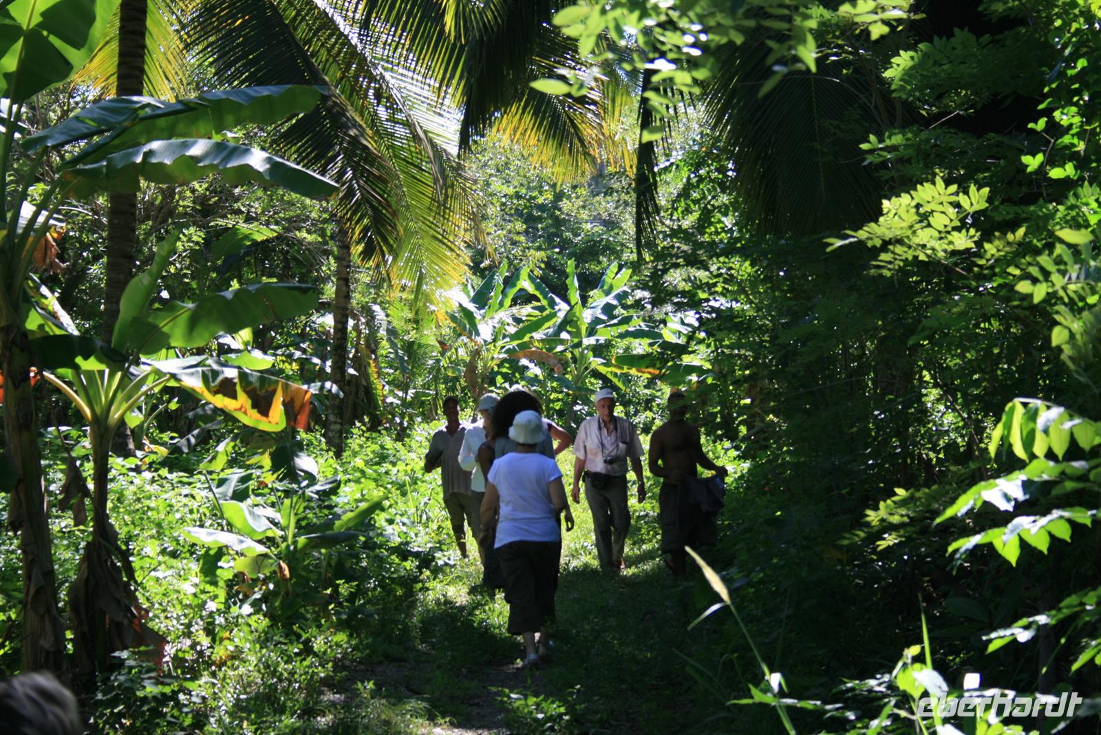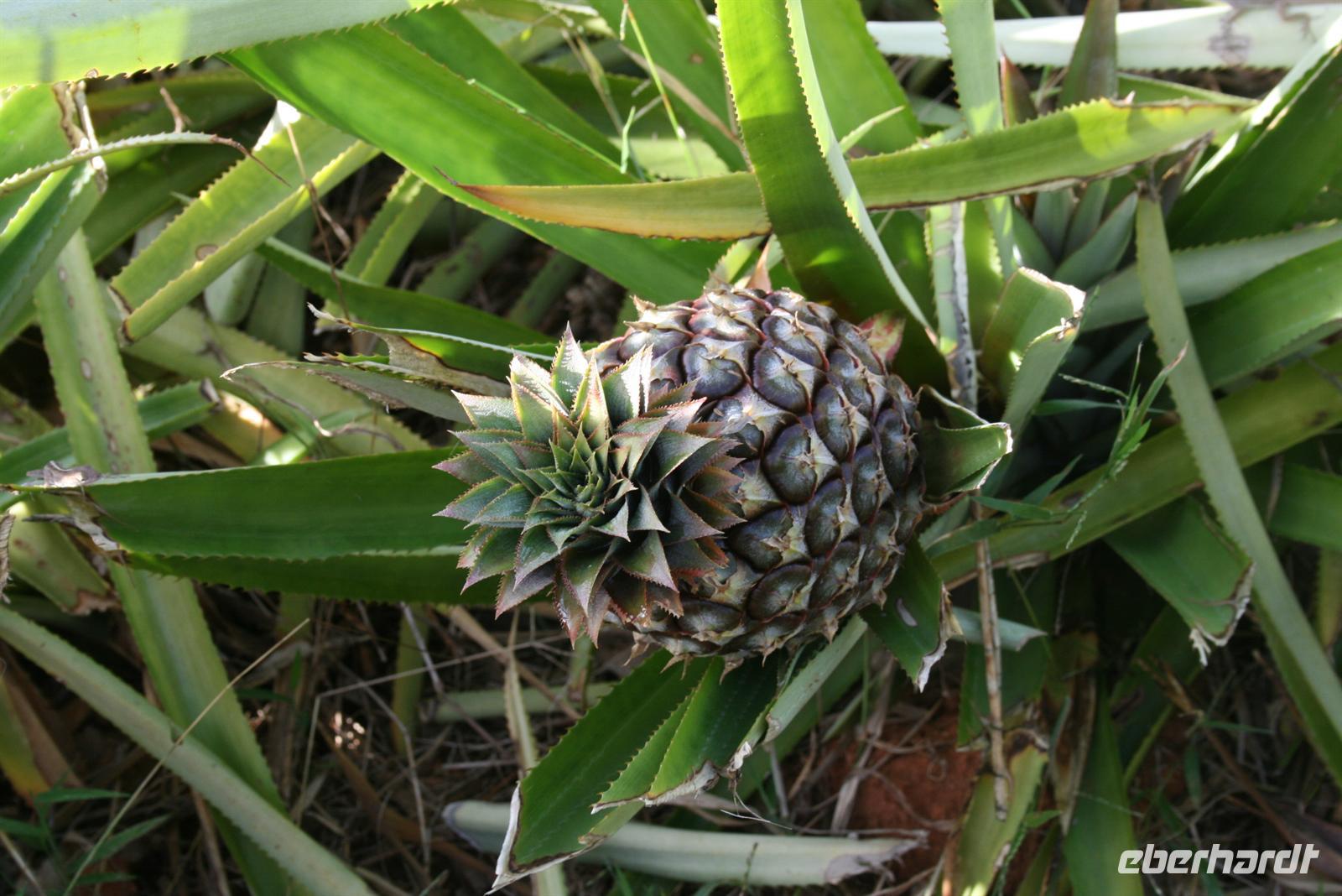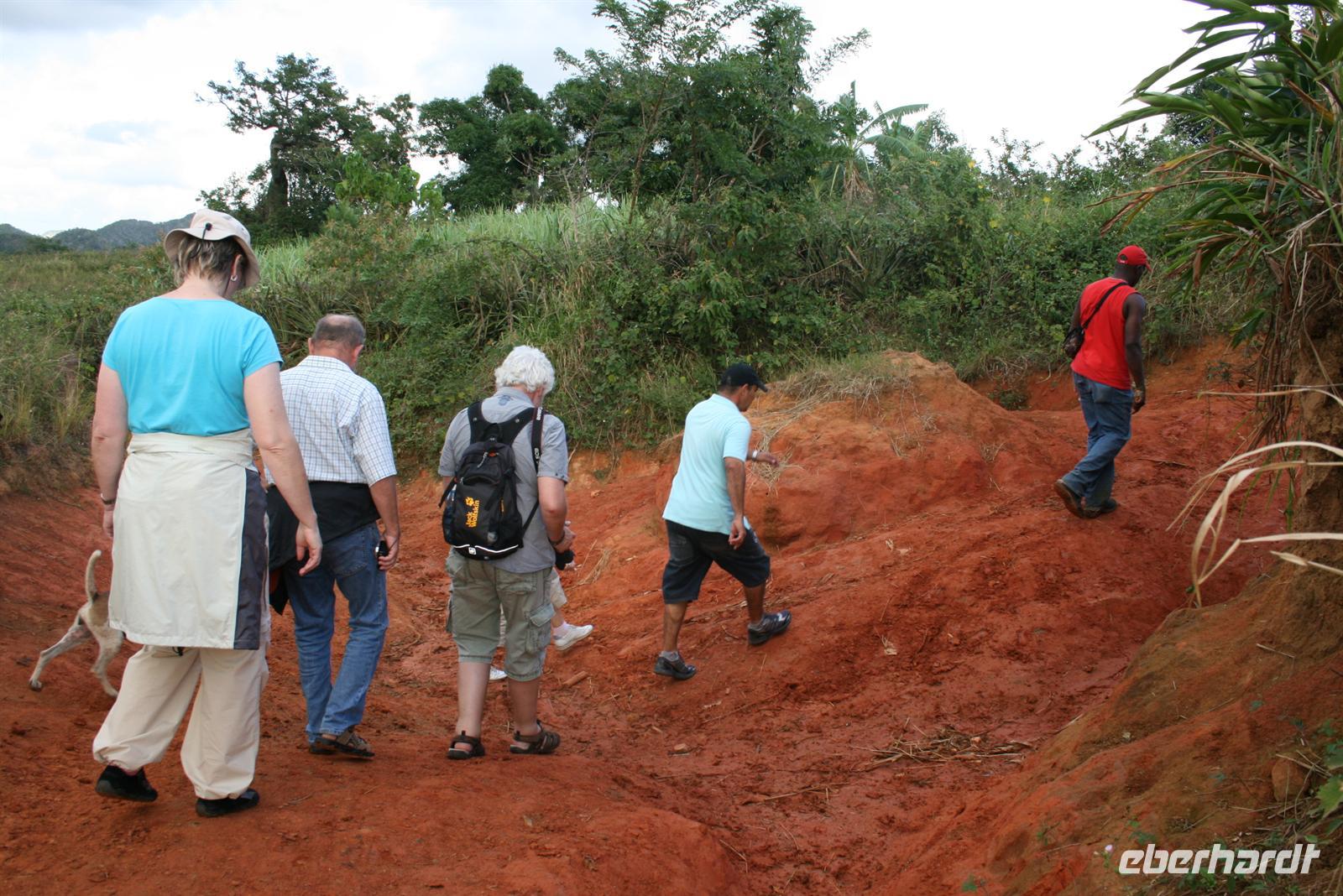 Auf leicht lehmigen Wegen wandern wir durch Felder und kleine Wälder. Unbedingt auf festes Schuhwerk achten. Wir sehen eine Ananas-Plantage und mehrere kleine Bauernhäuser.