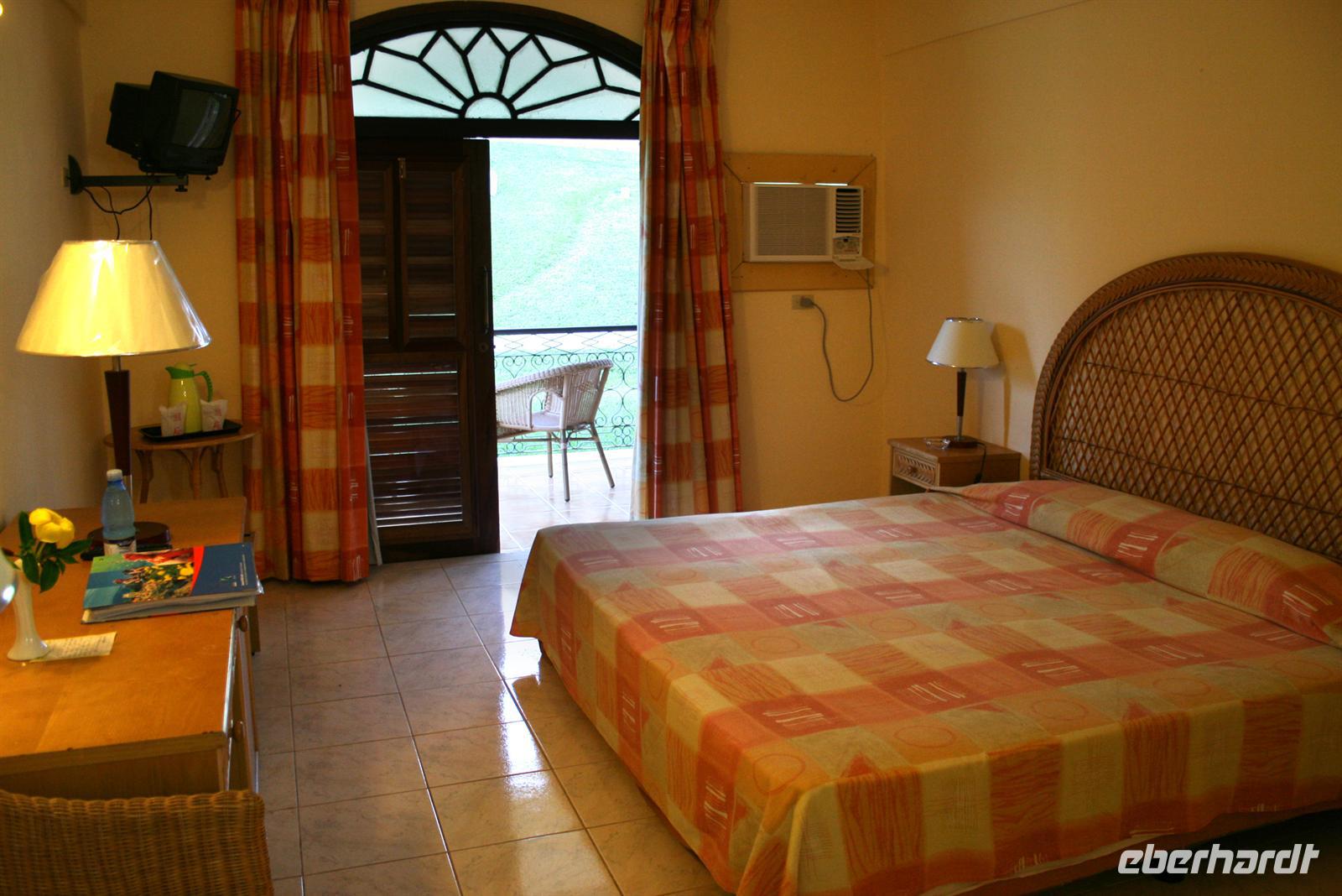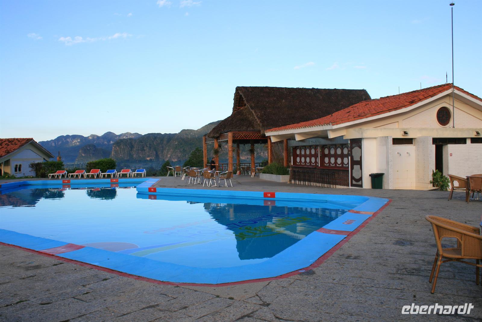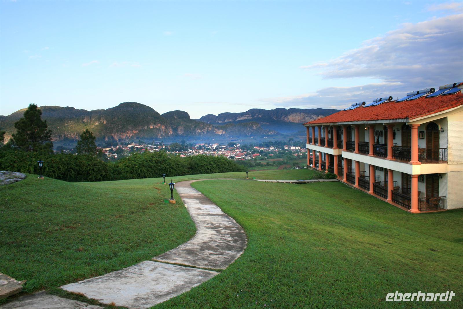 Gegen 17.00 Uhr erreichen wir unser 3-Sterne-Hotel „La Ermita“, welches direkt im Vinales-Tal oberhalb des Dorfes Vinales liegt. Die Hotelanlage besteht aus mehreren Wohnhäusern, bietet ein Restaurant, Souvenirshop, Pool und eine Bar. Die Zimmer sind großzügig geschnitten und einfach eingerichtet mit TV, Dusche/WC, Klimaanlage und Balkon oder Terrasse.