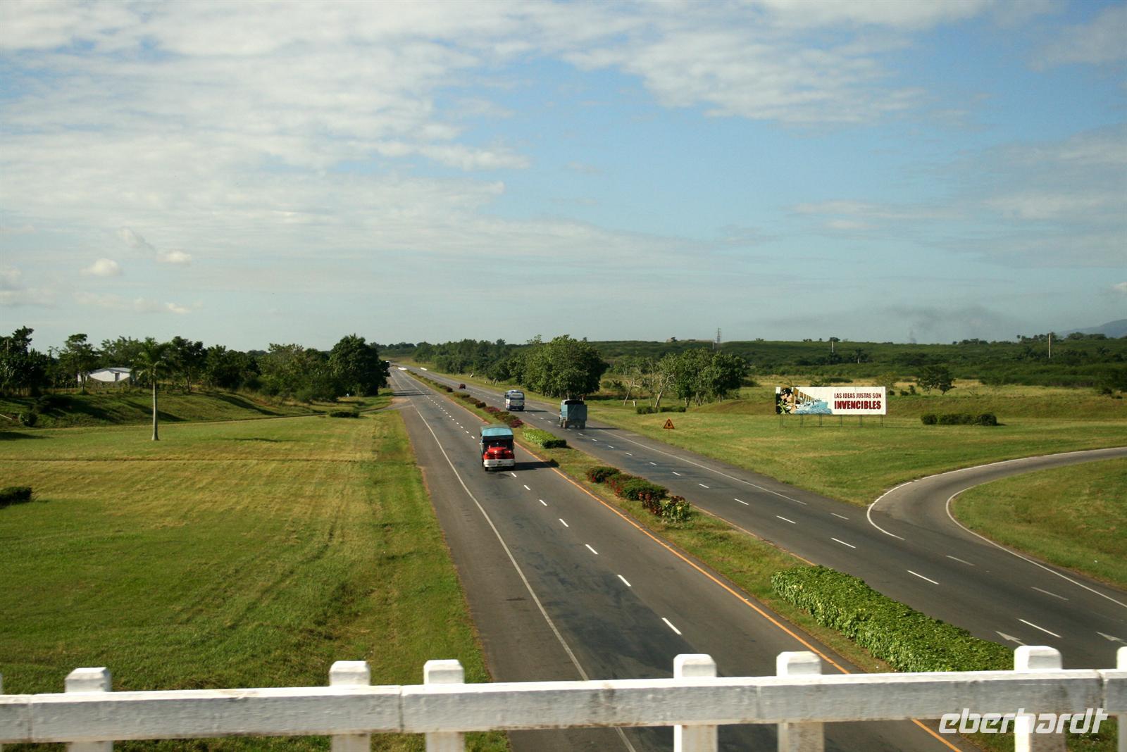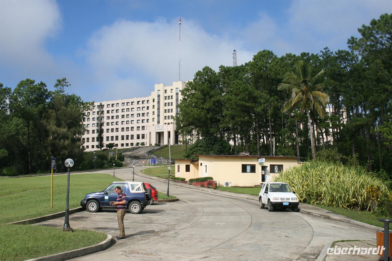 Wir fahren vorbei an der Einfahrt zum Militärgebiet Guantanamo. Früher gab es hier einen Aussichtspunkt, von dem man das Gefängnis sehen konnte. Heute ist dieser aber gesperrt und die Einfahrt abgeriegelt. Wir können nur einen kurzen Blick auf die Guantanamo-Bucht werfen, als unser Bus die Bergstraße hinauf fährt. Man sieht nichts Spektakuläres.