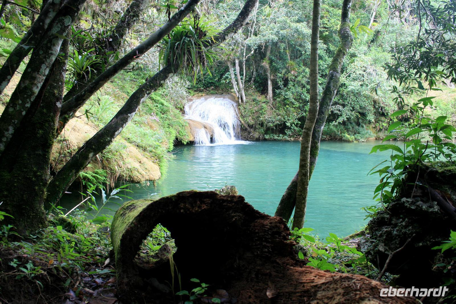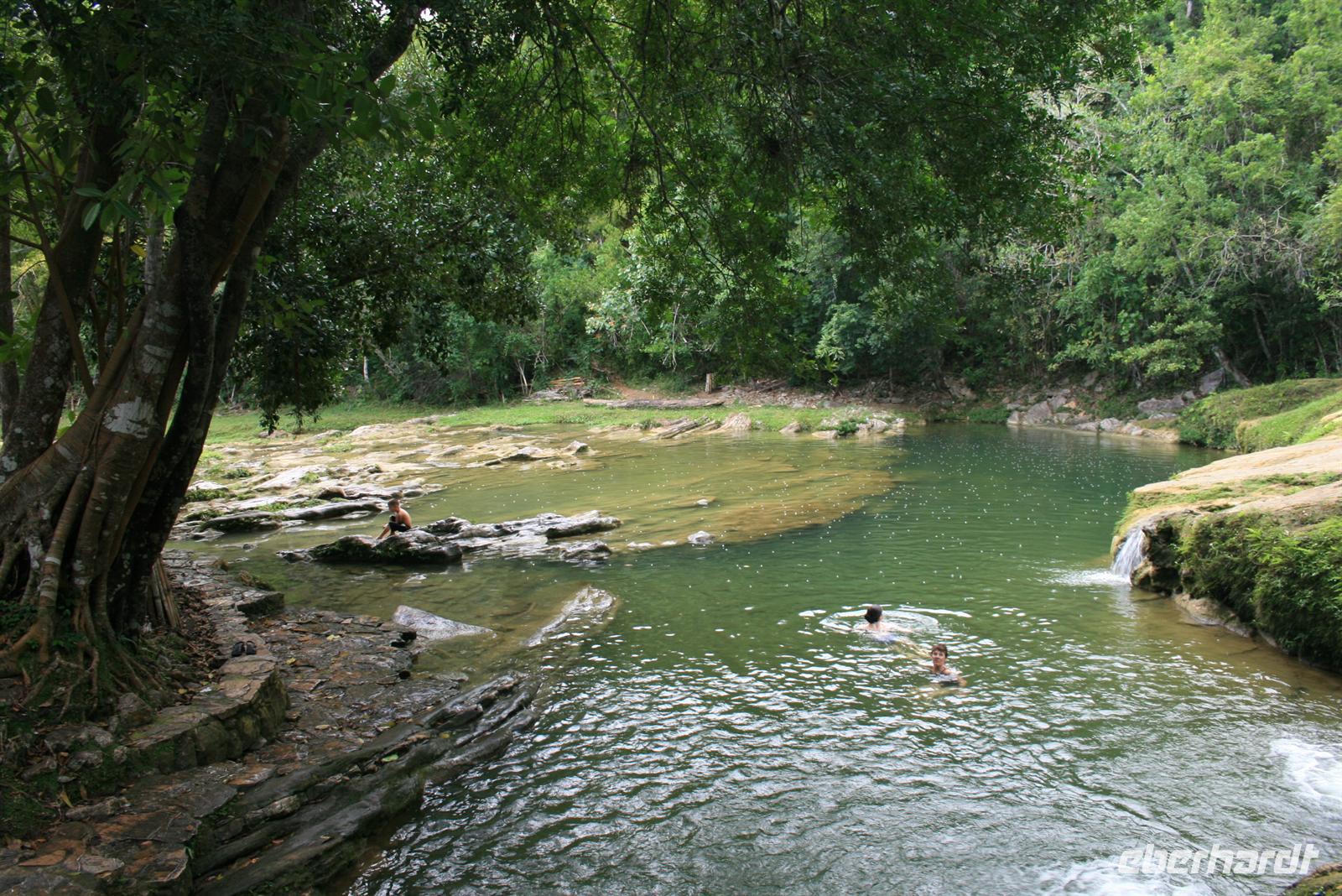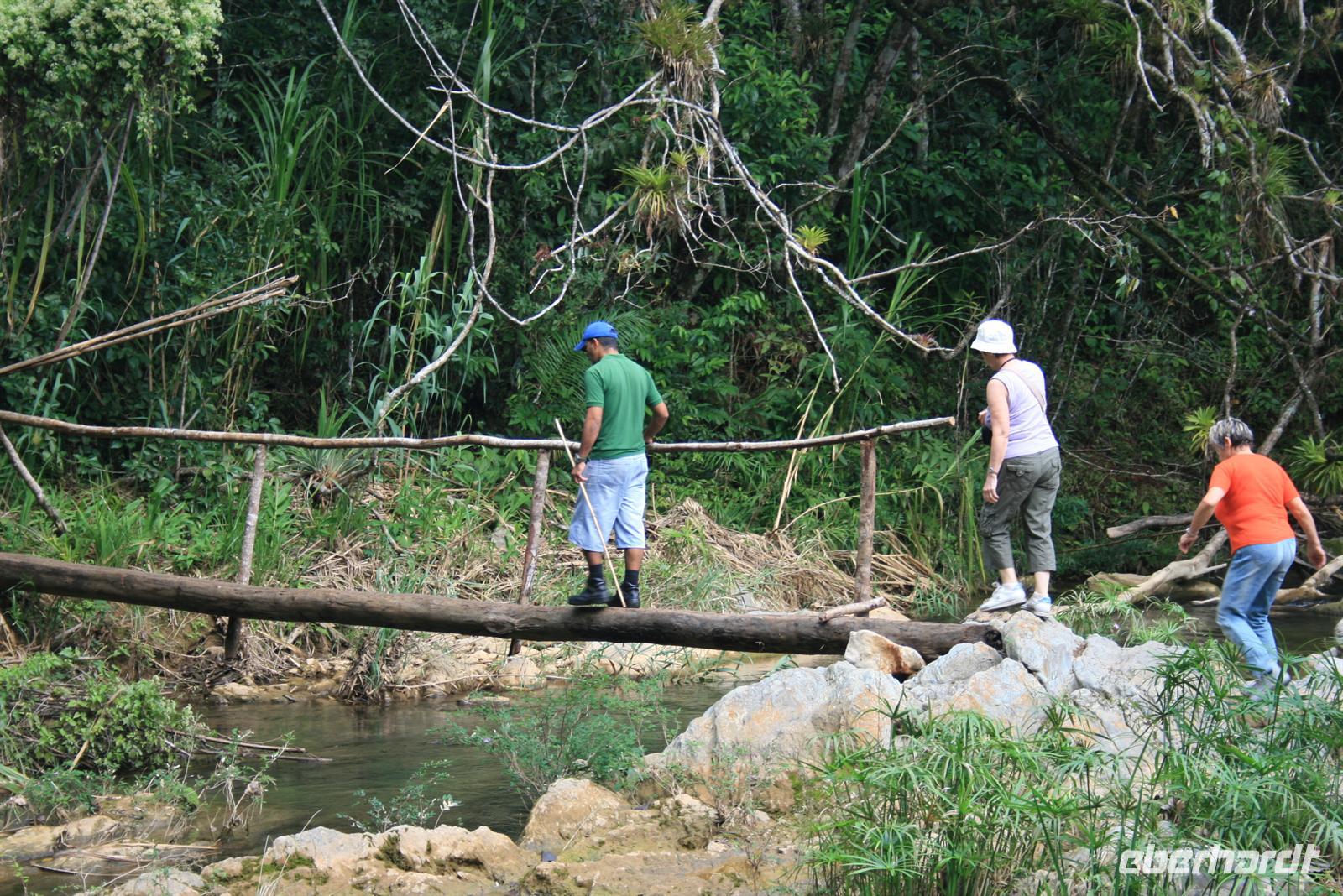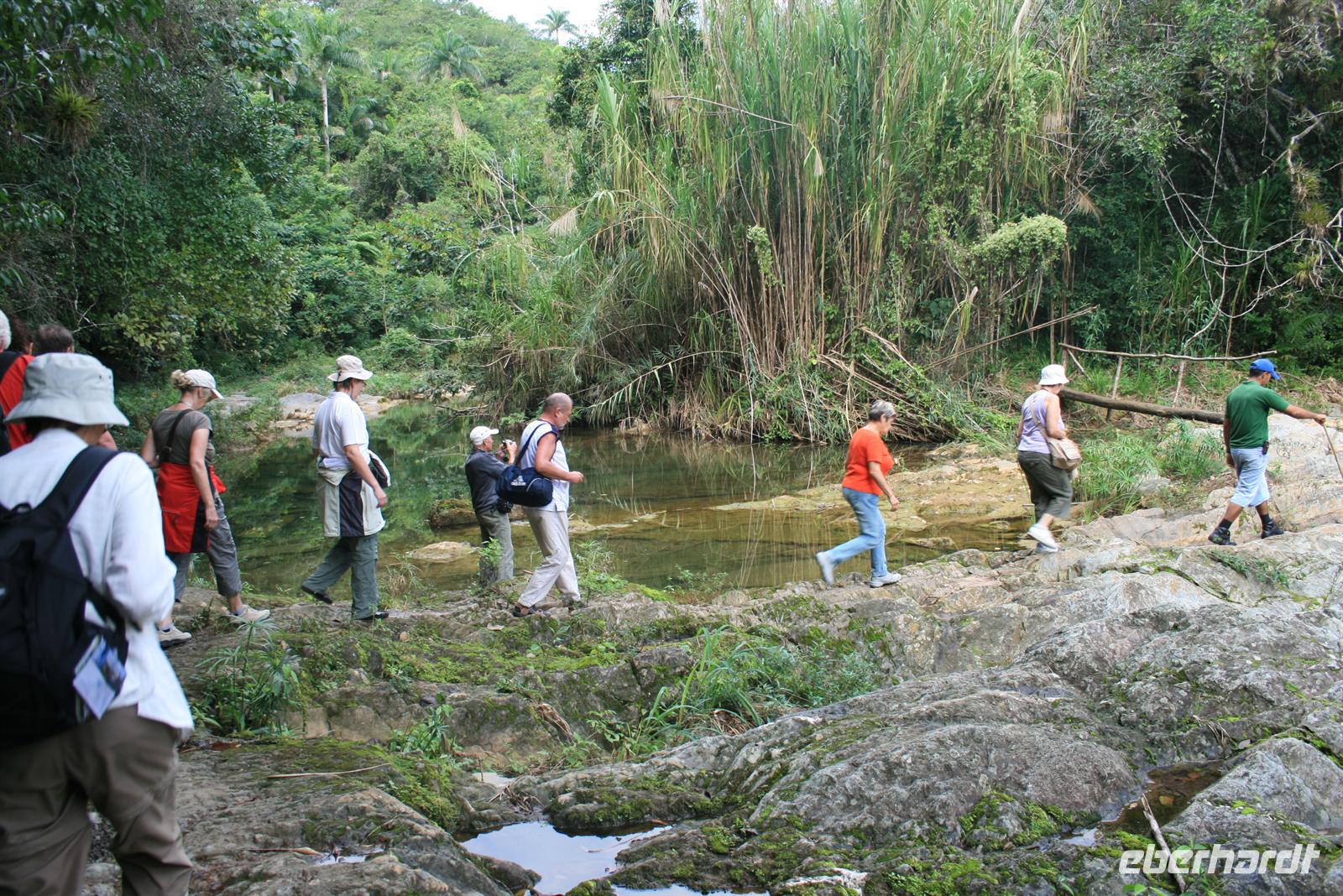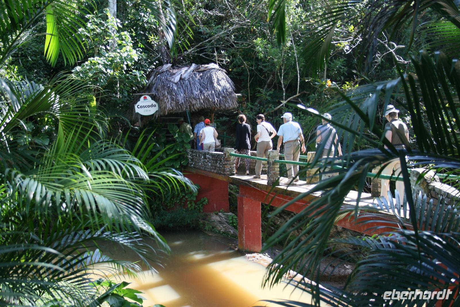Mit unserem Naturführer und George wandern wir auf schmalen Wegen und Pfaden, entlang des Rio Melodioso und über Holzstege im Naturschutzgebiet in der Sierra del Escambray. Wir sehen endemische Pflanzen, exotische Früchte, Weihnachtssterne, Termitenbauten und Orchideen. Nach reichlich einer Stunde gelangen wir an einem Naturwasserbecken an, an dem wir Rast machen. Hier gibt es auch einen kleinen Kiosk, an dem man Getränke kaufen kann.