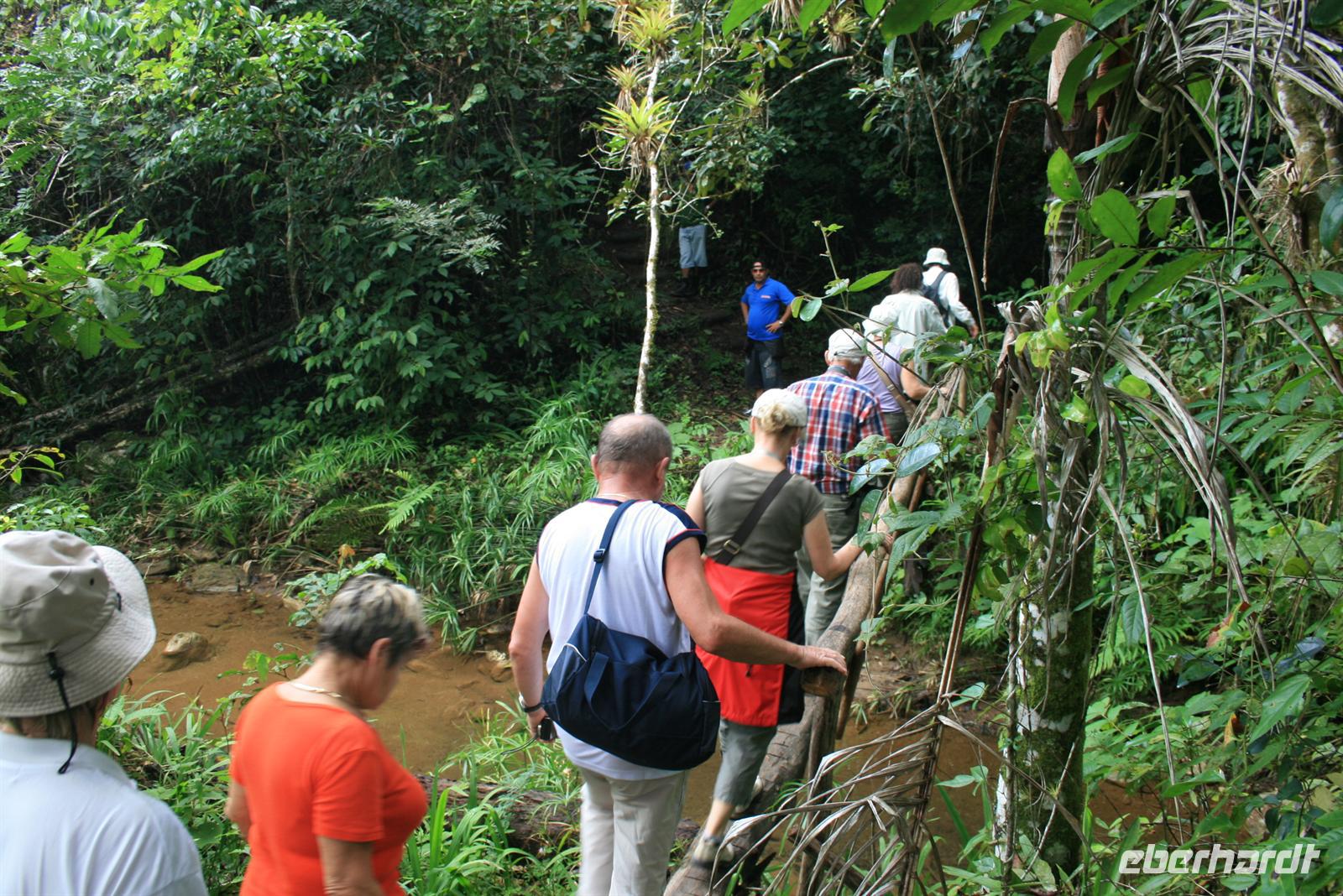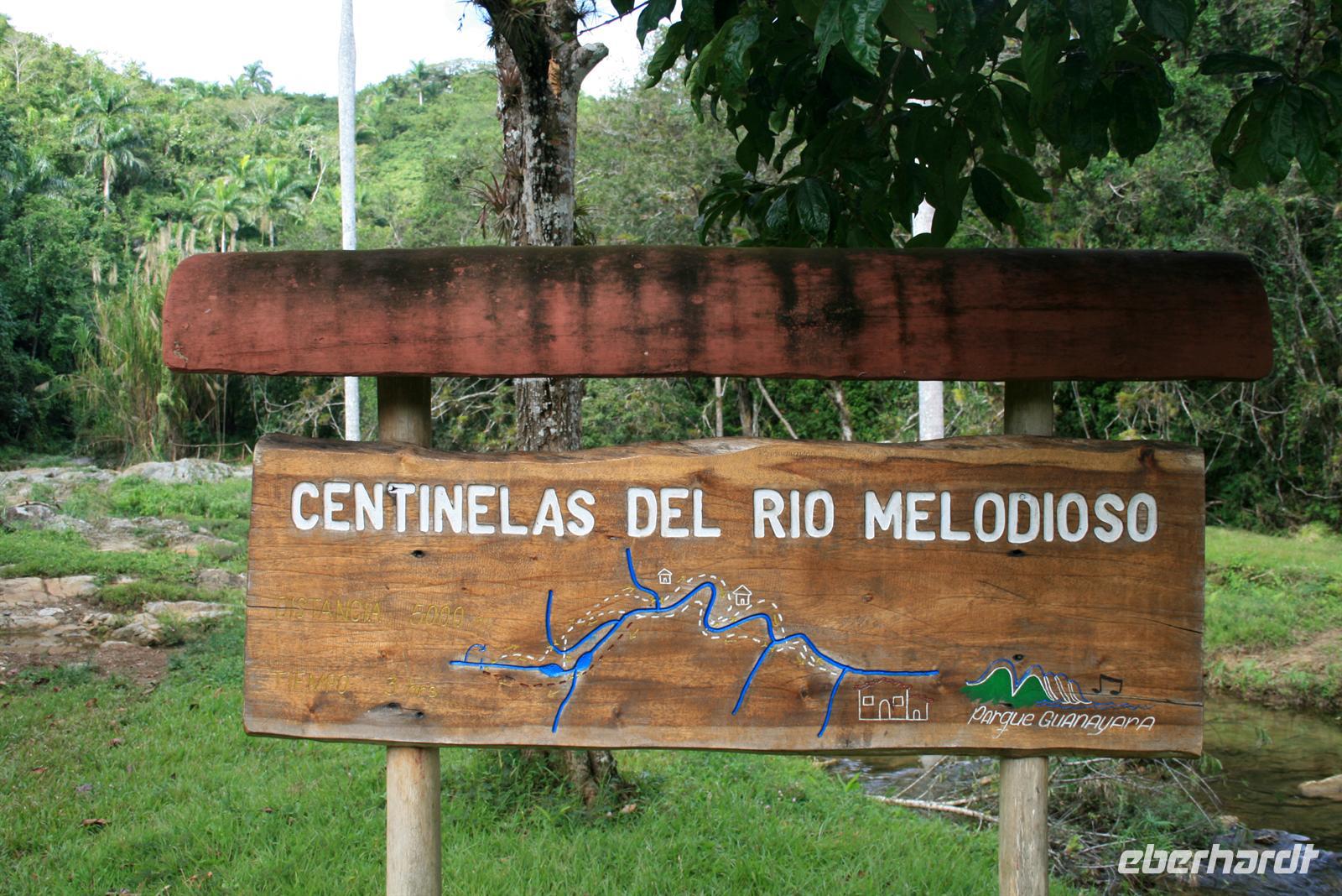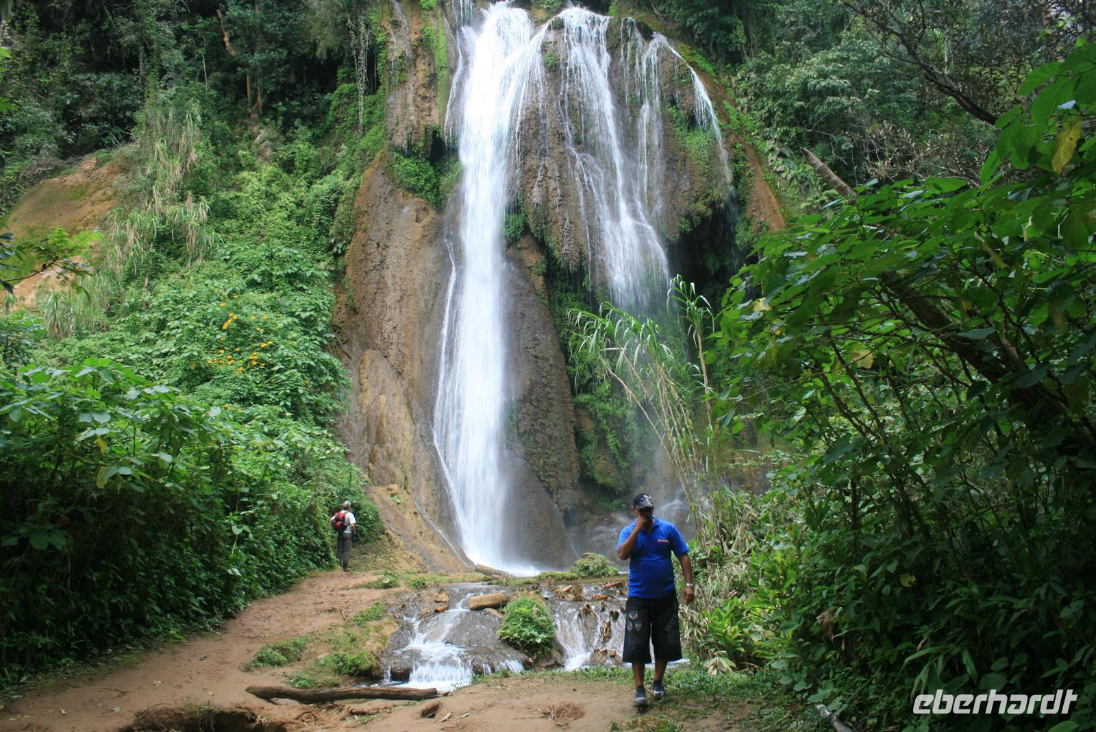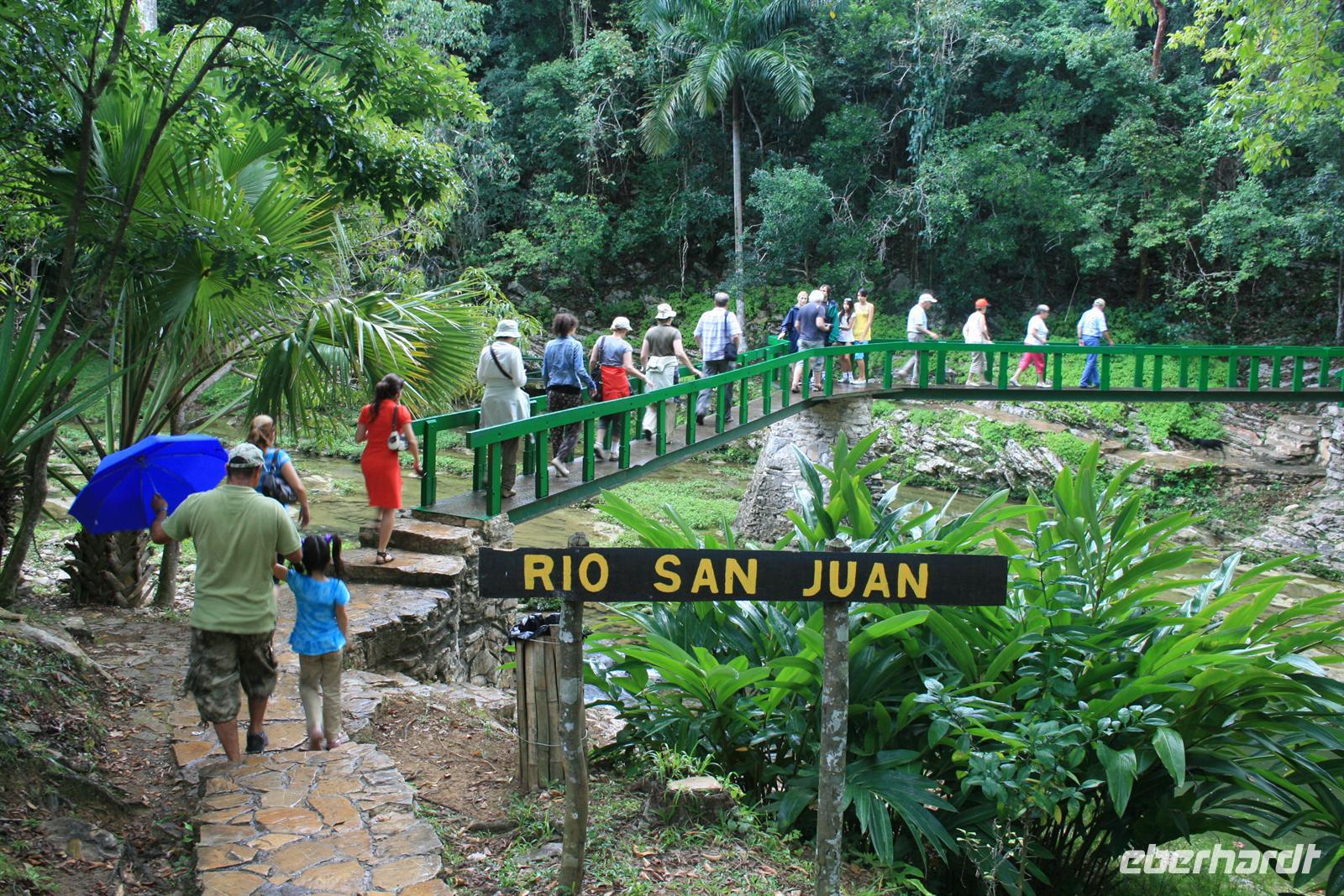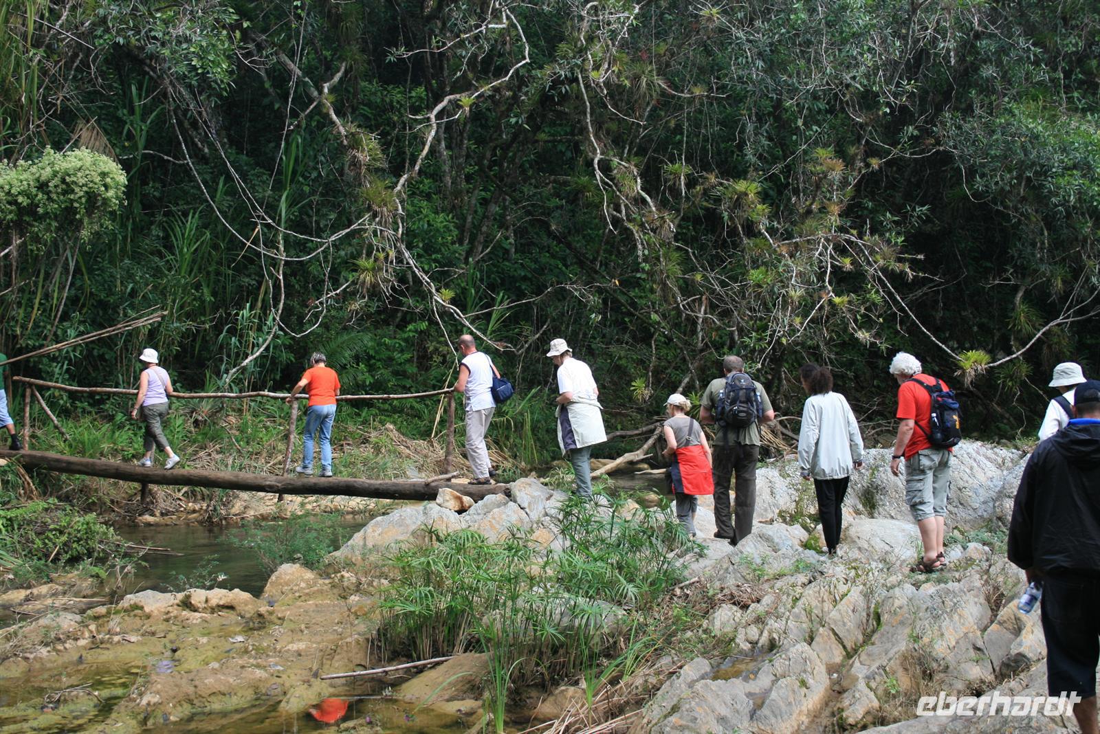 Mit unserem Naturführer und George wandern wir auf schmalen Wegen und Pfaden, entlang des Rio Melodioso und über Holzstege im Naturschutzgebiet in der Sierra del Escambray. Wir sehen endemische Pflanzen, exotische Früchte, Weihnachtssterne, Termitenbauten und Orchideen. Nach reichlich einer Stunde gelangen wir an einem Naturwasserbecken an, an dem wir Rast machen. Hier gibt es auch einen kleinen Kiosk, an dem man Getränke kaufen kann.