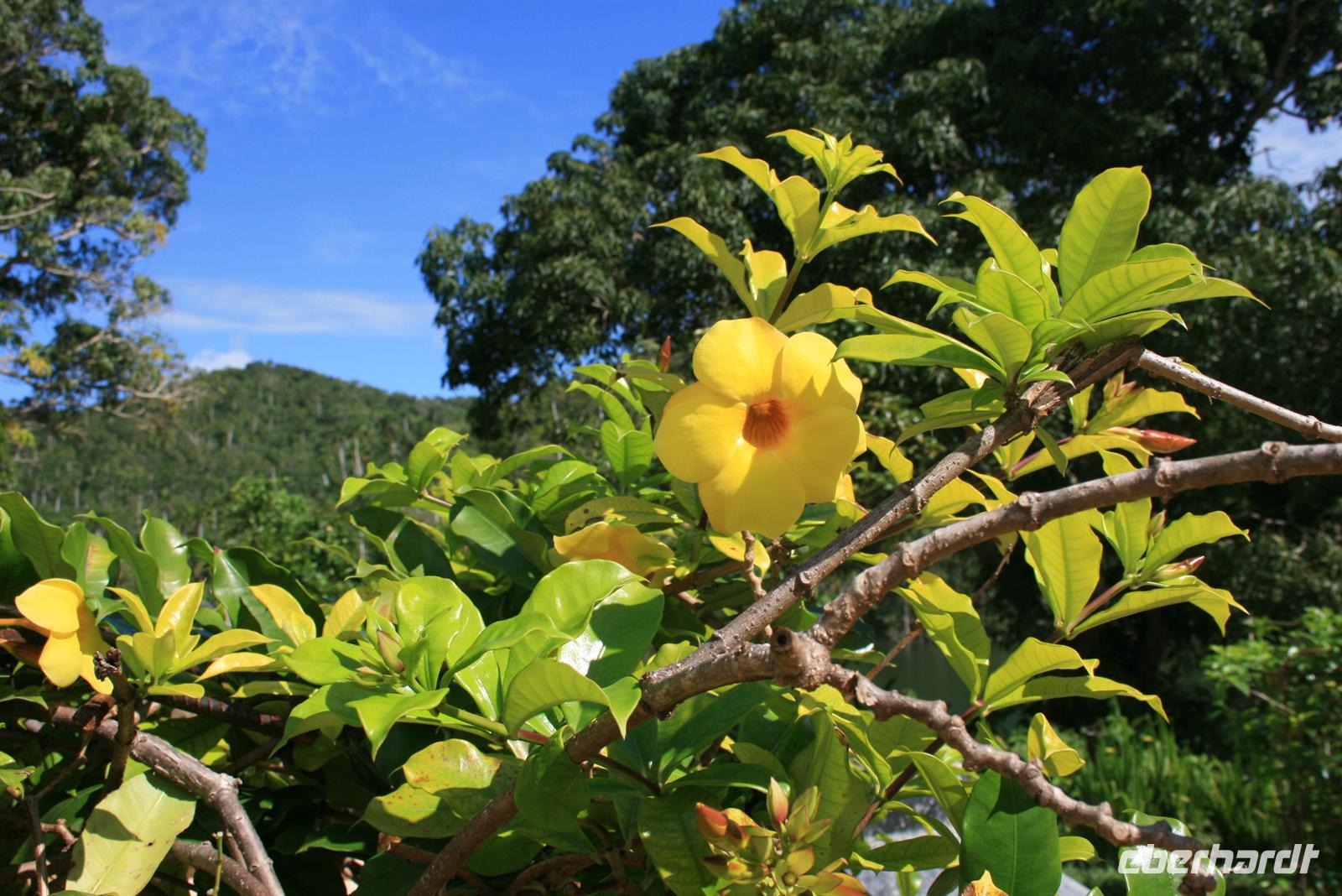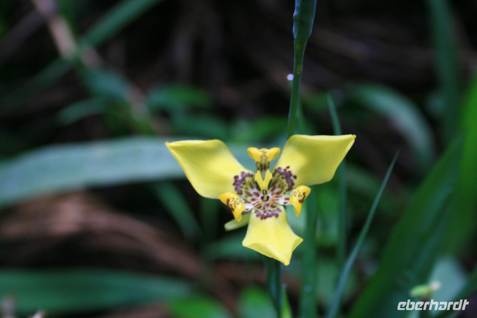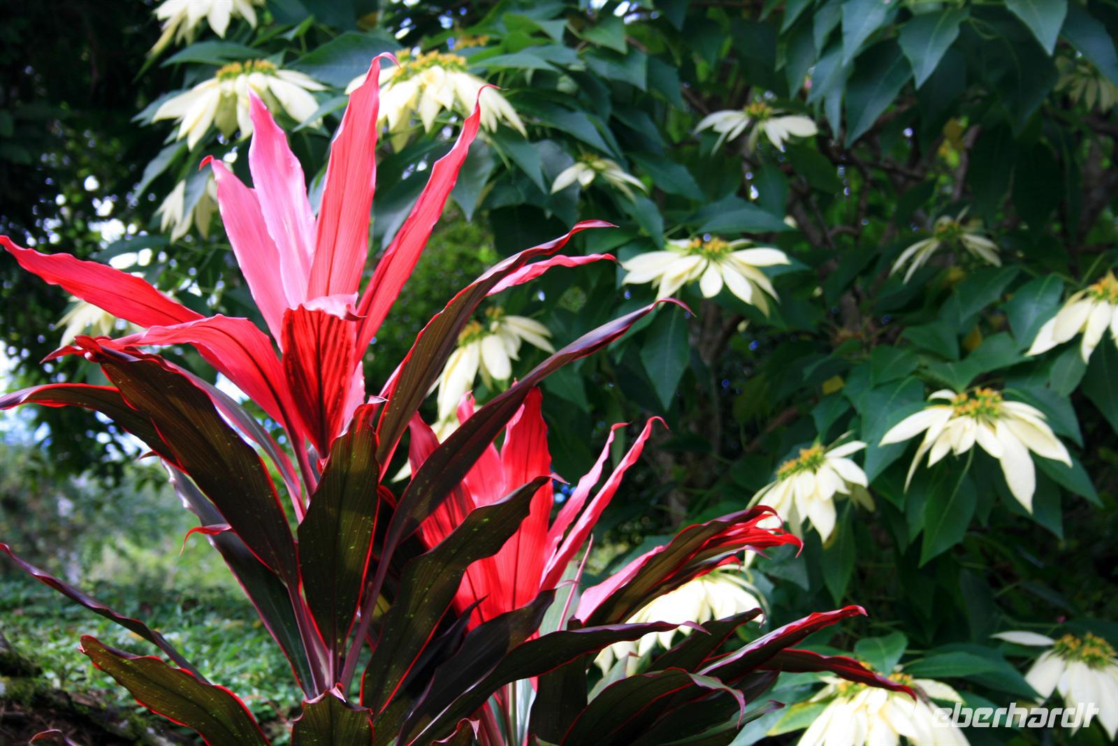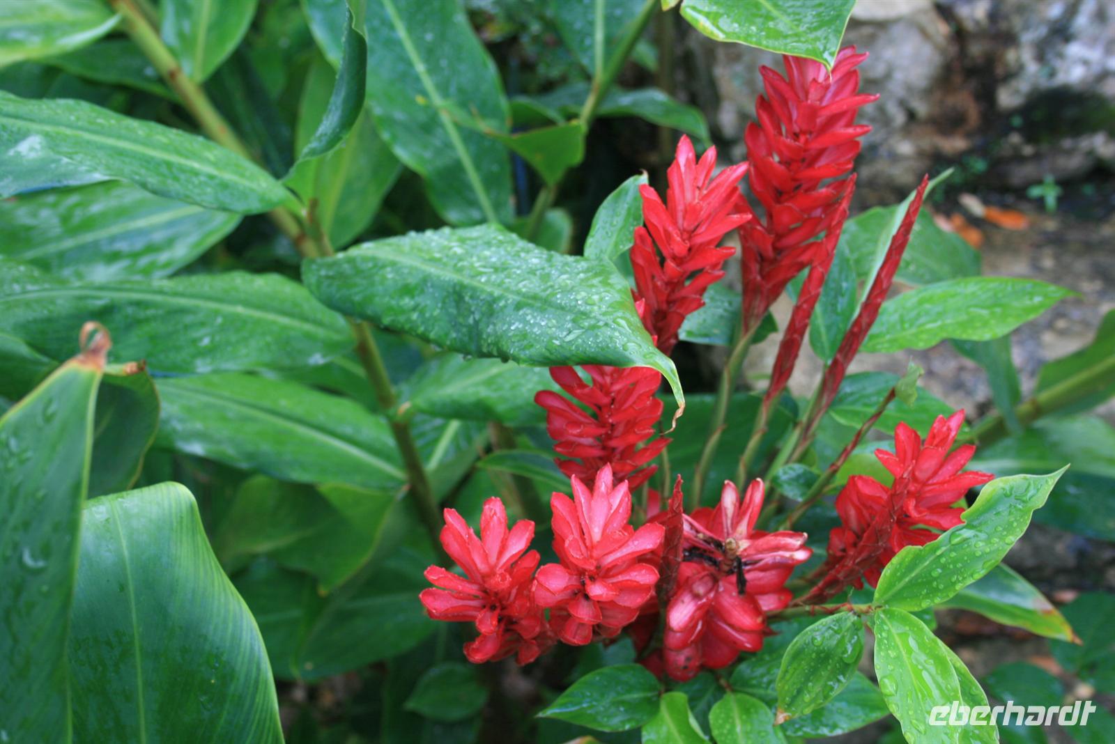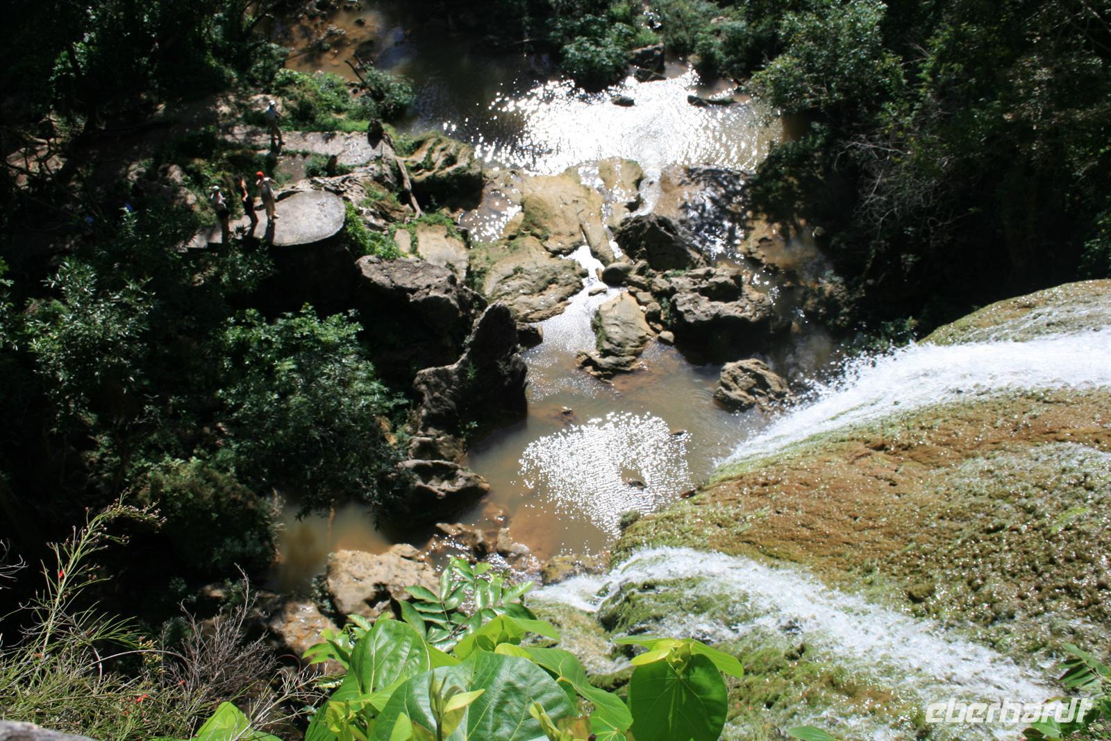 Mit unserem Naturführer und George wandern wir auf schmalen Wegen und Pfaden, entlang des Rio Melodioso und über Holzstege im Naturschutzgebiet in der Sierra del Escambray. Wir sehen endemische Pflanzen, exotische Früchte, Weihnachtssterne, Termitenbauten und Orchideen. Nach reichlich einer Stunde gelangen wir an einem Naturwasserbecken an, an dem wir Rast machen. Hier gibt es auch einen kleinen Kiosk, an dem man Getränke kaufen kann.