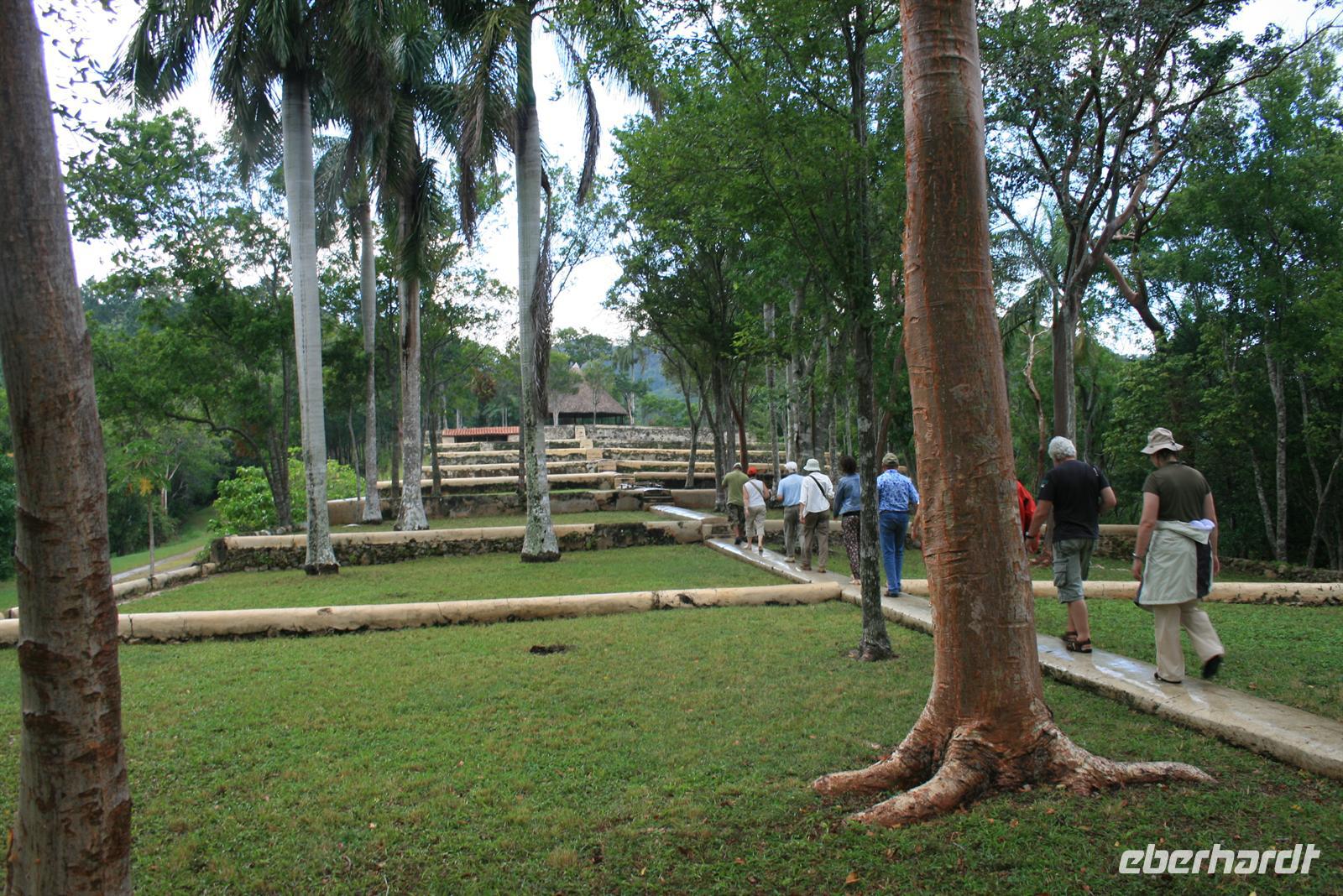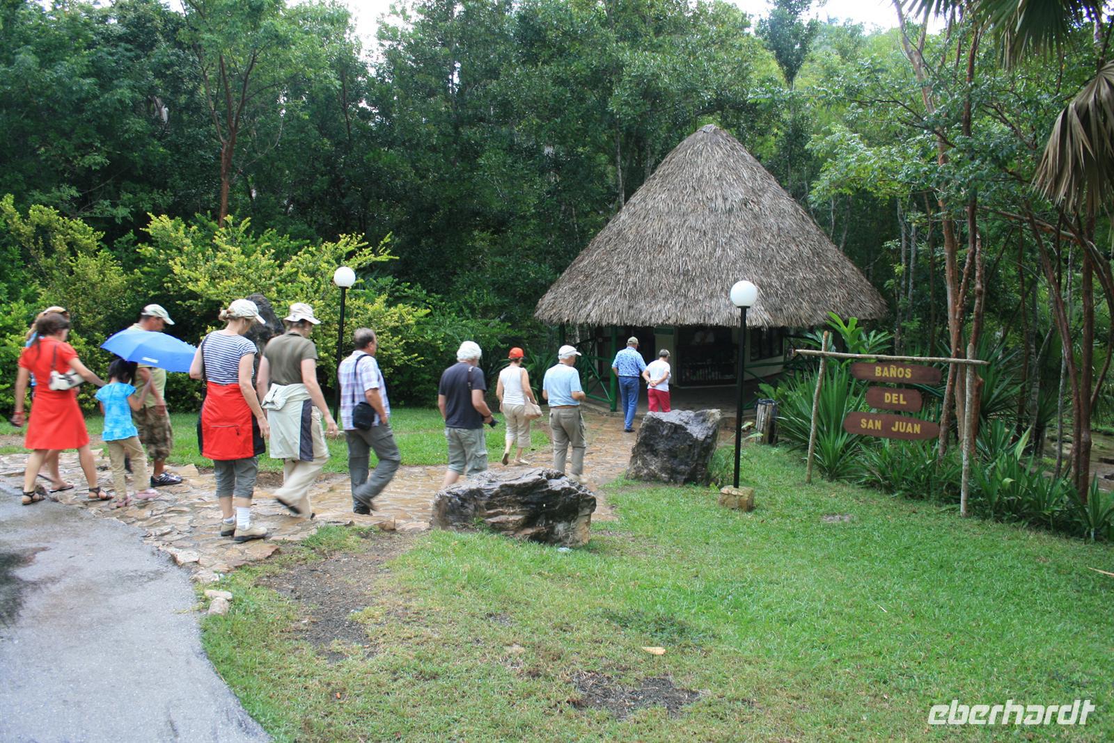 Als Palenque wurden damals die Zufluchtsorte für die entflohenen afrikanischen Sklaven bezeichnet. Sie suchten in den Höhlen des Karstgebirges Zuflucht. Wieder wird ein creolisches Menü serviert. Es gibt frische Papaya, Ananas, Grapefruit, Gurken, Kohl und Tomaten sowie Hühnchenfleisch, Reis mit gebratener Wurst, Kartoffeln und als Nachspeise die in Kuba beliebte Kombination aus Käse und süßer Guavenpaste. Das typische Getränk ist ein frischer Orangensaft mit Honig und natürlich Rum. Nach dem Essen spazieren wir durch eine der Höhlen zurück zum Bus. Dabei führen uns ein paar Afrikaner einen traditionellen Tanz vor.
