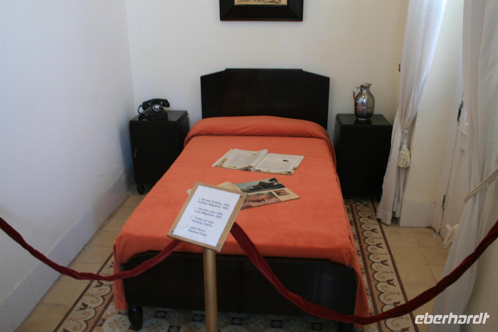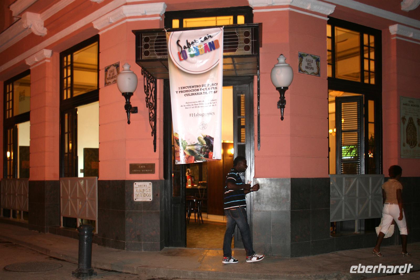 Erst gegen 20.00 Uhr sind wir fertig mit den Formalitäten und verlassen 20.20 Uhr den Flughafen in die Innenstadt zu unserem Hotel "Ambos Mundos", in dem bereits Ernest Hemingway wohnte. Da das Hotel in einer Fußgängerzone liegt, müssen wir mit unseren Koffern ca. 300 Meter über Kopfsteinpflaster bis zum Hotel laufen. Hier gibt es einen Begrüßungsdrink und Reiseleiter Georg checkt uns ein. Wir verabreden uns noch einmal, um auf der Dachterrasse des Hotels noch etwas zu trinken. Der erste Mojito wird genossen (ein Cocktail kostet nur 3 CUC)! Gegen 23.00 Uhr verabschieden wir uns bis morgen.