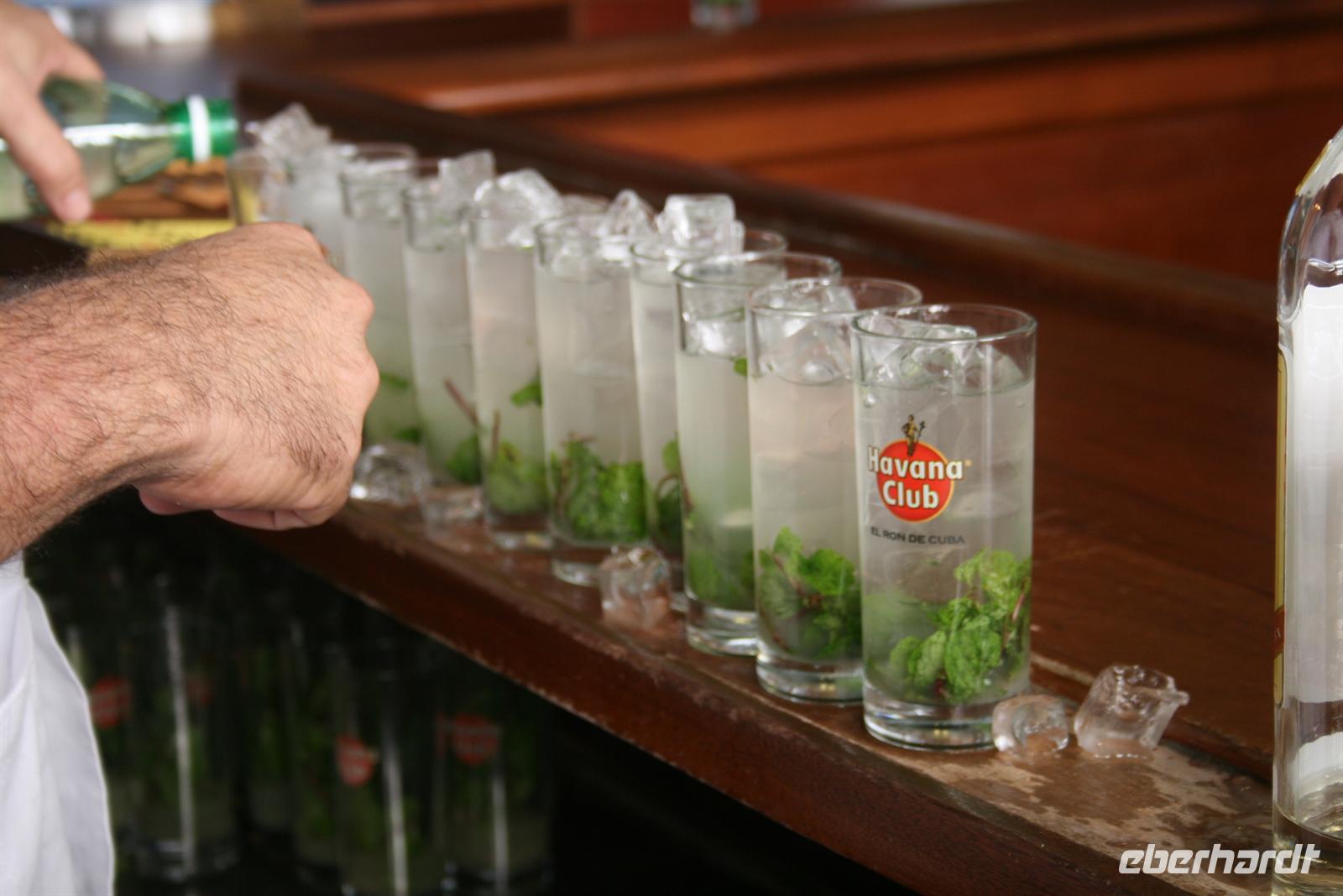 Danach verkosten wir den besten, siebenjährigen Rum, den es hier gibt du können im Geschäft auch selbst Rum aller Qualitäten kaufen. Fast alle von uns kaufen ein bis zwei Flaschen. In der Havana Club Bar gibt es schließlich für jeden noch einen leckeren Mojito. Die Bardame zeigt uns auch die richtige Zubereitung dieses Cocktails für zu Hause. Es ist gar nicht schwer! Gut angeheitert geht es weiter mit unserer Stadtrundfahrt. Wir besuchen den größten und schönsten Friedhof Kubas, den „Cementario de Colon“, der nach Kolumbus benannt wurde. Hier tritt gerade eine Militärkapelle auf und wir bewundern die weißen Marmorgräber, Statuen und Kapellen. Zum Mittagessen fahren wir etwas außerhalb der Stadt in ein für sein gutes Essen bekanntes Lokal. Wie üblich gibt es Salat und Hühnchen mit Reis, zum Nachtisch Eis. Besonders gut kommen hier die schwarzen Bohnen an, die es zum Reis dazu gibt. Allen schmeckt es sehr gut.