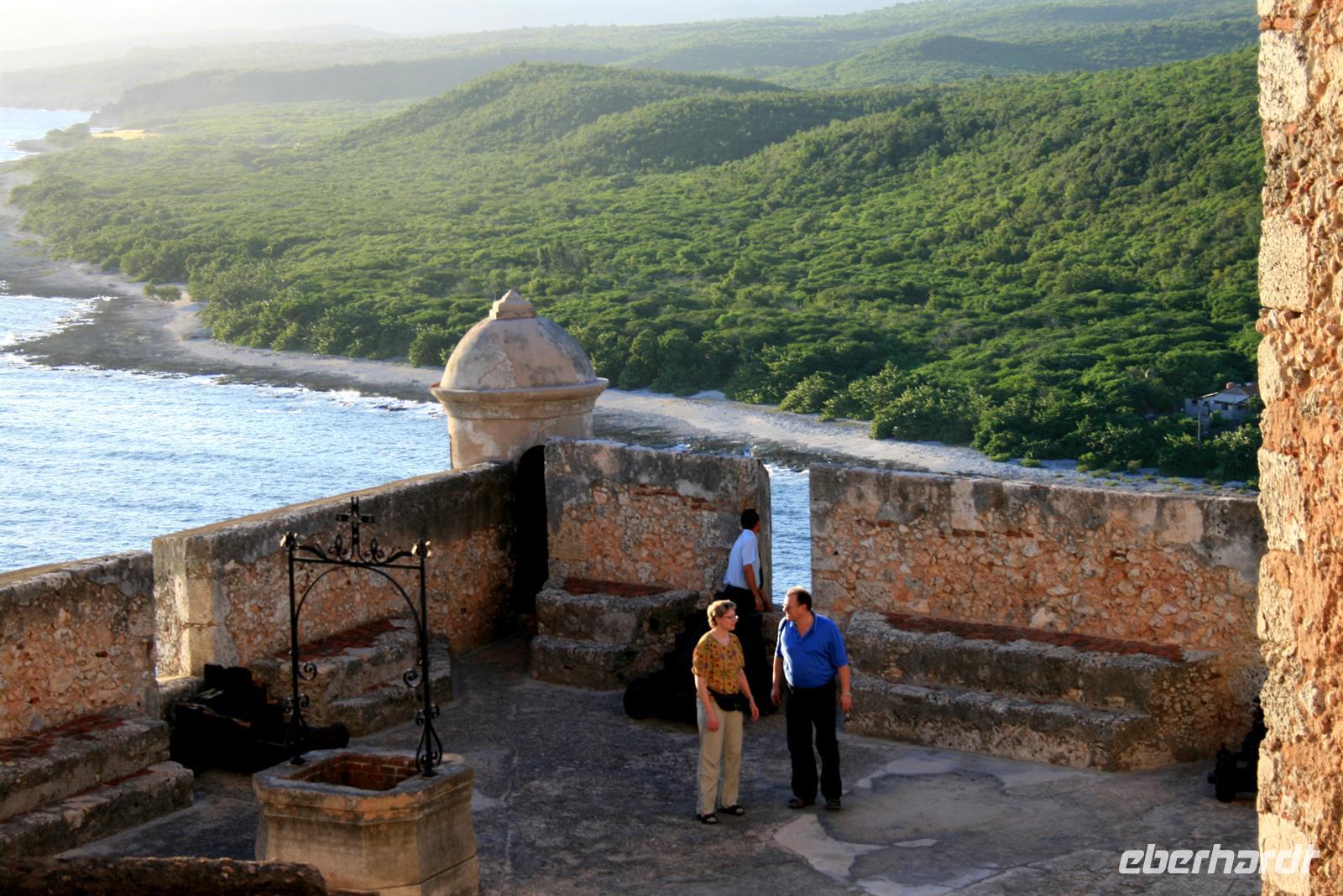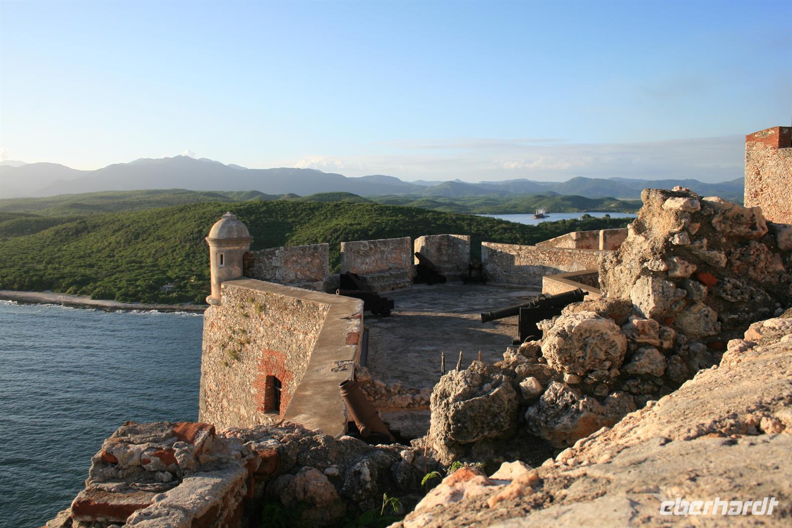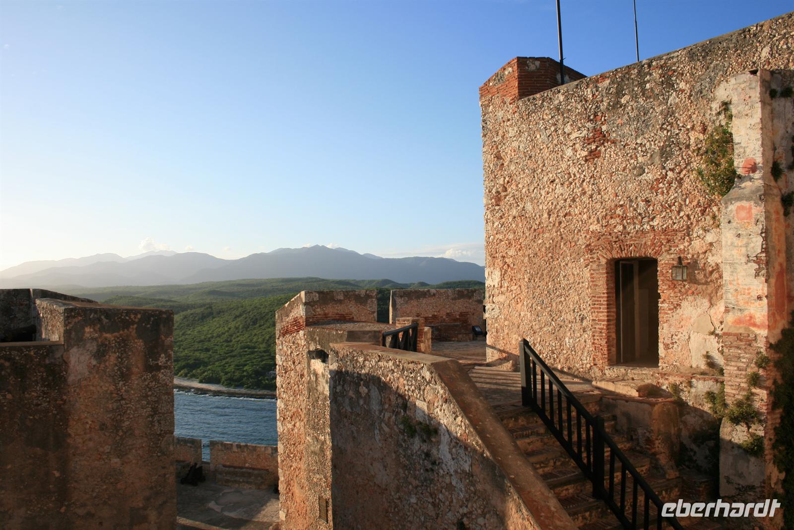 Gegen 16.00 Uhr geht unsere Besichtigungstour mit dem Bus weiter. Wir fahren zur Festung El Morro an der karibischen Küste. Wir schauen uns die Festung von innen an. Man hat von hier oben herrliche Ausblicke auf die Bucht von Santiago, auf die Hafeneinfahrt und die vorgelagerten Inseln. Die Abendsonne taucht die Landschaft und die Festungsmauern in ein wunderbar warmes Licht.