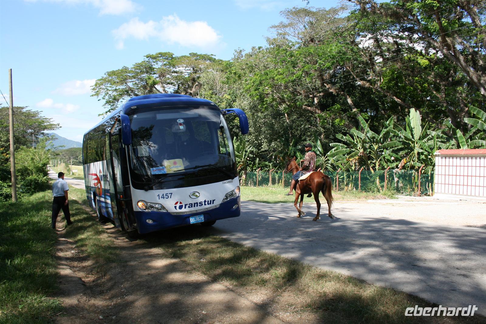 Um 13.00 Uhr kommen wir am kleinen Flughafen von Santiago de Cuba an. Draußen wartet schon unser Busfahrer Louis, der uns nun die ganze Reise über fährt. Wir haben einen modernen kleinen Reisebus mit etwa 20 Sitzplätzen. Das Gepäck wird unten in den Gepäckraum verladen. Wir fahren ca. 20 Minuten ins Zentrum von Santiago und kehren zum Mittagessen in ein typisches Restaurant ein.