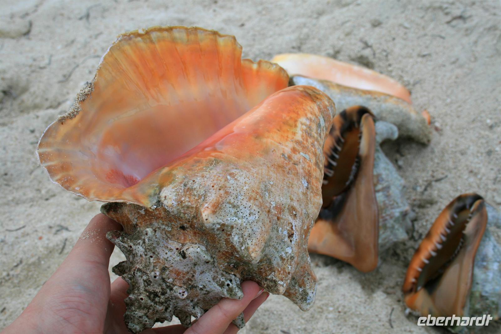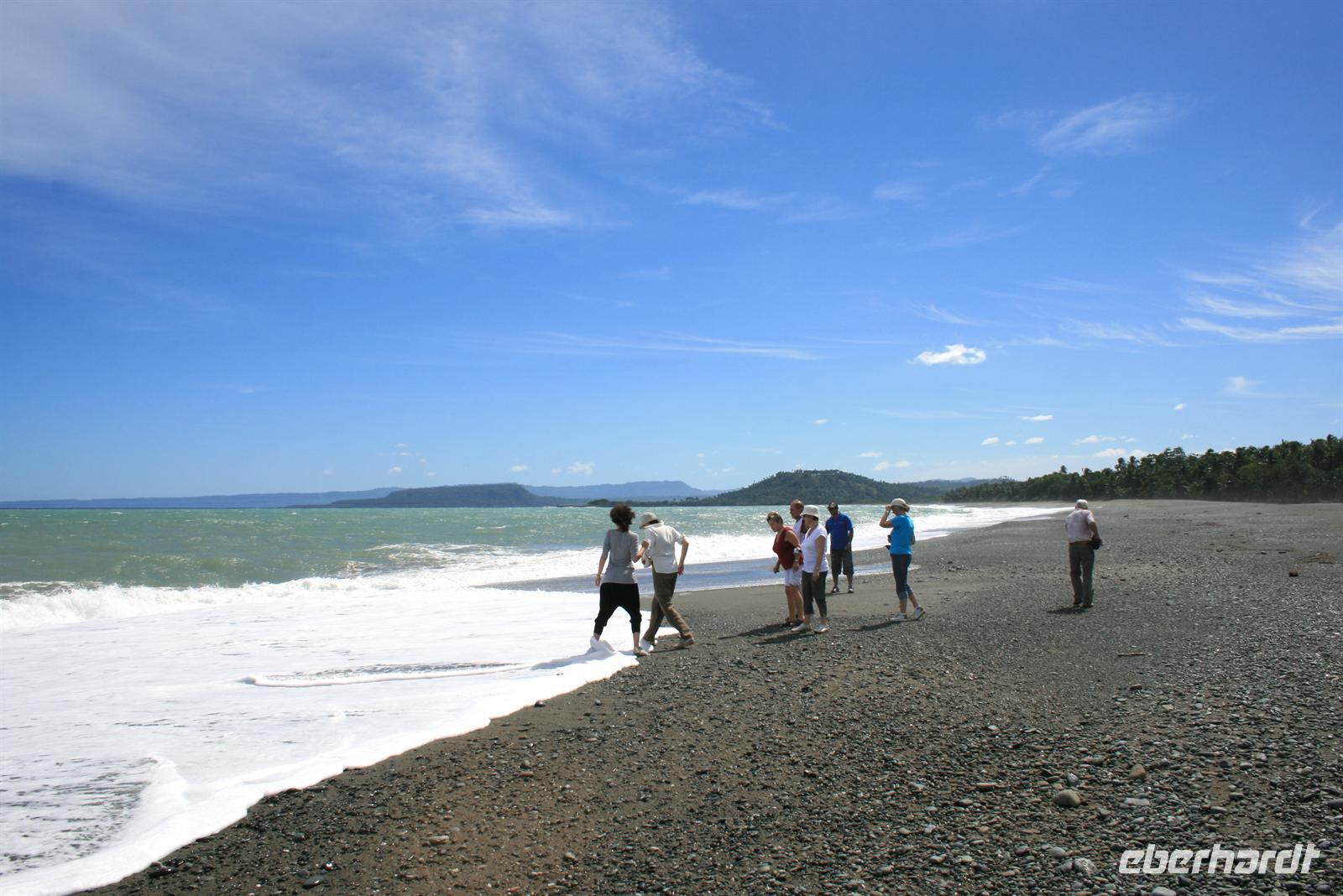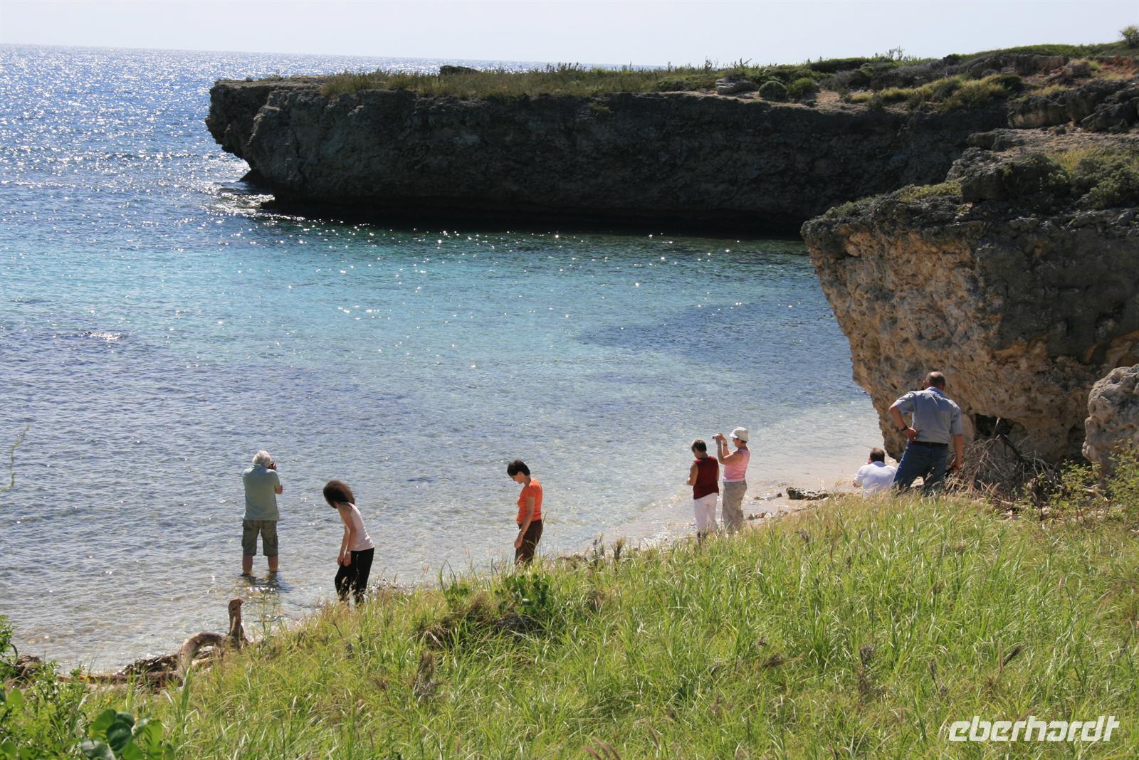 Zum Mittag überrascht uns Georg mit einem kleinen Picknick direkt an der Küste des Karibischen Meeres. Wir gehen mit den Füßen ins Wasser, es ist etwa 25°C warm! Frau Hauff findet eine riesige Muschel, die halb im Sand begraben ist. Wow! Leider ist es verboten, Muscheln auszuführen, aber ein paar Beweisfotos mit dem "Riesending" müssen sein. Zum ersten Mal spüren wir das Karibik-Feeling. Die schönste und spektakulärste Strecke liegt nun vor uns.