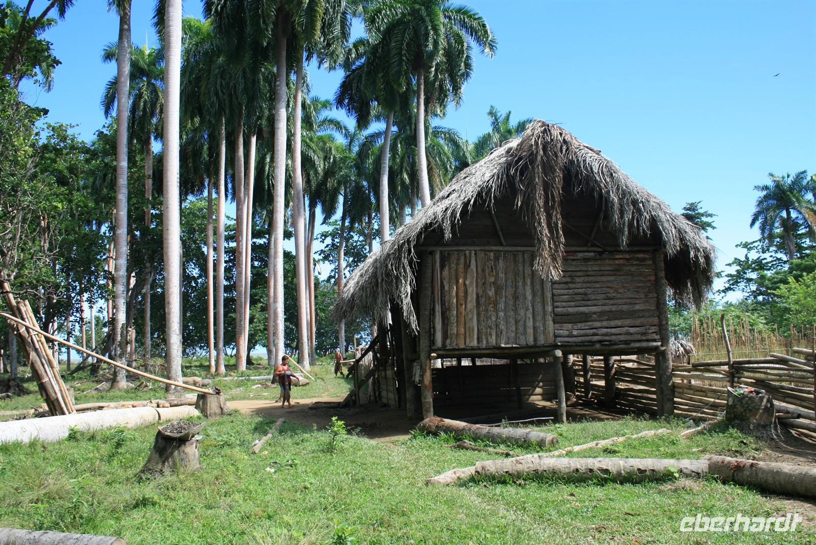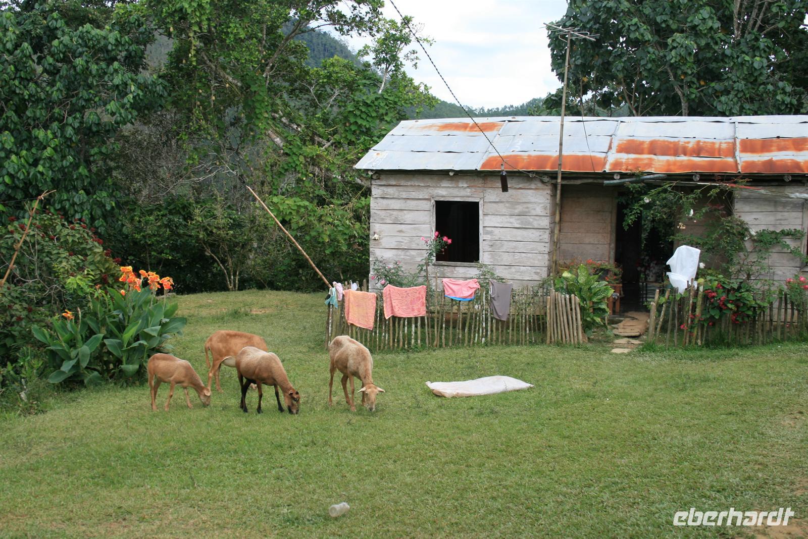 Nach dem Frühstück im Hotel starten wir um 9.00 Uhr zu unserem Tagesausflug in die Natur Ostkubas. Vorbei an der Schokoladenfabrik Baracoas fahren wir zu einer kleinen Lodge mit Bar und Restaurant mitten im Regenwald und weiter zum Fluss Toa. Hier erwartet uns ein örtlicher Naturführer zu einer Wanderung durch den Regenwald, entlang des Flussufers bis zur Atlantikküste. Unterwegs besuchen wir eine Kokosplantage. Hier holen uns ein paar Männer die frischen Kokosnüsse direkt vom Baum und wir kosten die frische Kokosmilch. Auch ein paar Souvenirs wie Armbänder und Ketten aus Naturmaterial sowie Kakaobuttercreme können wir sehr günstig kaufen. Wir kommen auch an ein paar Bauernhäusern vorbei, in denen die Bauern mit ihren Tieren auf sehr einfache Weise leben.