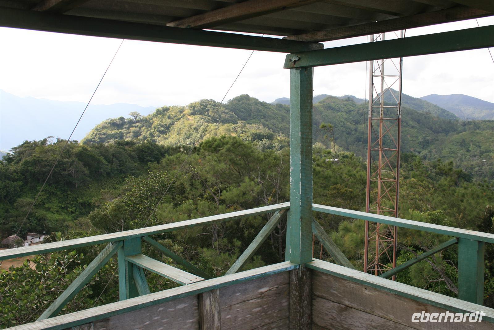 Wir fahren die Panoramastraße La Farola über die Sierra Maestra. Es geht bis zu 700 Meter hoch. Die Landschaft ist atemberaubend! Berge und Täler mit immergrünem Regenwald, die durch Flüsse durchzogen werden, dazu der blaue Himmel und die weißen Schäfchenwolken. Es ergeben sich fantastische Ausblicke auf eine vergessen scheinende Welt. Um 14.30 Uhr erreichen wir die höchste Stelle „Alto de Cotilla“. Hier steigen wir Treppen und einen Holzturm hinauf, um die Aussicht von ganz oben zu genießen. Die Temperaturen hier im Gebirge sind etwas kühler als am Meer, aber dennoch um die 30°C und eine sehr hohe Luftfeuchte.
