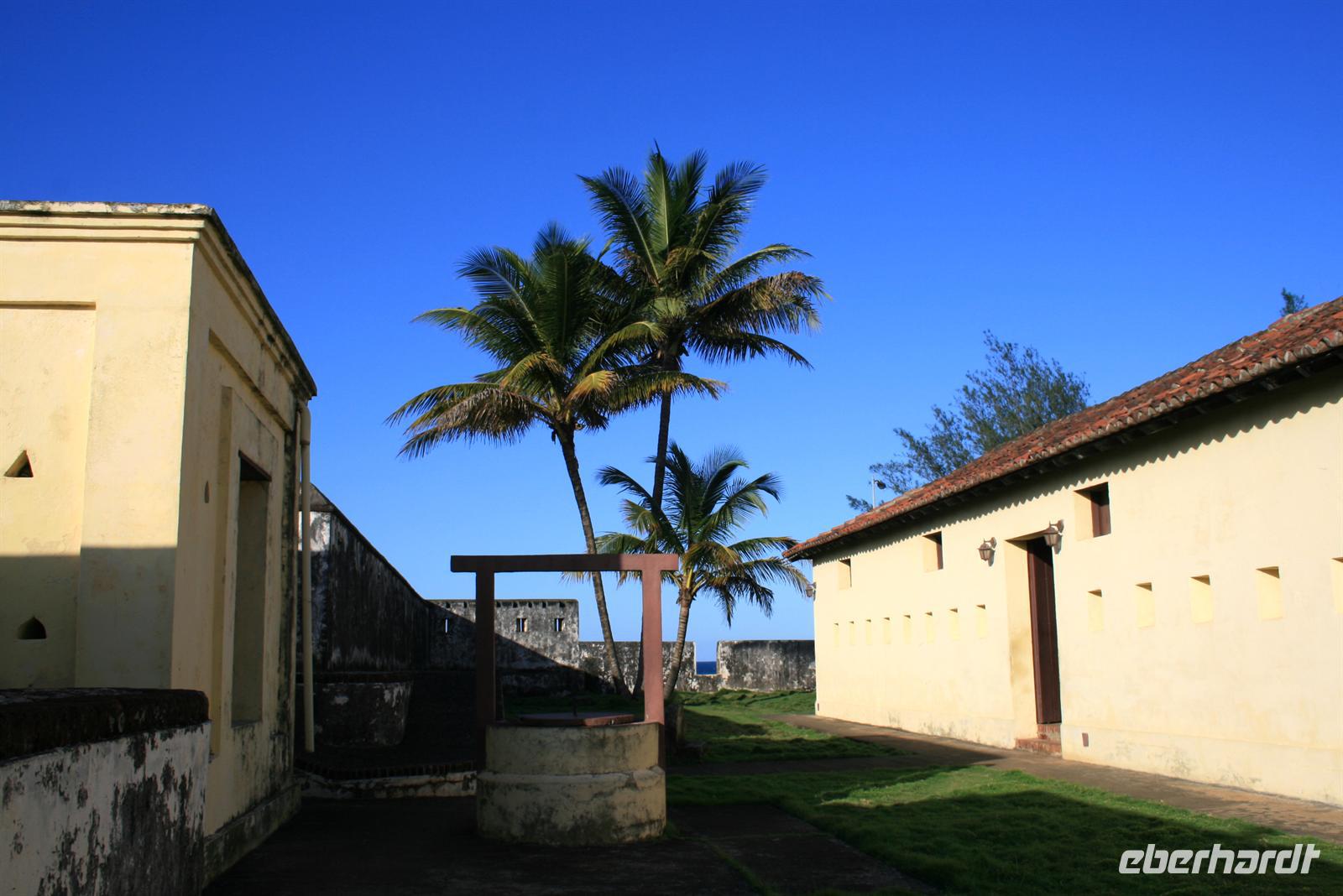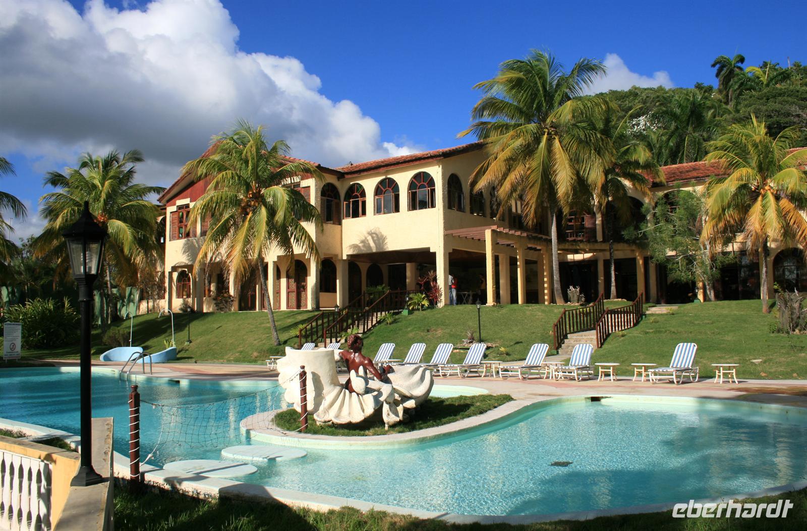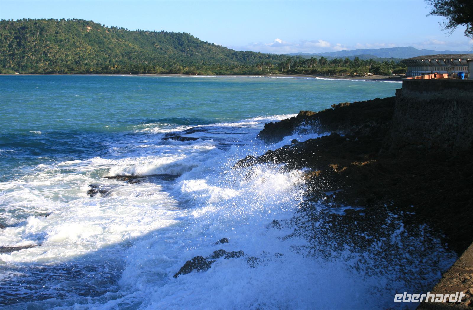 Gegen 17.00 Uhr erreichen wir unser Hotel "Porto Santo", das direkt an der atlantischen Küste und der Bucht von Baracoa liegt. Wir werden mit einem Cuba Libre begrüßt. Es ist eine sehr schöne, moderne Hotelanlage mit Haupthaus und mehreren Wohngebäuden unter Palmen. Es gibt eine schöne Pool-Anlage mit Bar und einen hoteleigenen kleinen Strand. Die Zimmer sind sehr groß und ausgestattet mit Dusche/WC, TV, Telefon, Klimaanlage, Zimmersafe. Jedes Zimmer hat einen eigenen kleinen Balkon oder Terrasse. Bisher ist es das schönste Hotel! Auch die Gäste sind begeistert. Wir treffen uns um 19.00 Uhr in der Lobby, um mit dem Bus zu unserem Abendessen im alten Castillo nach Baracoa zu fahren. Heute ist die alte Festung ein Hotel und bietet einen schönen Blick über die Bucht von Baracoa.