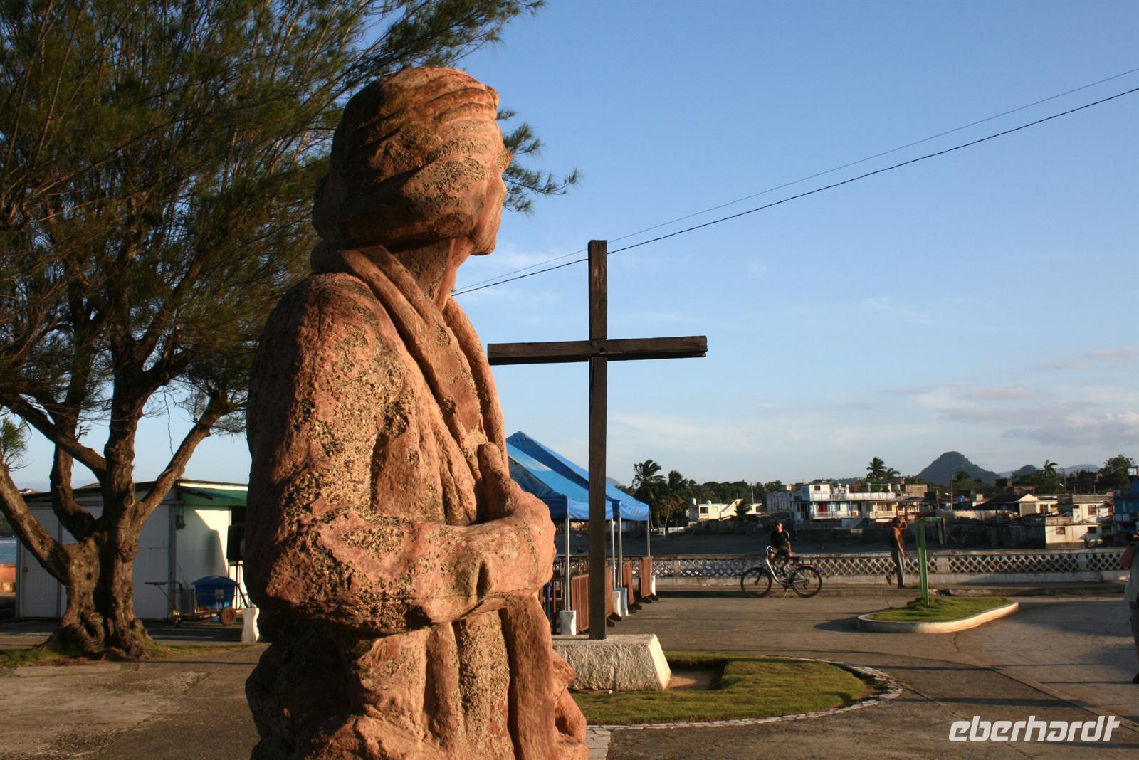 Dann fahren wir auf der anderen Seite des Gebirges hinunter bis nach Baracoa, die erste Stadt, die von den spanischen Eroberern auf Kuba gegründet wurde. Hier besuchen wir das kleine Stadtmuseum in einer ehemaligen Festung. Eine örtliche Führerin erklärt uns die Exponate und Georg übersetzt ins Deutsche. Wir bestaunen Bilder der hier ansässigen präkolumbischen Indianer. Sie rauchten damals schon Tabak, allerdings durch die Nase, bauten Boote und hatten eigene Beerdigungsrituale. Außerdem sehen wir alte Pläne der Stadt Baracoa und Auszüge auch dem Tagebuch von Christoph Kolumbus. An der Küstenpromenade stehen ein Kolumbus-Denkmal und ein großes Holzkreuz zur Erinnerung an die Entdeckung Kubas am 27.12.1492. Wir sehen das Hotel der russischen Zarin, in dem schon viele berühmte Persönlichkeiten wie Fidel Castro und Che Guevara zu Gast waren, und den großen Tafelberg, der Kolumbus schon als Landmarke diente.