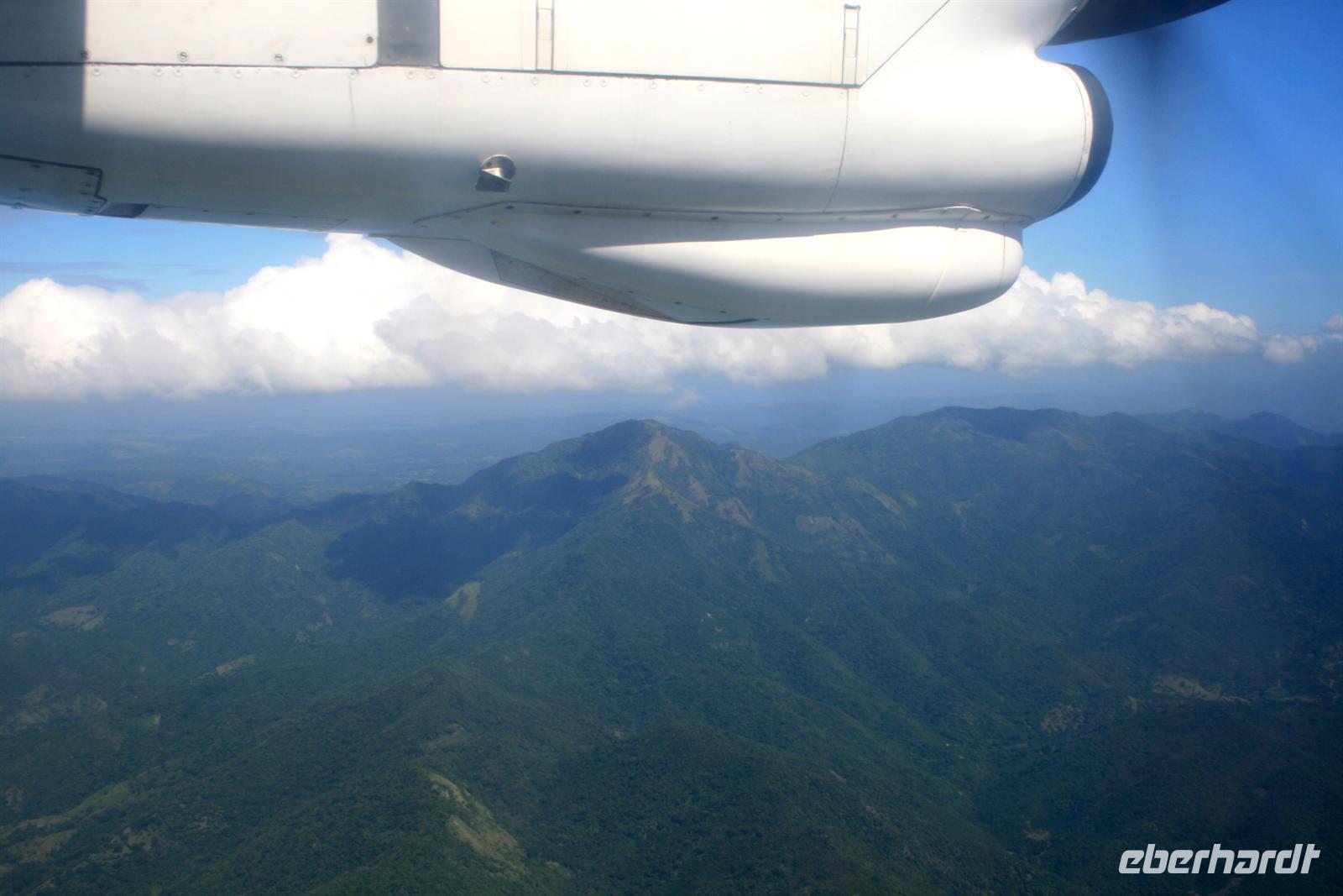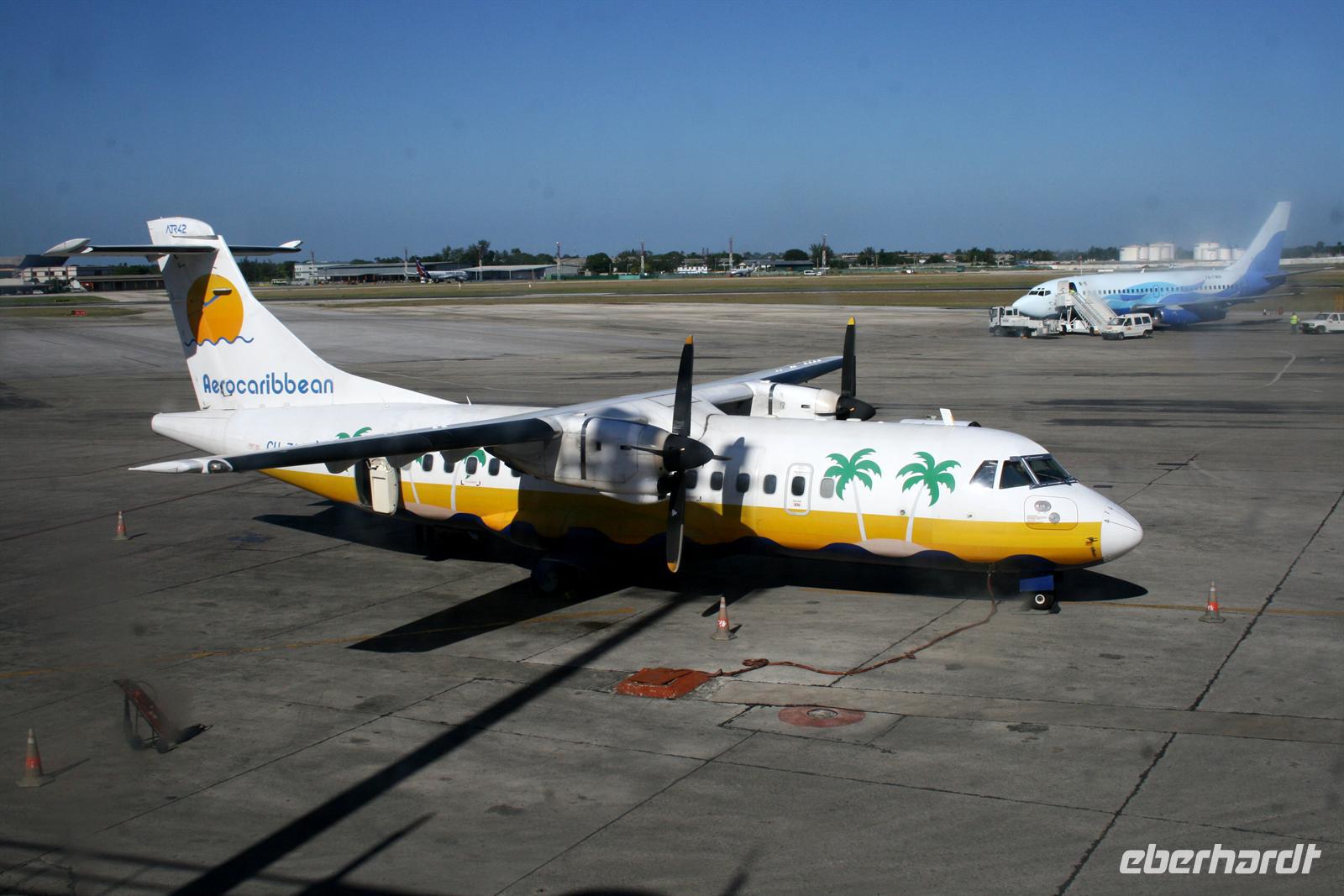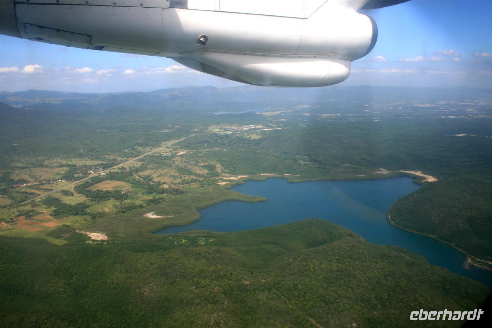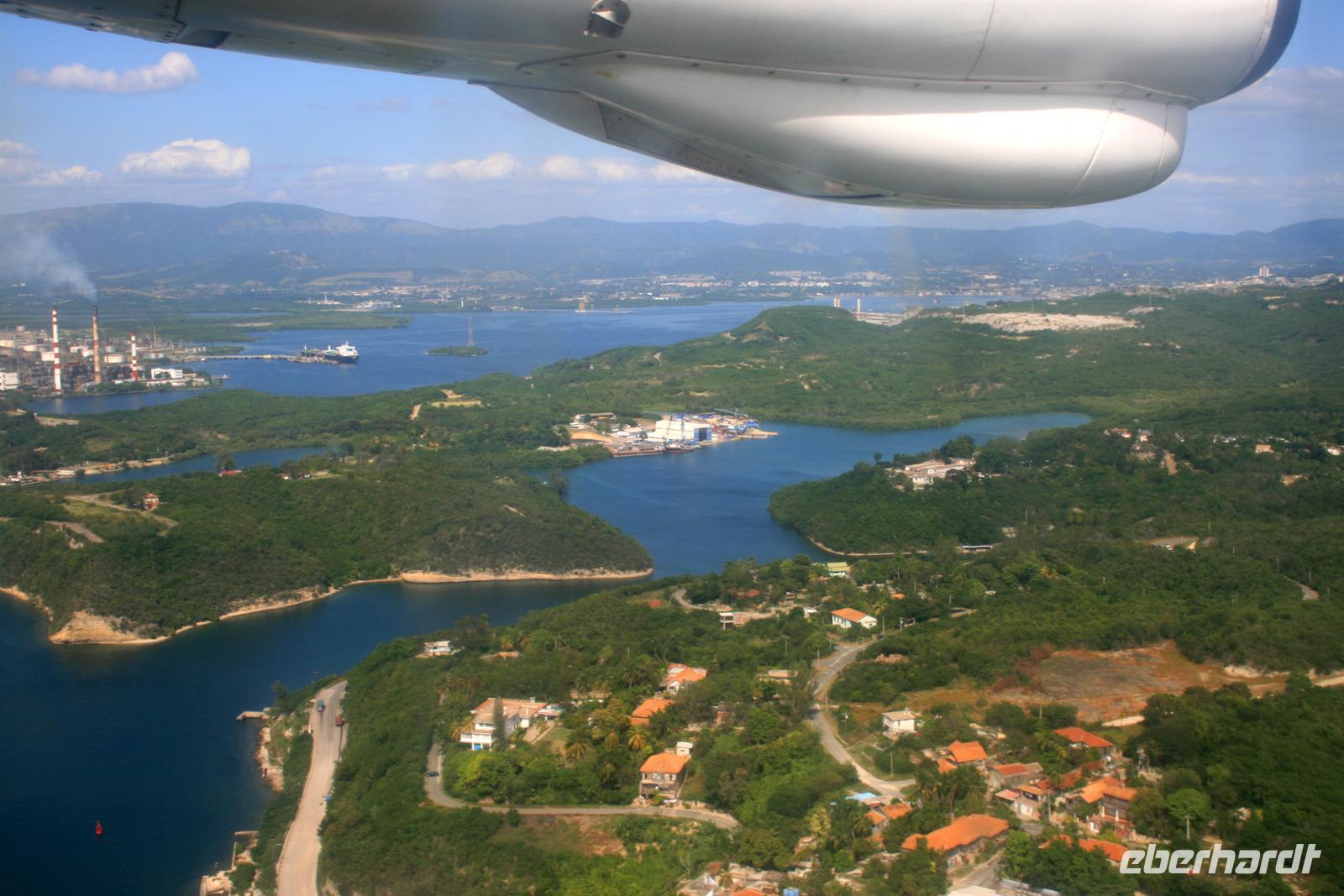Der CheckIn für den Flug mit Aero Caribbean dauert ziemlich lange, da die Mitarbeiter nur sehr langsame Computertechnik haben. Die Kubaner lassen sich nicht aus der Ruhe bringen. Zum Glück sind wir 2 Stunden vor Abflug am Flughafen. Wir geben zusammen mit Georg das Gepäck auf, danach folgt die Passkontrolle und vor dem Transitbereich die Handgepäckkontrolle. Verboten sind hier wie immer Waffen und spitze Gegenstände aus Metall, aber auch Regenschirme. Getränkeflaschen aus Plastik dürfen mitgenommen werden. Im Transitbereich gibt es eine Cafeteria, wo man Kaffee trinken kann oder sich Wasser und andere kalte Getränke kaufen kann. Gegen 11.00 Uhr beginnt unser zweistündiger Flug mit einer Propellermaschine, in die etwa 50 Passagiere passen. Es gibt sogar einen Bordservice, der in der Hälfte der Flugzeit Wasser und Kaffee serviert. Das Schöne an dem kleinen Flugzeug ist, dass wir nicht so hoch fliegen und Kuba gut von oben sehen können. Die Maschine ist etwas lauter als gewohnt, wirkt aber sonst keineswegs unsicher. Der Flug und die Landung verlaufen sehr ruhig.