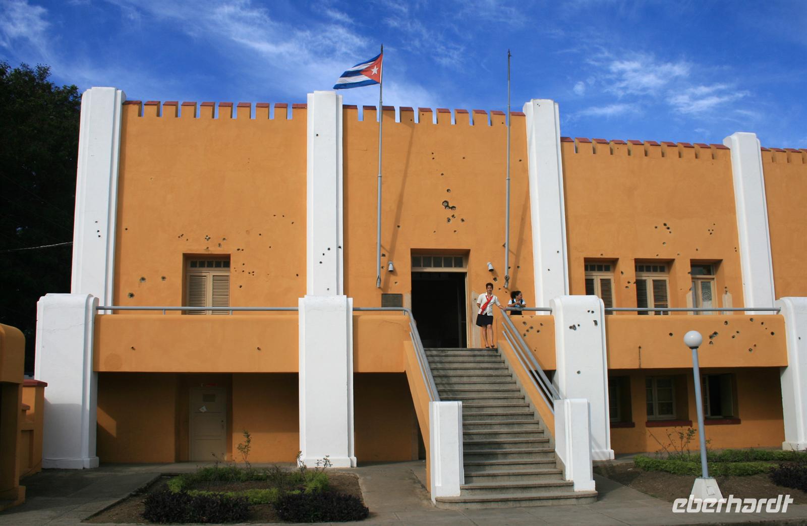 Einige Sehenswürdigkeiten Santiago de Cubas haben wir noch nicht besucht. Diese stehen heute auf unserem Reiseprogramm. Unser erstes Ziel ist die geschichtsträchtige Moncada-Kaserne, die zu Beginn der Revolution von Fidel Castro und seinen Männern gestürmt werden sollte. Die Moncada-Kaserne beherbergt heute ein Museum und eine Schule. Noch immer sieht man die Einschusslöcher von damals am Eingangsbereich zum Museum.