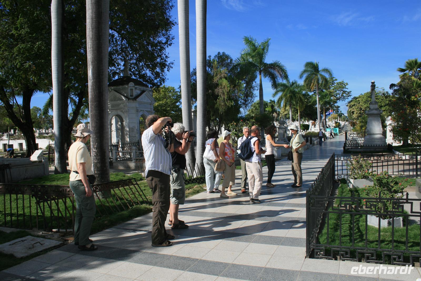 Sehenswert ist auch der Friedhof Santiago de Cubas, der Cementerio de Santa Ifigenia, den wir nun besuchen. Hier liegen sehr viele berühmte Persönlichkeiten aus Wirtschaft, Kultur und Politik Kubas begraben. Das berühmteste Grab ist das des kubanischen Nationalhelden Jose Marti. Jede Stunde wird hier übrigens eine Wachablösung durchgeführt. Zu pathetischer Musik marschieren die Wachsoldaten zur Ruhestätte des Dichters und Volkshelden. Neben Jose Marti sind auf dem Cementerio de Santa Ifigenia auch Mitglieder der Familien Bacardi, Bolivar oder Musiker des bekannten Buena Vista Social Clubs begraben. Kunstvolle Marmorstatuen, seltene Bäume und die Ruhe machen außerdem den Reiz dieses Ortes aus.