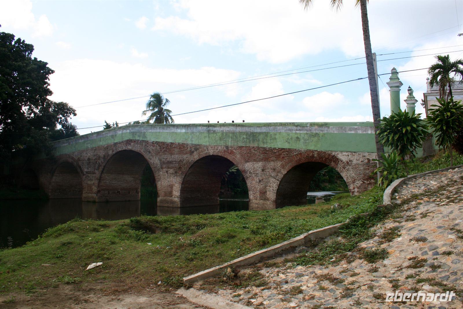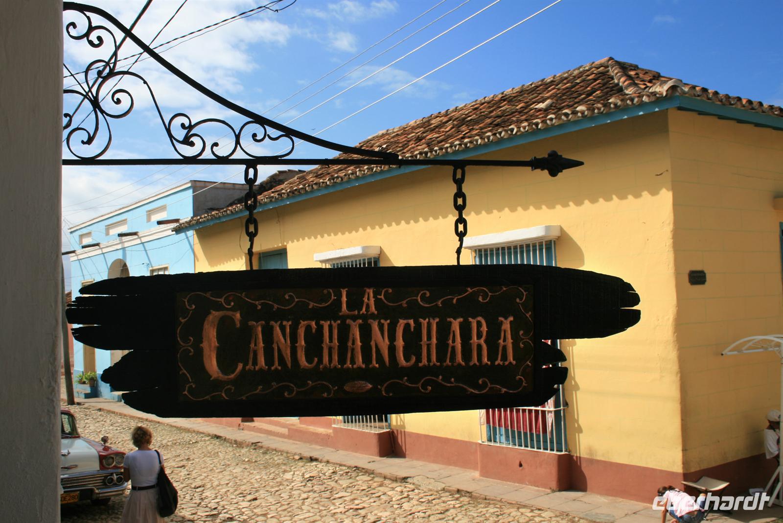 Gegen 10.00 Uhr fahren wir mit dem Bus los in Richtung Westen. Es liegt wieder eine große Fahrtstrecke vor uns. Mit mehreren Zwischenstopps werden wir bis abends unterwegs sein. Um 12.15 Uhr machen wir eine Pause an einer Cocktailbar, in der wir frisch gepresste Fruchtsäfte und Pina Colada genießen. In der kleinen Stadt Sancti Spiritus spazieren wir bis zur großen Bogenbrücke, das Wahrzeichen der Stadt, und kehren zum Mittagessen in ein Restaurant am Hauptplatz ein. Hier gibt es Salat, Bohnensuppe und eine Art Rindergulasch mit Reis. Wer möchte, kann das Getränk des Hauses, Sangria, trinken. Wie gewohnt, spielt hier auch eine Musikgruppe auf, die natürlich ein kleines Trinkgeld erwartet.