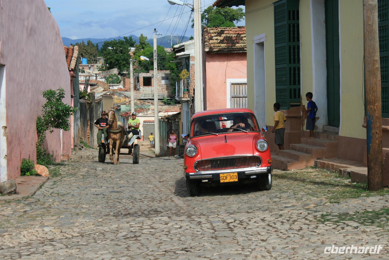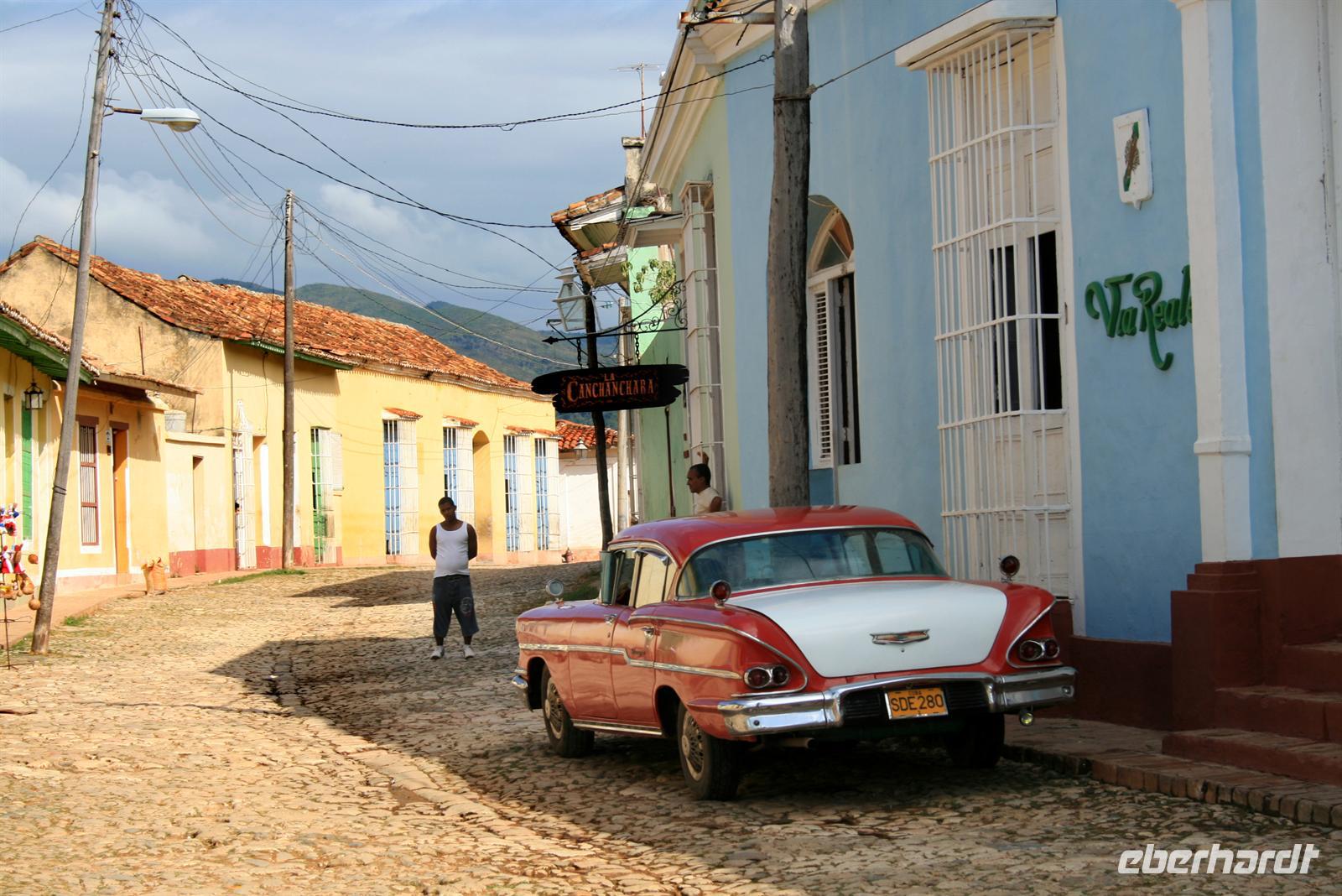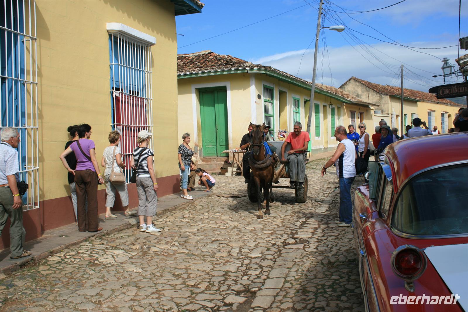Heute unternehmen wir einen Ausflug nach Trinidad. Zunächst fahren wir zu einem Aussichtpunkt, von welchem wir noch einmal sehr schön das Tal der Zuckermühlen sehen. Die Hügel der Sierra del Escambray im Hintergrund. Dann geht es weiter in die Altstadt von Trinidad. Zu Fuß unternehmen wir einen Stadtrundgang. Die kleinen Gassen sind mit Steinen aus Europa gepflastert, die den spanischen Kolonialschiffen früher als Ballast dienten. Die Steine wurden gegen Waren aus Kuba getauscht und pflastern bis heute die Straßen mancher alter Städte. Wir kehren in ein Lokal ein und probieren das typische Getränk der früheren Zuckerplantagen-Arbeiter aus Zitronensaft, Honig und Zuckerrohrschnaps (3 CUC pro Becher).
