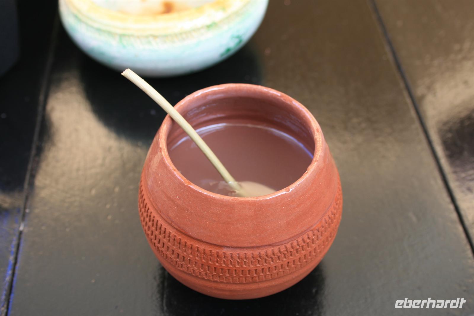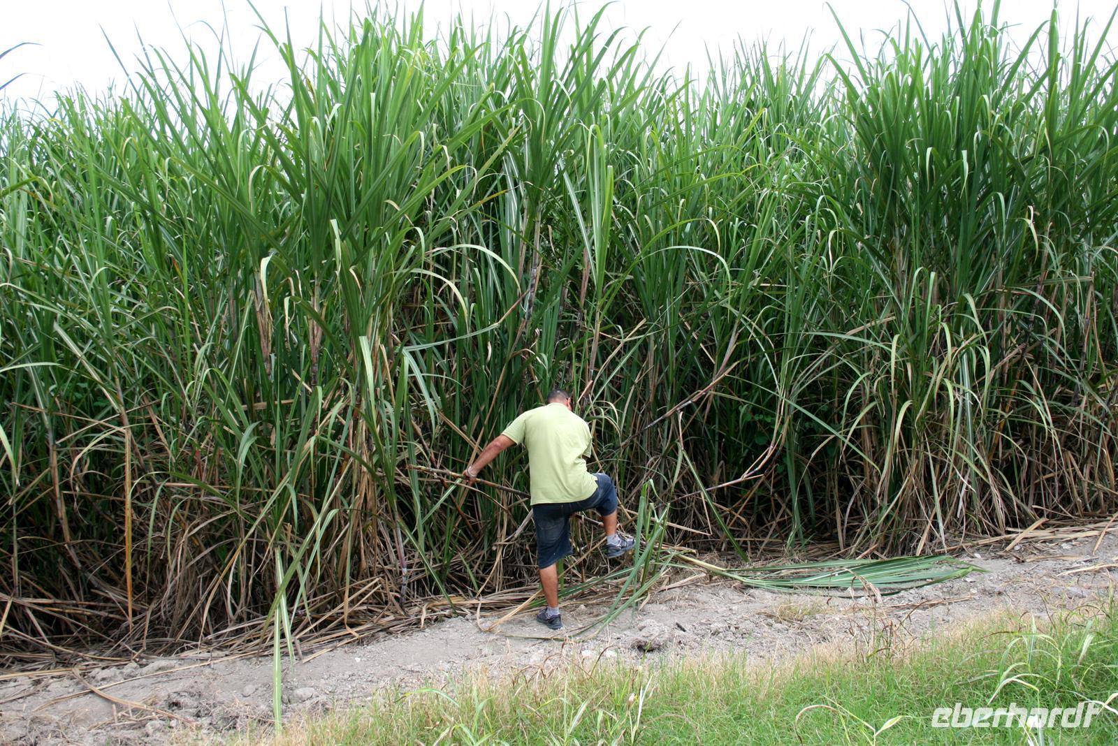 Bei unserer Weiterreise durchqueren wir große Landwirtschaftsgebiete und Zuckerrohrfelder. Wir halten an und Reiseleiter George schneidet eine Zuckerrohrpflanze für uns auf. Wir probieren das süße Fruchtfleisch und den frischen Zuckerrohrsaft.