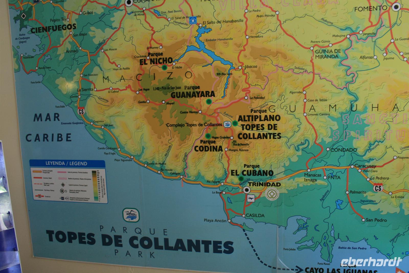 Nach dem letzten Frühstück im Hotelresort „Brisas Trinidad del Mar“ starten wir um 8.30 Uhr unsere weitere Rundreise durch Kuba. Wir befinden uns im mittleren Teil Kubas. Unsere Tagesetappe führt uns wieder in eine der schönsten Berglandschaften Kubas - in die Sierra del Escambray. Von einem Aussichtspunkt an der Strecke überblicken wir die Berge mit dem Subtropischen Regenwald und die Südküste mit dem Karibischen Meer. Nach etwa einer Stunde Busfahrt hinauf ins Gebirge (ca. 800-900 Höhenmeter) erreichen wir den Luftkurort Topes de Collantes. Hier befindet sich eine große Kurklinik, in der Atemwegserkrankungen behandelt werden.