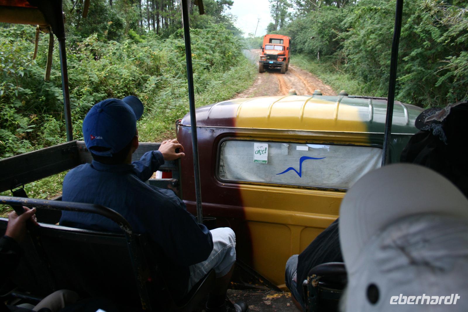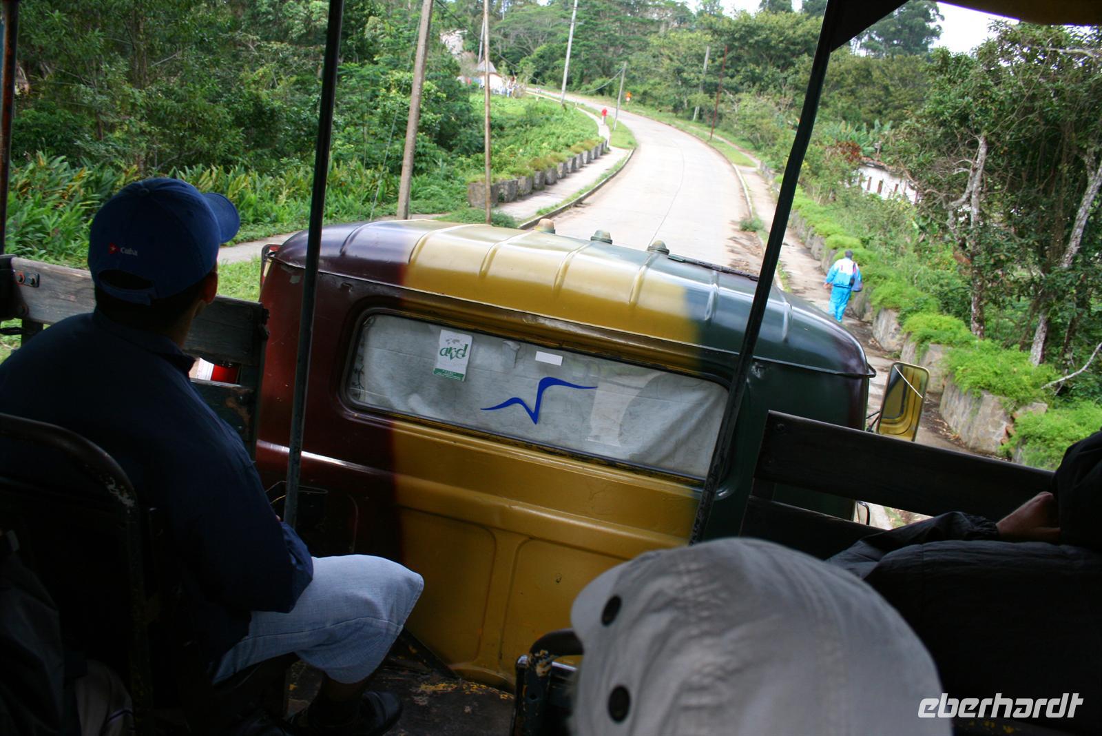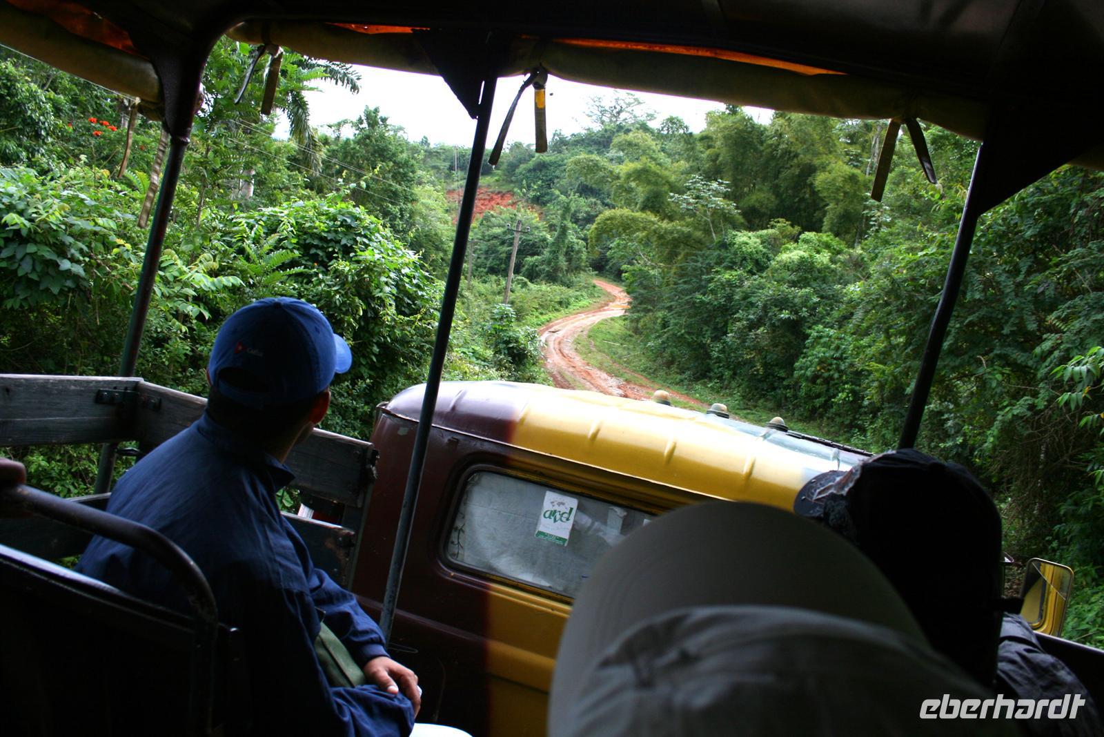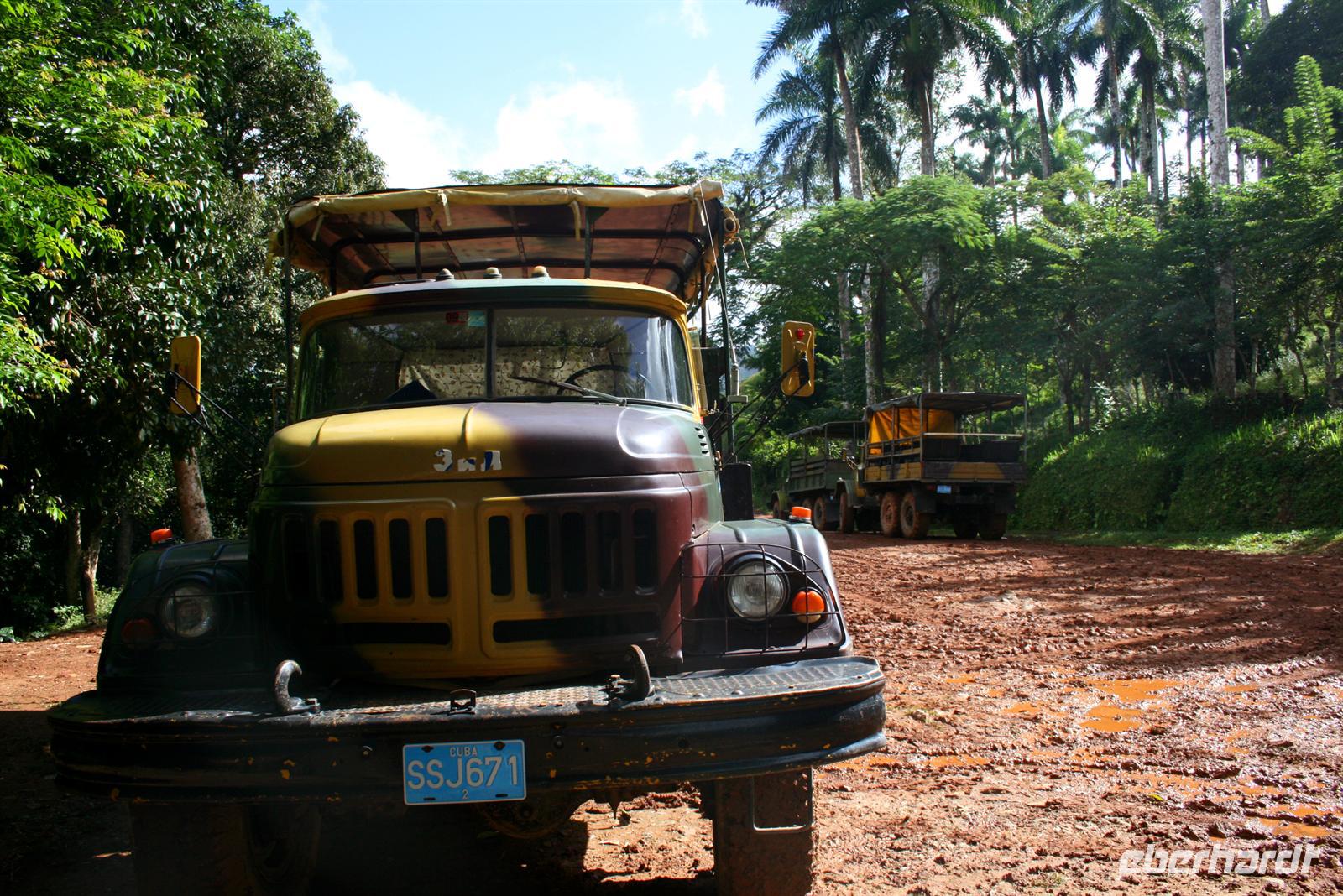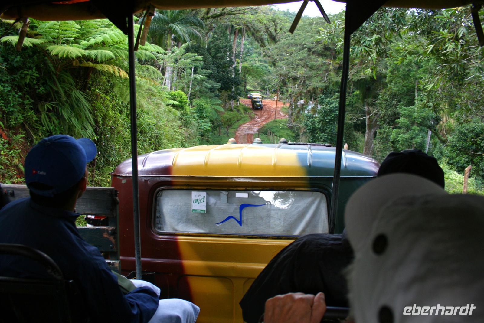 Dann geht es richtig tief hinein in den subtropischen Regenwald der Sierra del Escambray. Mit einem alten russischen Lkw, der über Allradantrieb verfügt, und einem einheimischen Naturführer, fahren wir auf unbefestigten, schlammigen Wegen durch das wunderschöne Bergland. Wir bestaunen einheimische Baumarten, Palmen und farbenfrohe Blütenstauden während wir uns mit viel Spaß auf dem Lkw so richtig durchschütteln lassen. Nach etwa 45 Minuten Fahrt mit der „russischen Limousine“ erreichen wir ein Restaurant inmitten des Waldes, was der Ausgangspunkt unserer Regenwald-Wanderung ist.