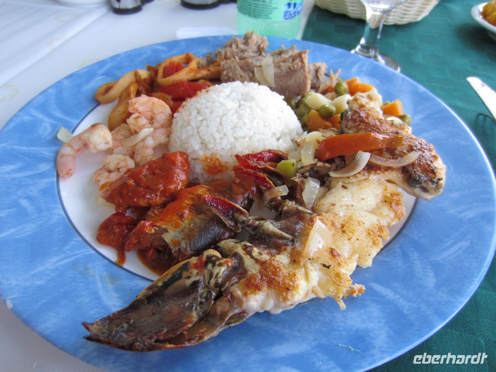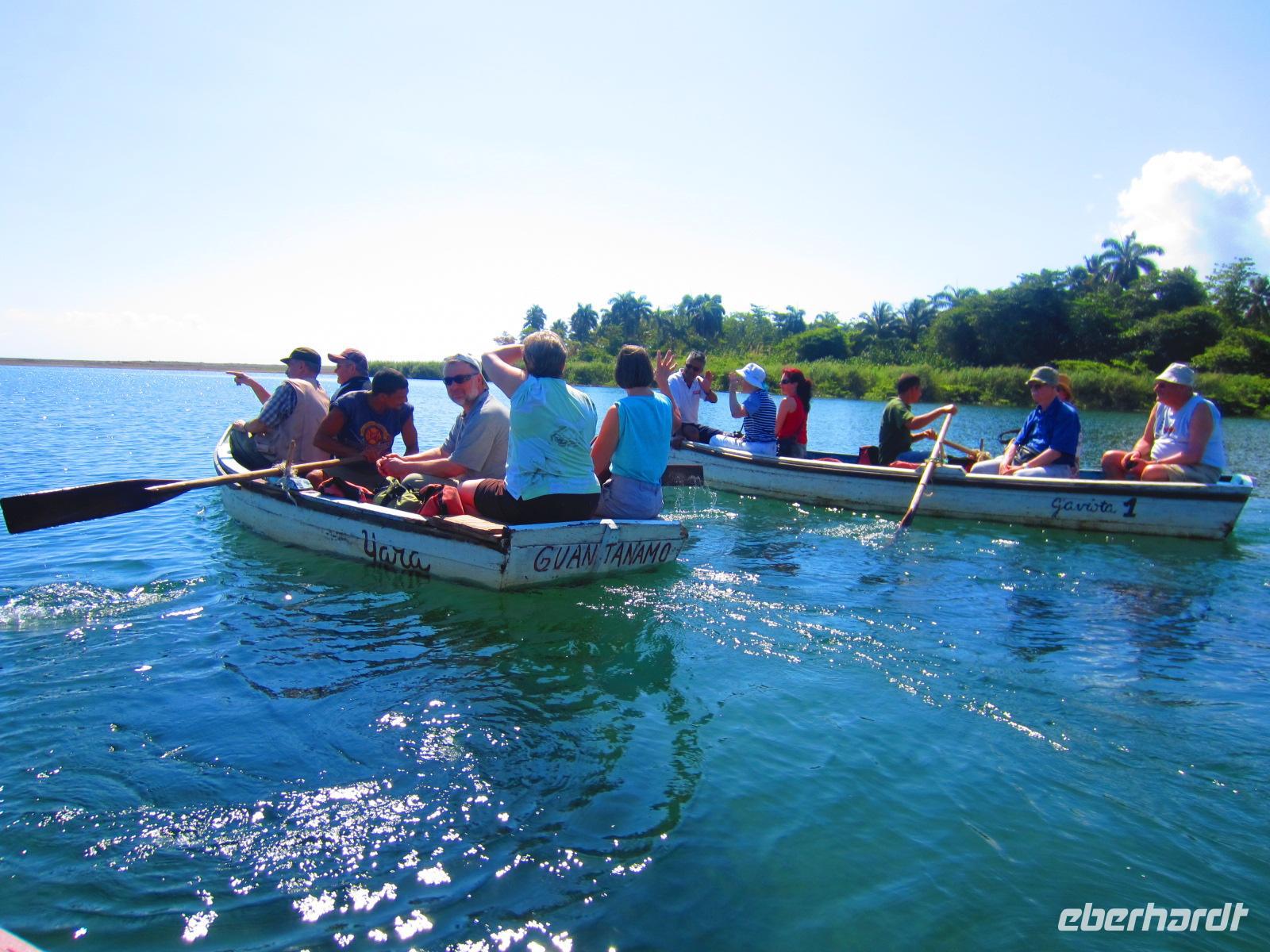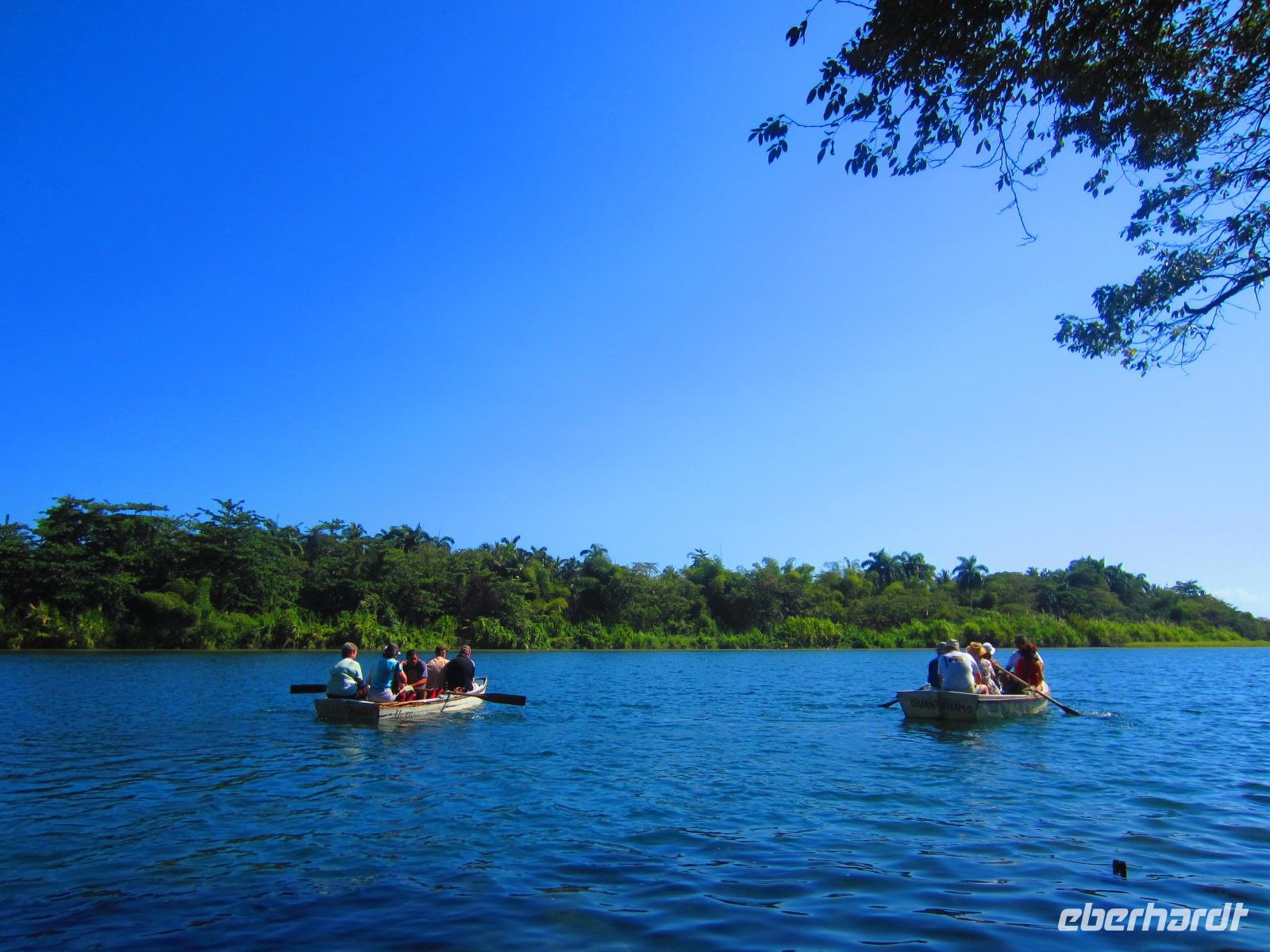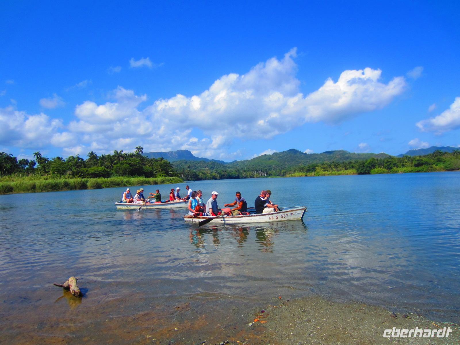 Anschließend fuhren wir zum Fluss Río Toa. Traumhaft im Regenwald gelegen, im Schatten des Ambos von Baracoa, unternahmen wir eine kleine Bootstour. In 3 kleinen Ruderbooten bewegten wir uns in absoluter Stille bis hin zum Strand. Dort hieß es Schuhe ausziehen und Sonne und Meerwasser genießen. Unser kleiner Spaziergang führte uns bis zur Mündung des Flusses in das Meer. Ein wunderschönes Naturschauspiel und Karibikfeeling pur. Das Mittagessen genossen wir im Wald bei Pina Colada in Kokosnüssen, Fruchtsaft in ausgehöhlten Zitrusfrüchten und bei mitreisender Livemusik. Es gab frisches Spanferkel, viel Gemüse, Reis mit Bohnen, Obst und andere Leckereien. Am frühen Nachmittag begaben wir uns wieder nach Santiago de Cuba. Auf der Fahrt machten wir einige Fotostopps, um die wechselnde Landschaft ausgiebig zu dokumentieren. Das Abendessen nahmen wir heute ganz vornehm im schicken Restaurant des Hotels „Casa Granada“ im Herzen der Innenstadt ein.