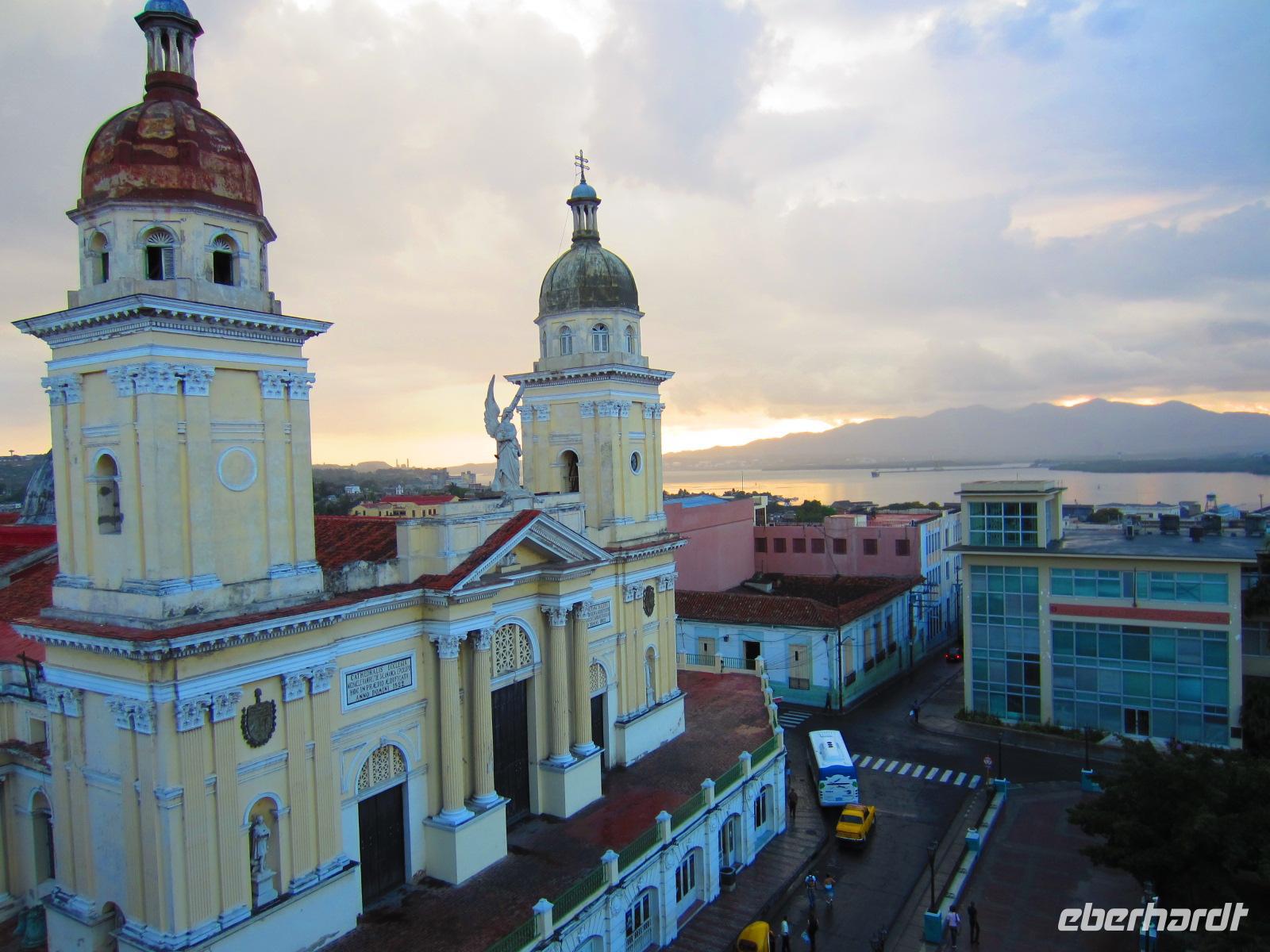 Nach einem reichlichen Frühstück, inklusive Sonnenaufgang auf der Dachterrasse unseres Hotels, begaben wir uns zurück zum Flughafen Jose Marti. Mit einer kleinen Propellermaschine flogen wir über die gesamte Insel bis nach Santiago de Cuba, der ehemaligen Landeshauptstadt. Da unser kleines Flugzeug sehr tief flog, konnten wir Kuba bereits wunderbar von oben bewundern. Schon beim Aussteigen merkten wir, dass die Luft im Süden der Insel doch deutlich schwüler ist. Am Flughafen erwartete uns bereits unser Busfahrer mit dem modernen Reisebus, der uns für die nächsten 2 Wochen begleiten sollte.