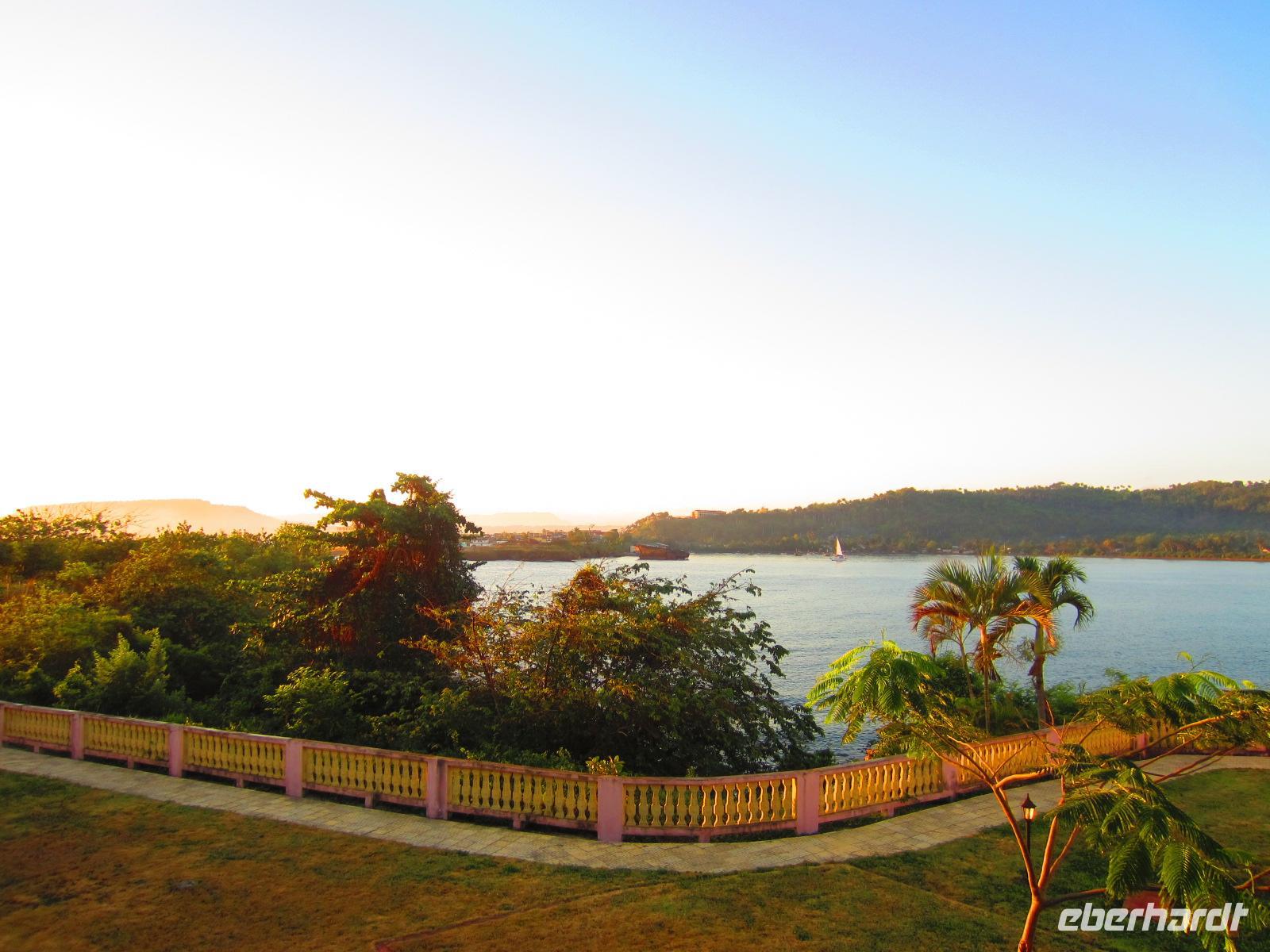 Zunächst besuchten wir die Bucht von Santiago de Cuba. Mit einer kleinen Fähre fuhren wir bei strahlendem Sonnenschein auf eine, in der Bucht gelegene Insel. Dort genossen wir, bei einem traumhaften Blick auf die Bucht, ein reichhaltiges 3-Gänge-Menü mit Spezialitäten vom Land und aus dem Meer. Frisch gestärkt fuhren wir zunächst zur Festung El Morro, welche traumhaft am Karibischen Meer gelegen ist, und weiter in die Innenstadt. Auf der Dachterrasse des Hotels „Casa Granda“, in dem sich einst die kubanische Bourgeoisie bei Rum, Zigarren und Tanz traf, tranken wir unseren ersten kubanischen Cocktail mit Blick auf die Kathedrale „Santa Ifigenia“. Anschließend unternahmen wir einen Bummel durch die lebhafte Innenstadt. Arm und reich liegen hier sehr dicht beieinander, aber die Menschen strahlen trotz ihrer erschwerten Bedingungen eine unheimliche Lebensfreude aus. Den Abend genossen wir in einem kleinen Restaurant in der Innenstadt bei leckerem Essen, Musik und interessanten Unterhaltungen.