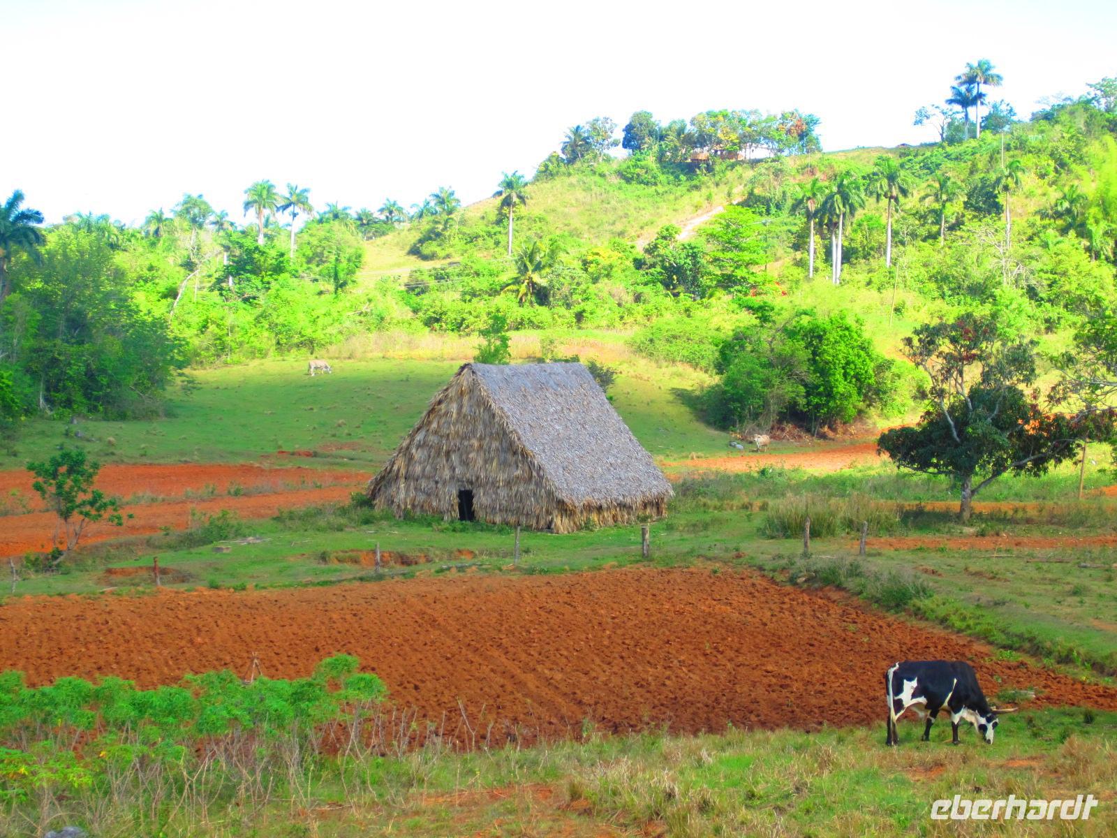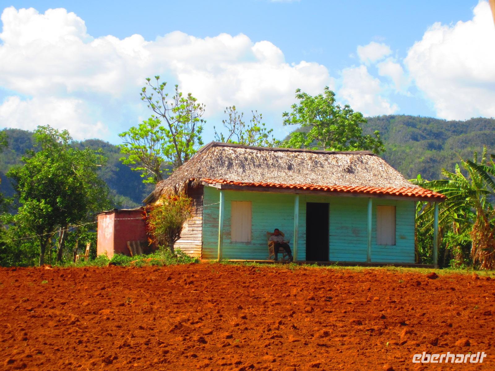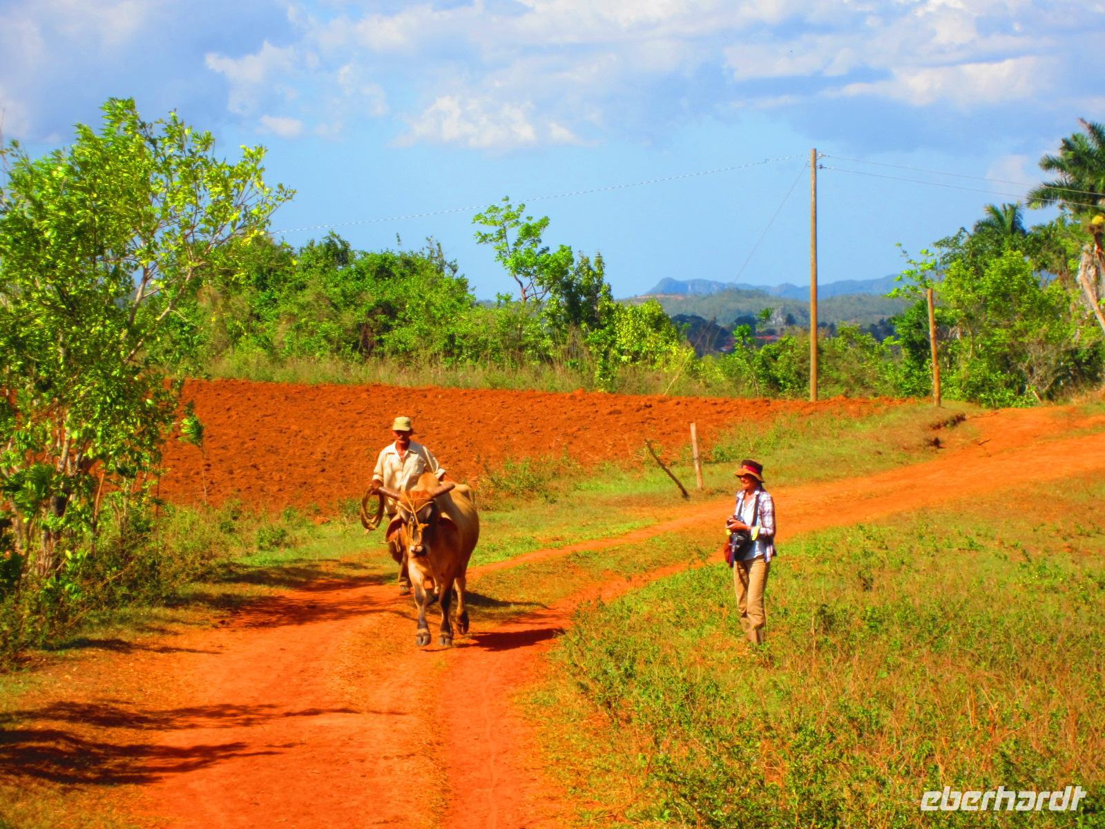 Bei einer Wanderung durch das malerische Vinales-Tal gingen wir dem Tabakanbau auf die Spur. Wir besuchten einen Tabakbauern und Emilio erklärte uns wie das Anbau-, Ernte- und Trockenverfahren abläuft. Bei unserer Wanderung durch das Tal, welches wegen seiner riesigen Kalksteinfelsen berühmt ist, sahen wir das Landleben in seiner Ursprünglichkeit. Hier wird die Erde noch mit Ochsen und Holzpflug bearbeitet. Wir genossen die strahlende Sonne und die vielen Pflanzen, die in der fruchtbaren roten Erde wunderbar gedeihen. Zum Abschluss der Wanderung lud uns eine Familie in ihr Landhaus zu frischen Säften und Früchten ein. Ein gelungener Karfreitag auf kubanisch .