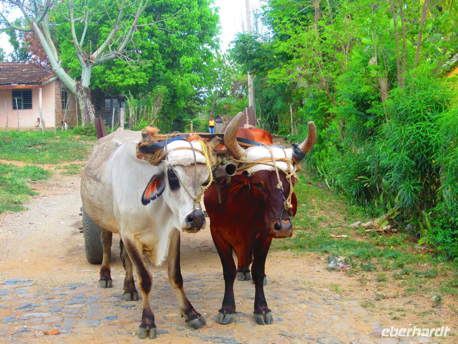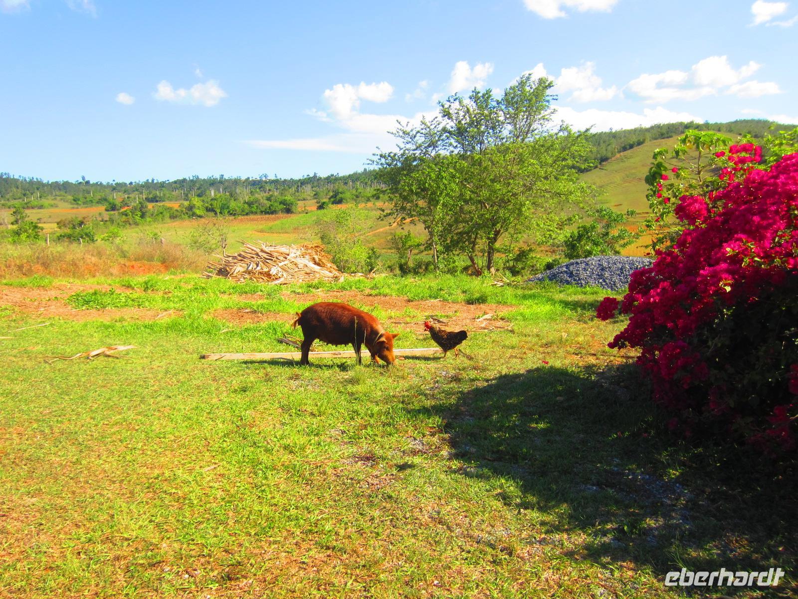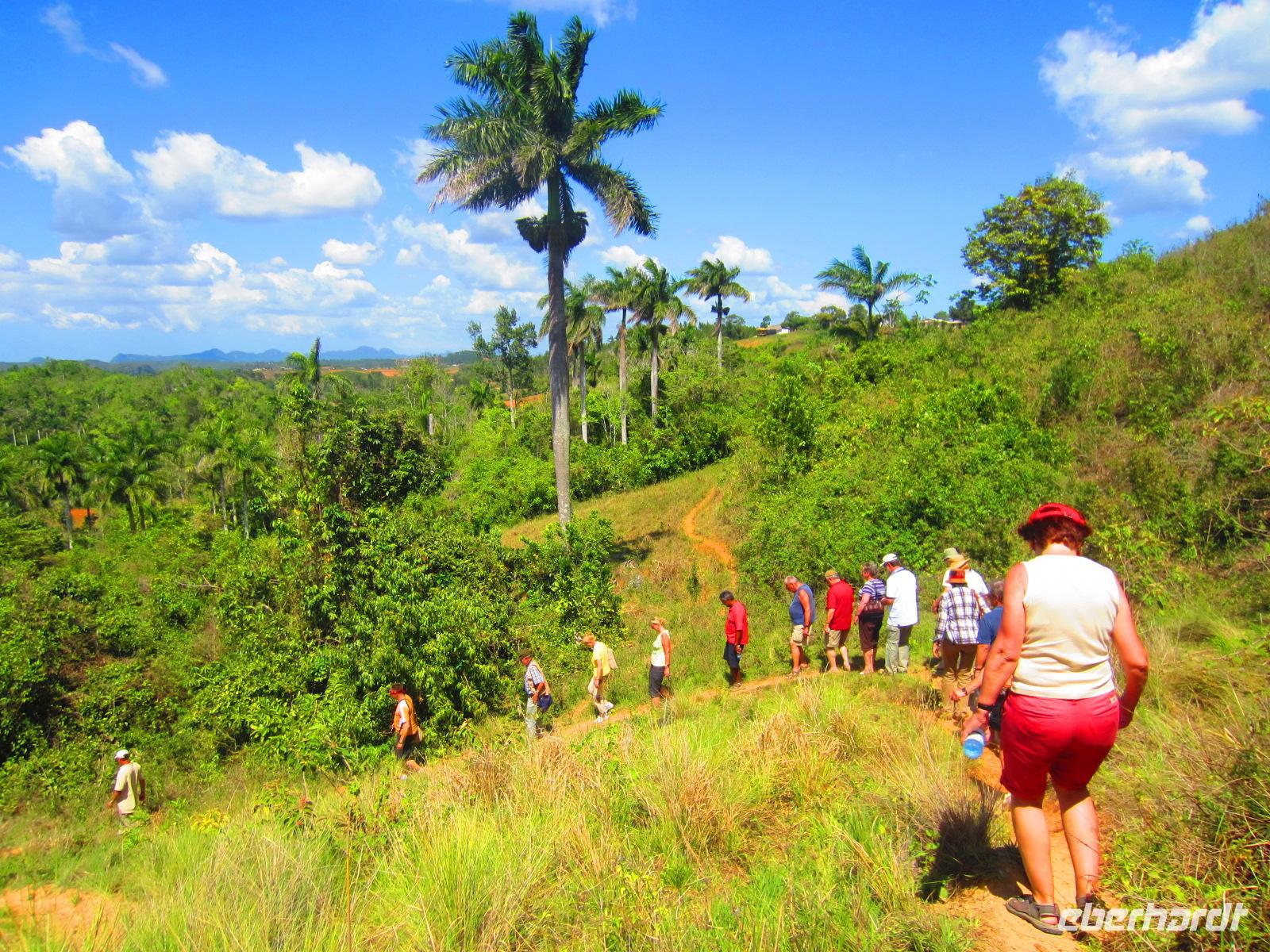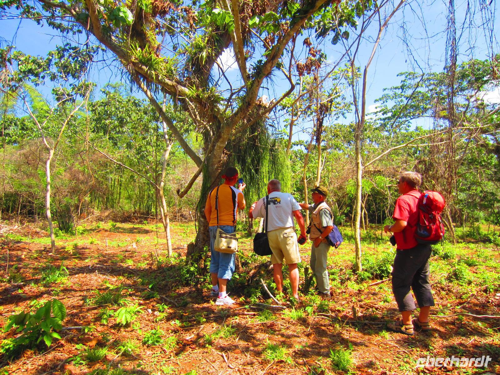 Bei einer Wanderung durch das malerische Vinales-Tal gingen wir dem Tabakanbau auf die Spur. Wir besuchten einen Tabakbauern und Emilio erklärte uns wie das Anbau-, Ernte- und Trockenverfahren abläuft. Bei unserer Wanderung durch das Tal, welches wegen seiner riesigen Kalksteinfelsen berühmt ist, sahen wir das Landleben in seiner Ursprünglichkeit. Hier wird die Erde noch mit Ochsen und Holzpflug bearbeitet. Wir genossen die strahlende Sonne und die vielen Pflanzen, die in der fruchtbaren roten Erde wunderbar gedeihen. Zum Abschluss der Wanderung lud uns eine Familie in ihr Landhaus zu frischen Säften und Früchten ein. Ein gelungener Karfreitag auf kubanisch .