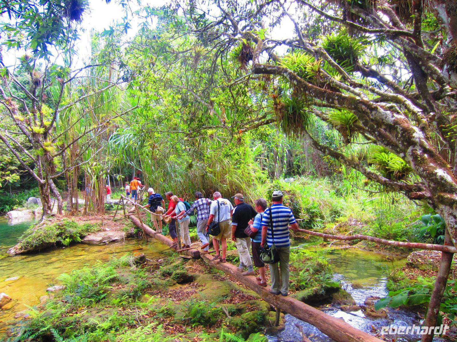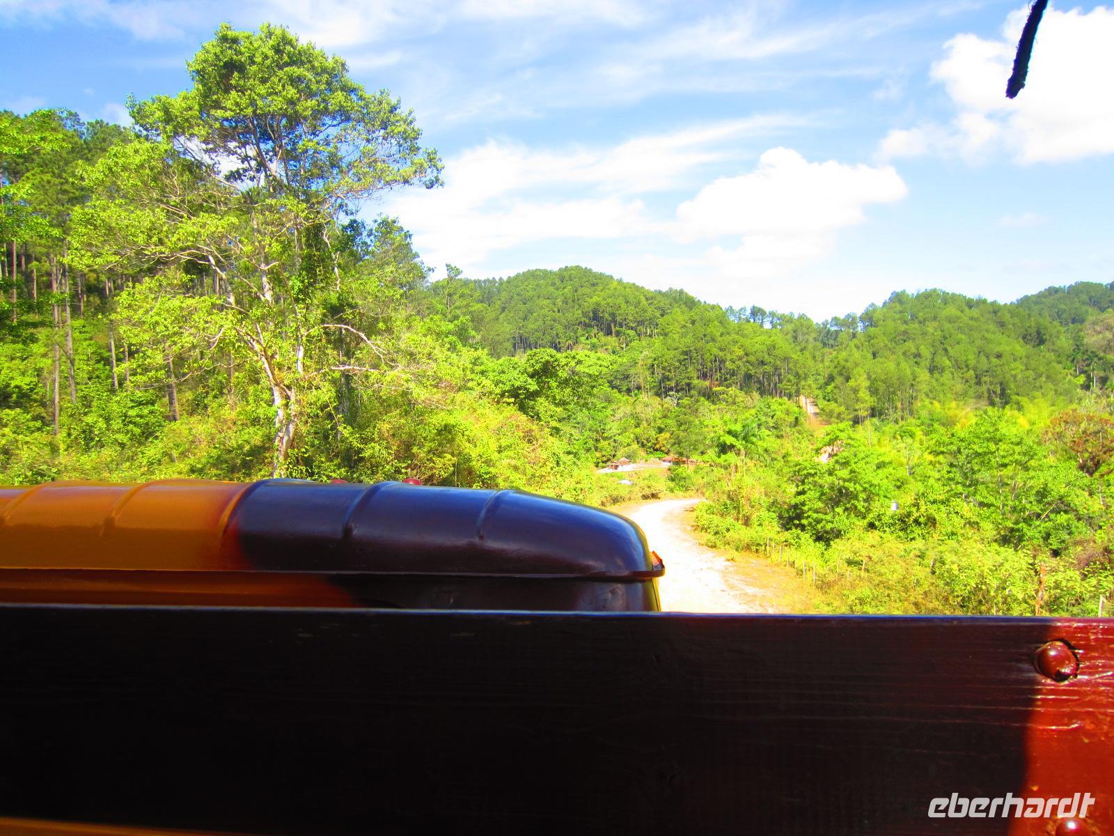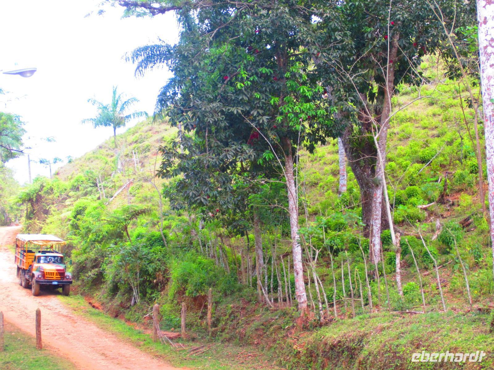 Nach einem ausgiebigen Frühstück verließen wir unser Strandhotel und machten uns auf zum Abenteuer Wandern. Im Luftkurort Topes de Collantes erwartete uns bereits unsere liebe Wanderführerin, die zu jeder Pflanze eine lustige Geschichte kannte, und unsere russische Luxuslimousine, ein alter LKW, mit 6-Sterne Fahrer Yuri. Über Stock und Stein, mitten hinein in den dichten Wald ging die rasante Fahrt auf der bestuhlten Ladefläche des LKWs. Am Rande eines kleinen Dorfes begannen wir unsere 3-stündige Wanderung. Wir sahen Kaffeepflanzen, Mameybäume, riesige Bambusstauden, einen kleinen Wasserfall und den laut singenden Nationalvogel Tocororo. An einem natürlichen See wagten sich sogar einige von uns in das kühle Nass, um sich zu erfrischen. Unsere herrliche Wanderung endete an einem Restaurant in dem wir uns stärken konnten, bevor es mit dem LKW zurück zum Bus ging. Nach diesem ersten Naturspektakel des Tages, folgte am Nachmittag auch schon das Nächste. Im Botanischen Garten „Jardín Botánico Soledad“ bekamen wir viele exotische Pflanzen aus aller Welt gezeigt. Besonders faszinierten uns der Leberwurstbaum, die riesigen Bambuspflanzen, der unglaubliche Gummibaum und der spanische Bartbaum. Den Abend, dieses eindrucksvollen Tages, genossen wir bei einem leckeren Essen in unserem schönen Hotel „ La Union“ in Cienfuegos.