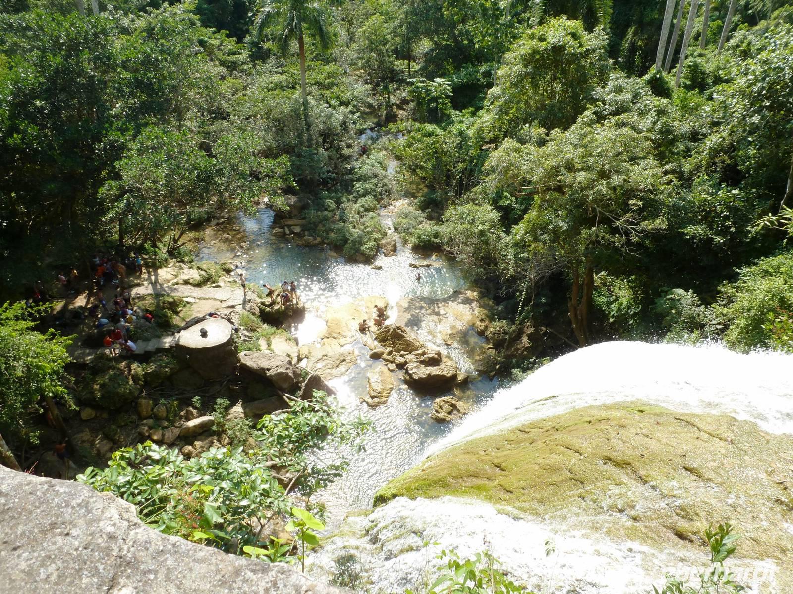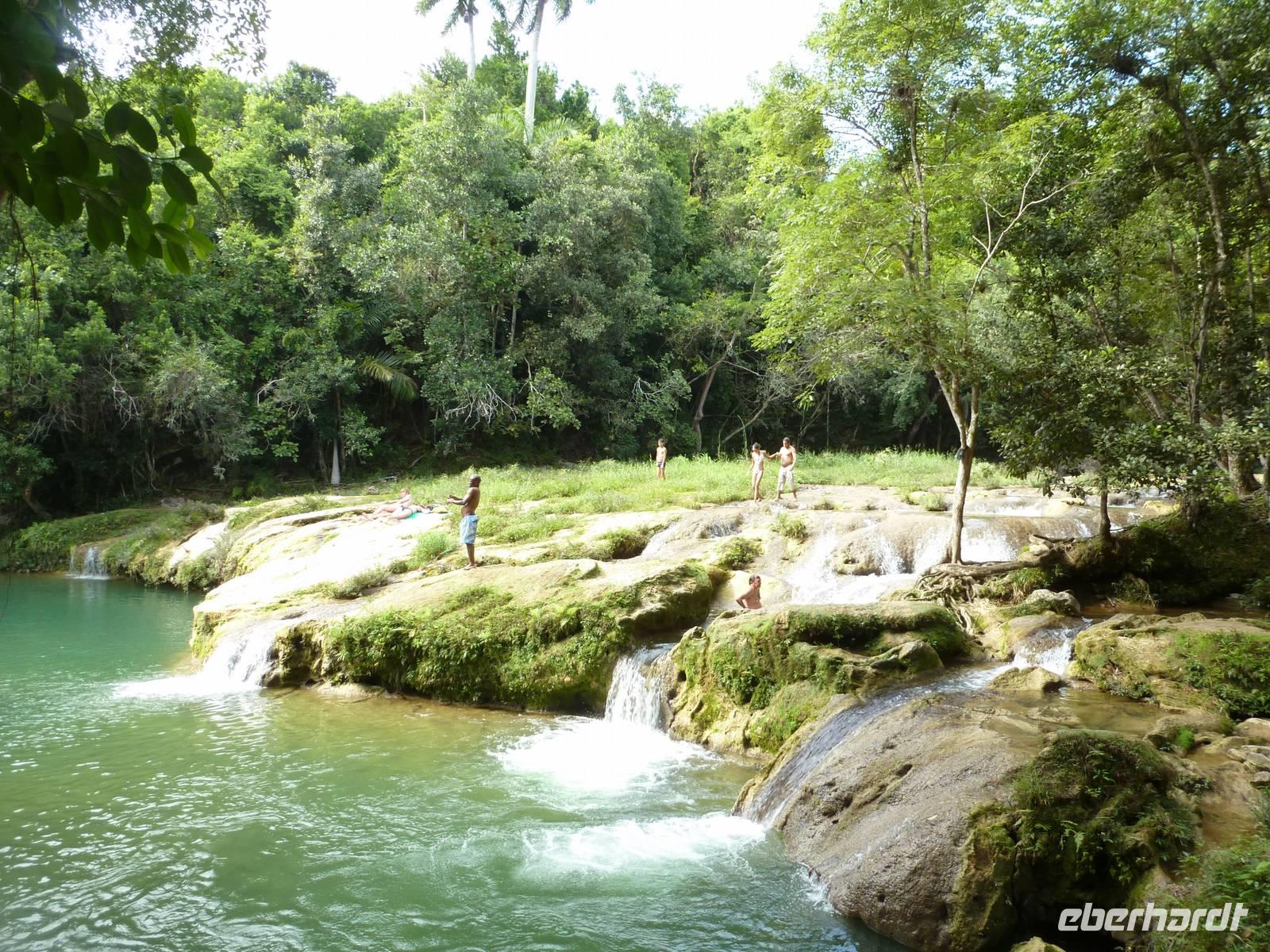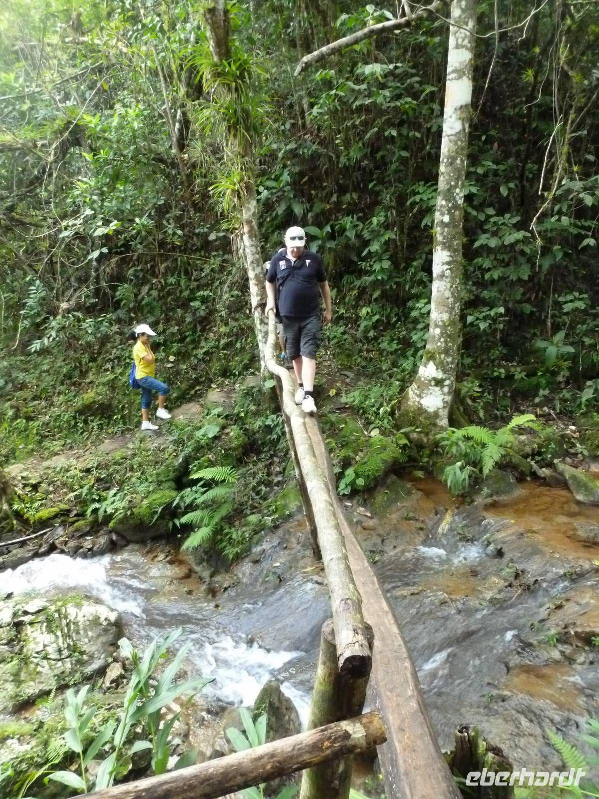 Mitten im tropischen Regenwald steigen wir aus und unternehmen eine Wanderung. Es geht an schmalen Flüssen mit glasklarem Wasser vorbei über Baumstämme und feuchten Grund (schließlich hat es vor kurzem noch geregnet). Wir meistern die Schwierigkeiten mühelos und werden von zwei beeindruckenden Wasserfällen belohnt.