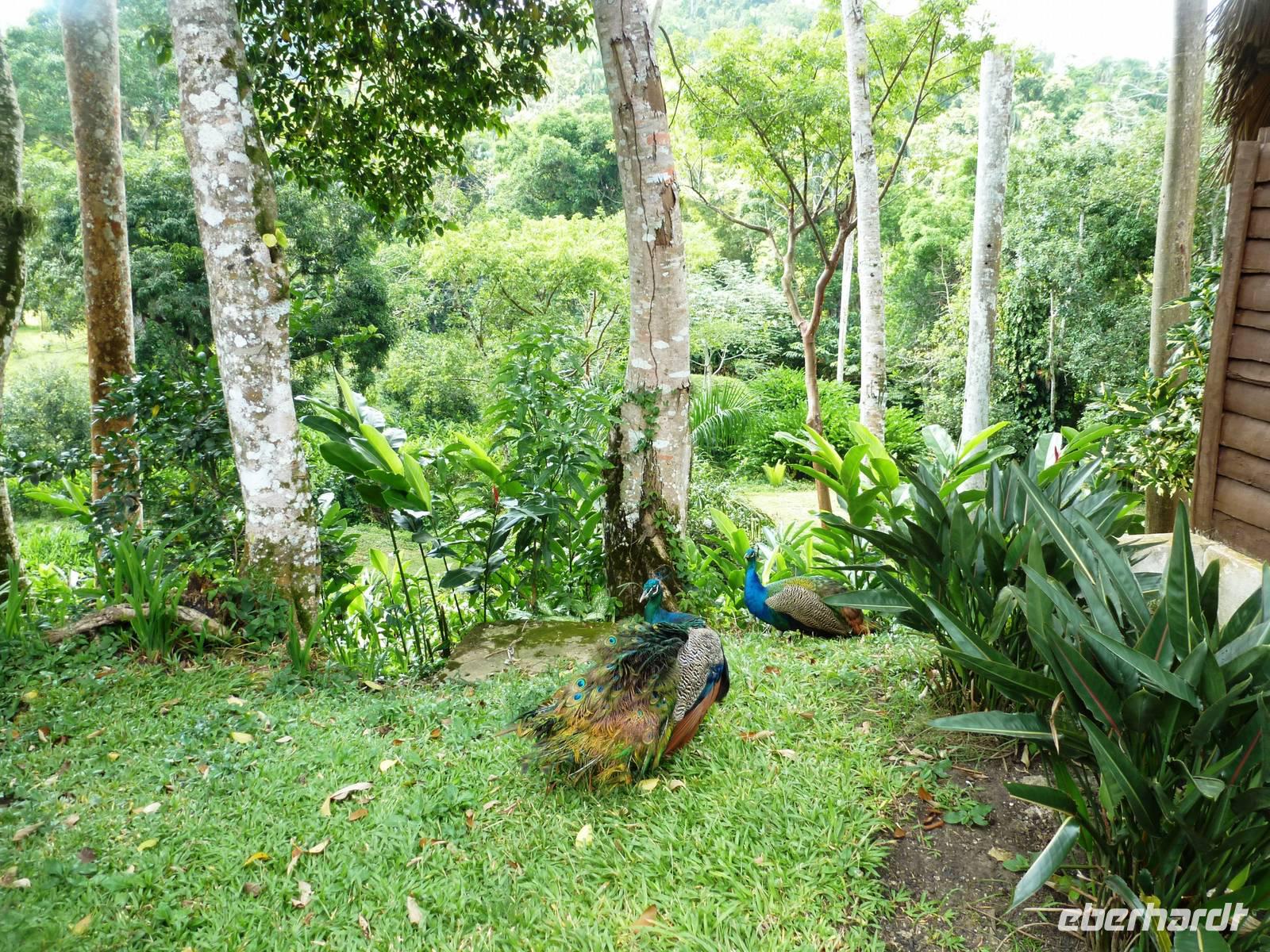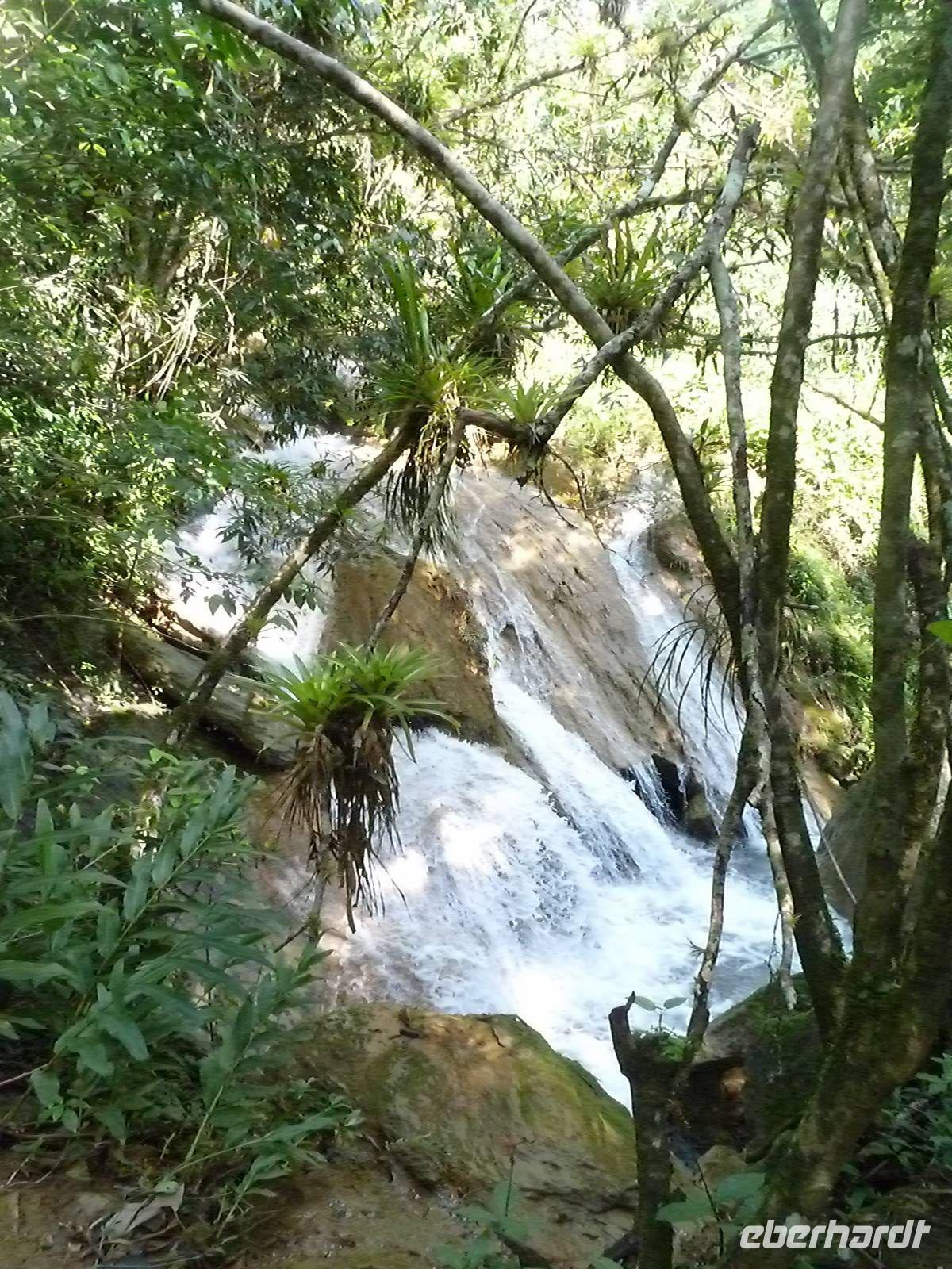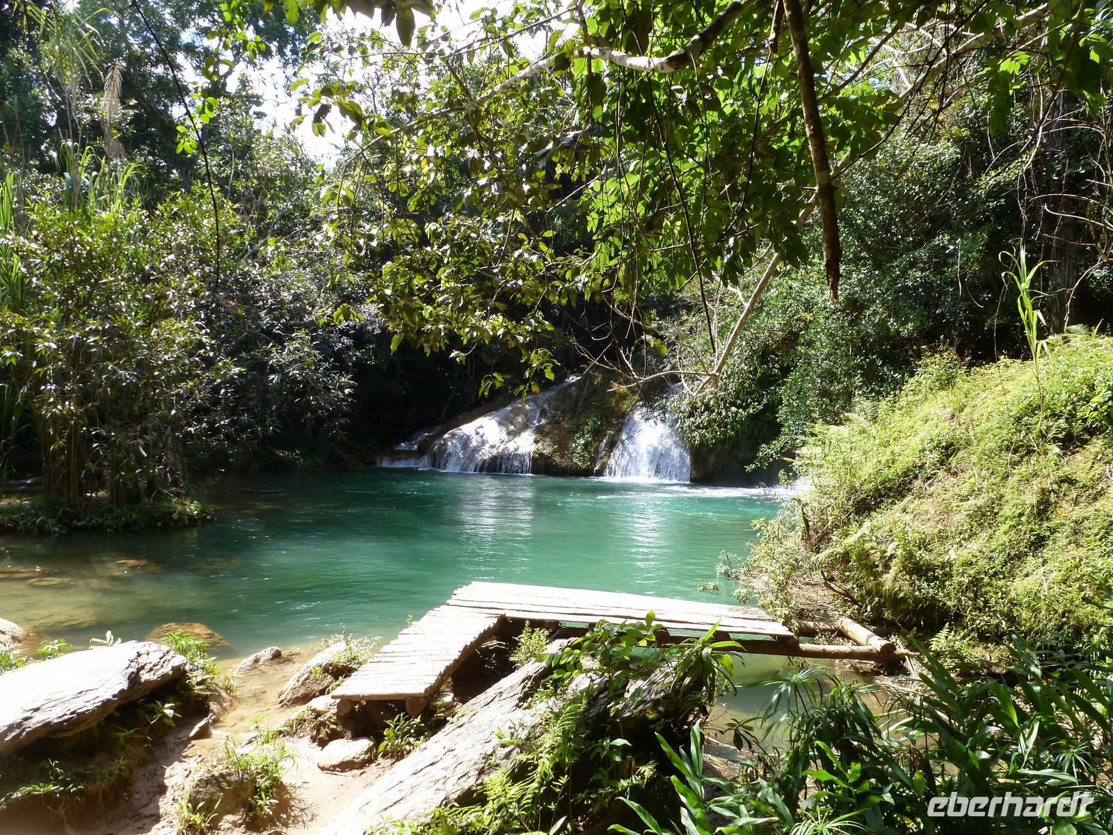 Mitten im tropischen Regenwald steigen wir aus und unternehmen eine Wanderung. Es geht an schmalen Flüssen mit glasklarem Wasser vorbei über Baumstämme und feuchten Grund (schließlich hat es vor kurzem noch geregnet). Wir meistern die Schwierigkeiten mühelos und werden von zwei beeindruckenden Wasserfällen belohnt.