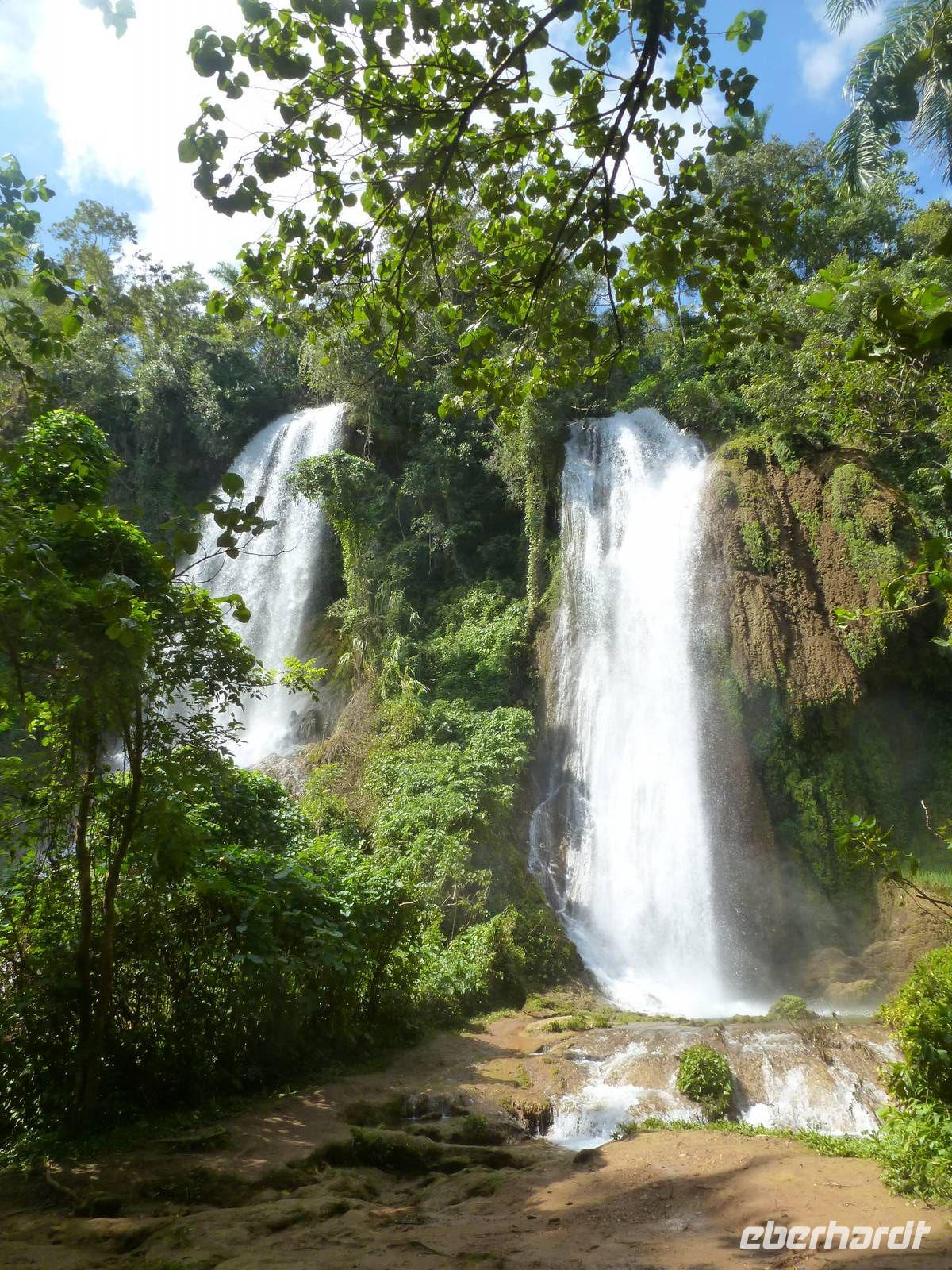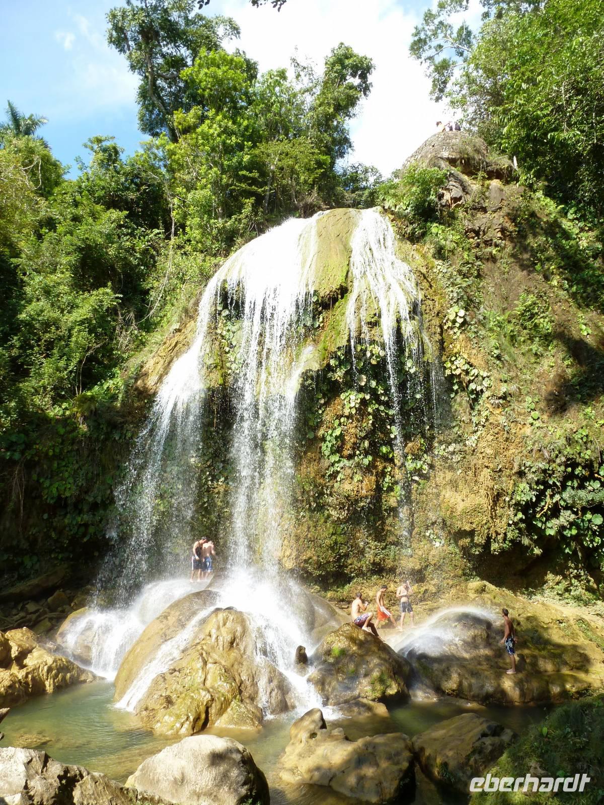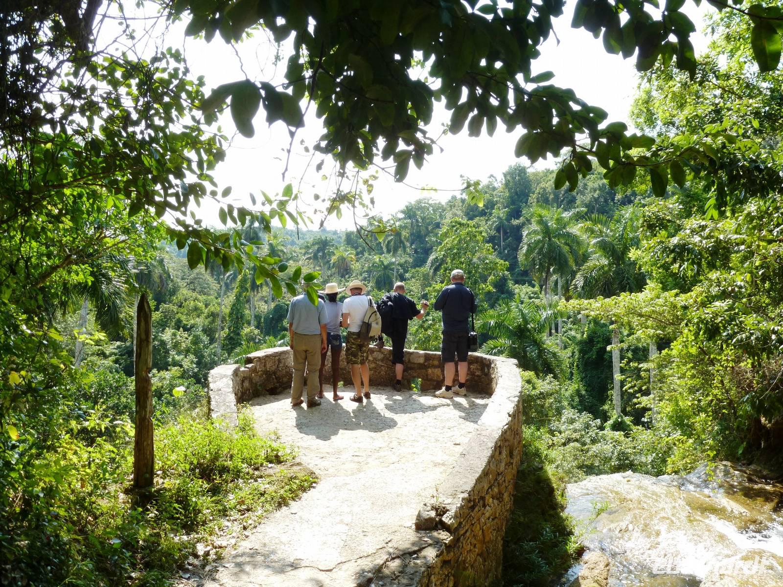 Heute erleben wir noch einmal einen Höhepunkt. Wir spazieren treppauf, treppab (es sind insgesamt 296 Stufen) zum Wasserfall Salto de Soroa, der in eindrucksvoller Höhe hinab fällt und ein Paradies für Badefreunde darstellt. Leider sind wir nicht die einzigen Besucher und so machen wir uns nach kurzer Rast wieder auf den Weg zum Ausgangspunkt, wo wir uns bei einem Espresso eine wohlverdiente Pause gönnen.