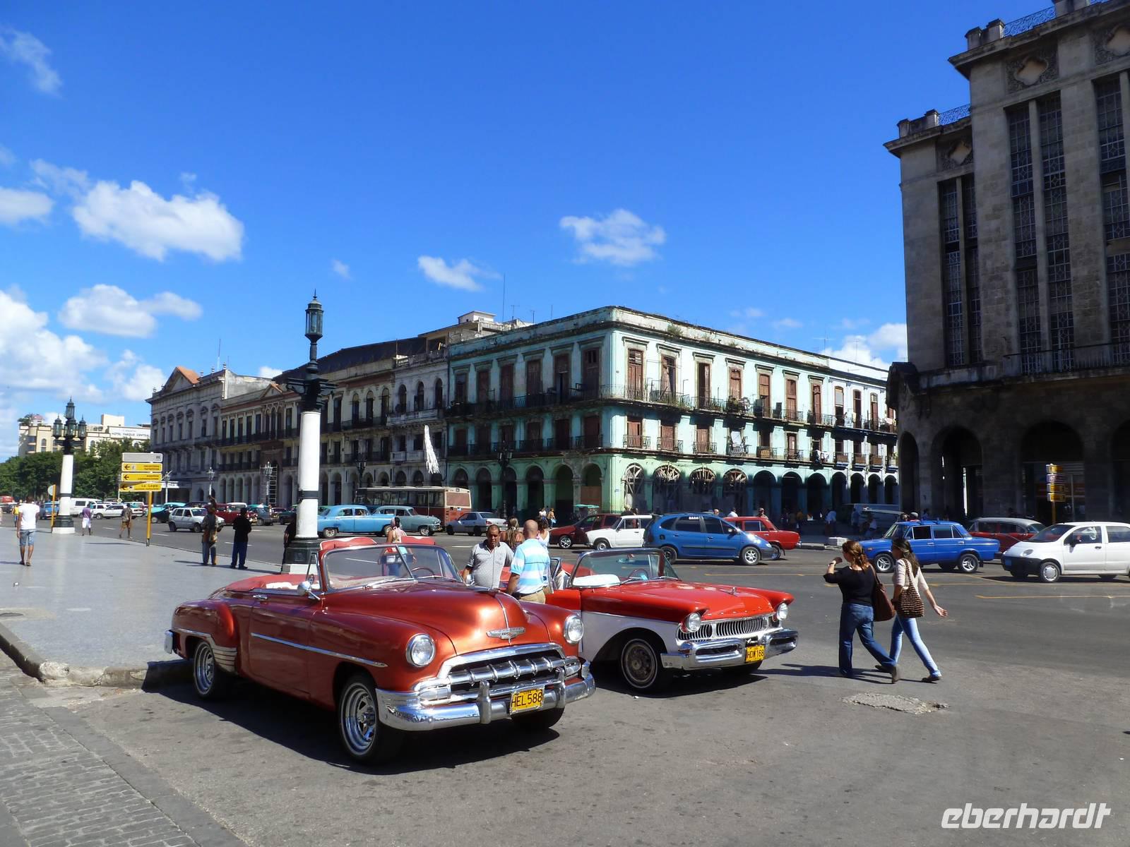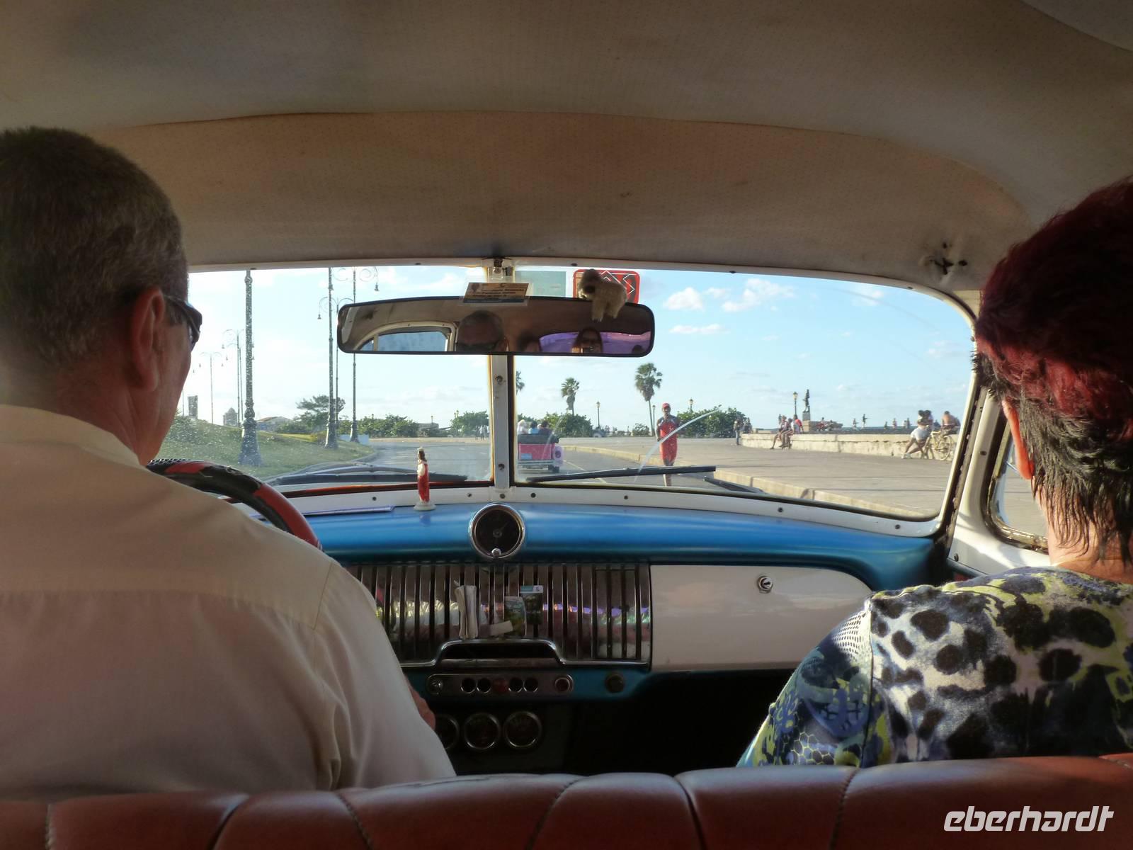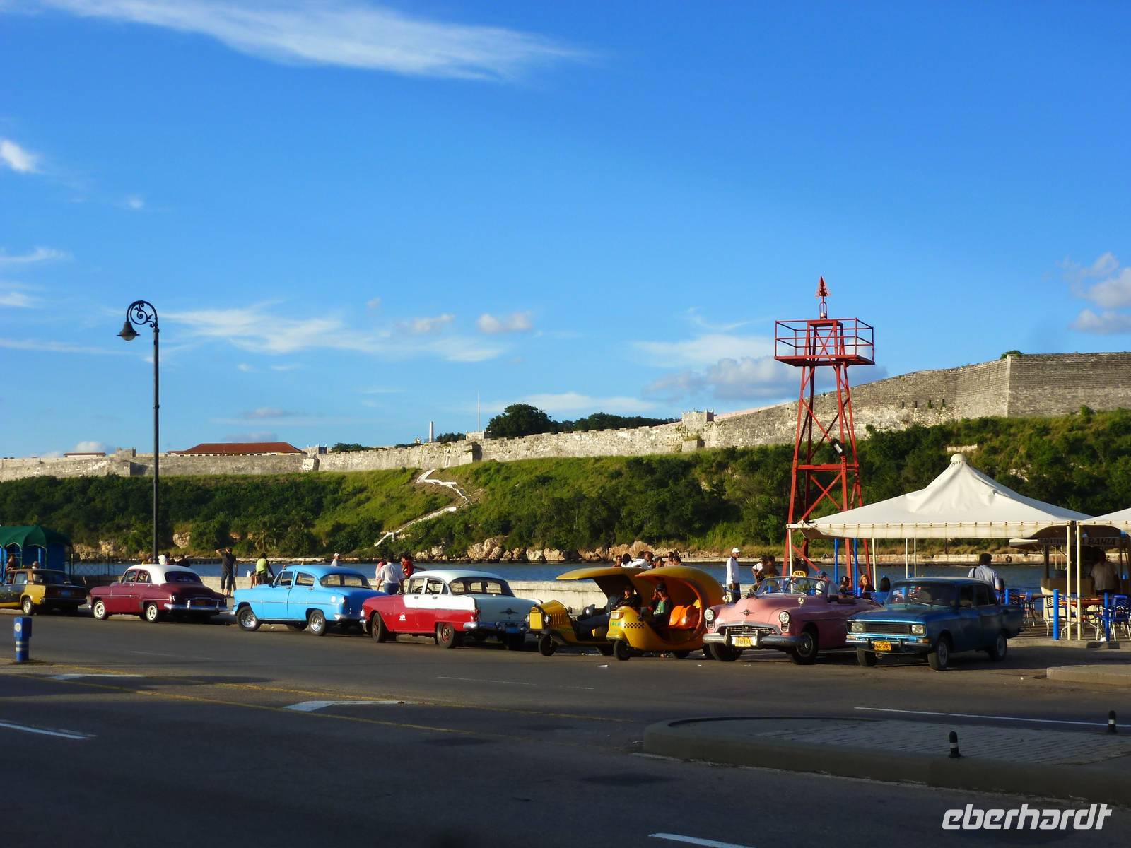 Nach einem kleinen Rundgang haben wir wieder vier Räder unter den Füßen und wahlweise Wind in den Haaren. Mit Oldtimern lassen wir uns an der Festung Castillo de los Tres Reyes del Morro und an der berühmten Uferpromenade Malecón vorbei bis in den Stadtteil Miramar und zurück chauffieren.