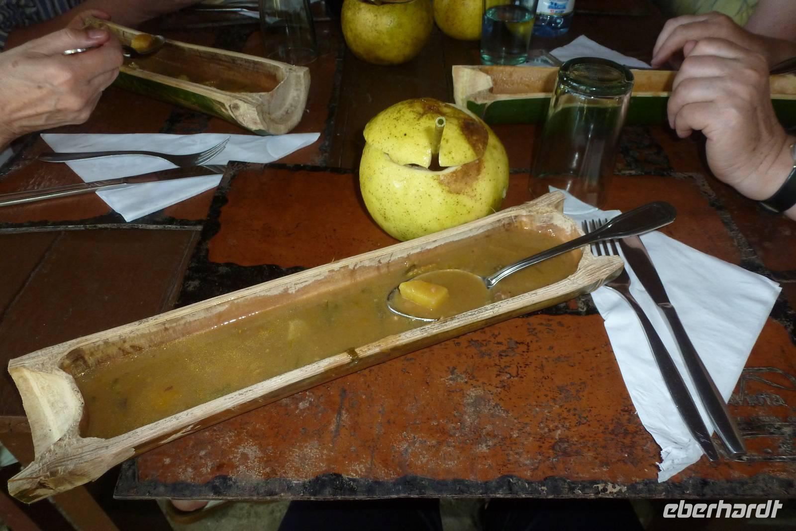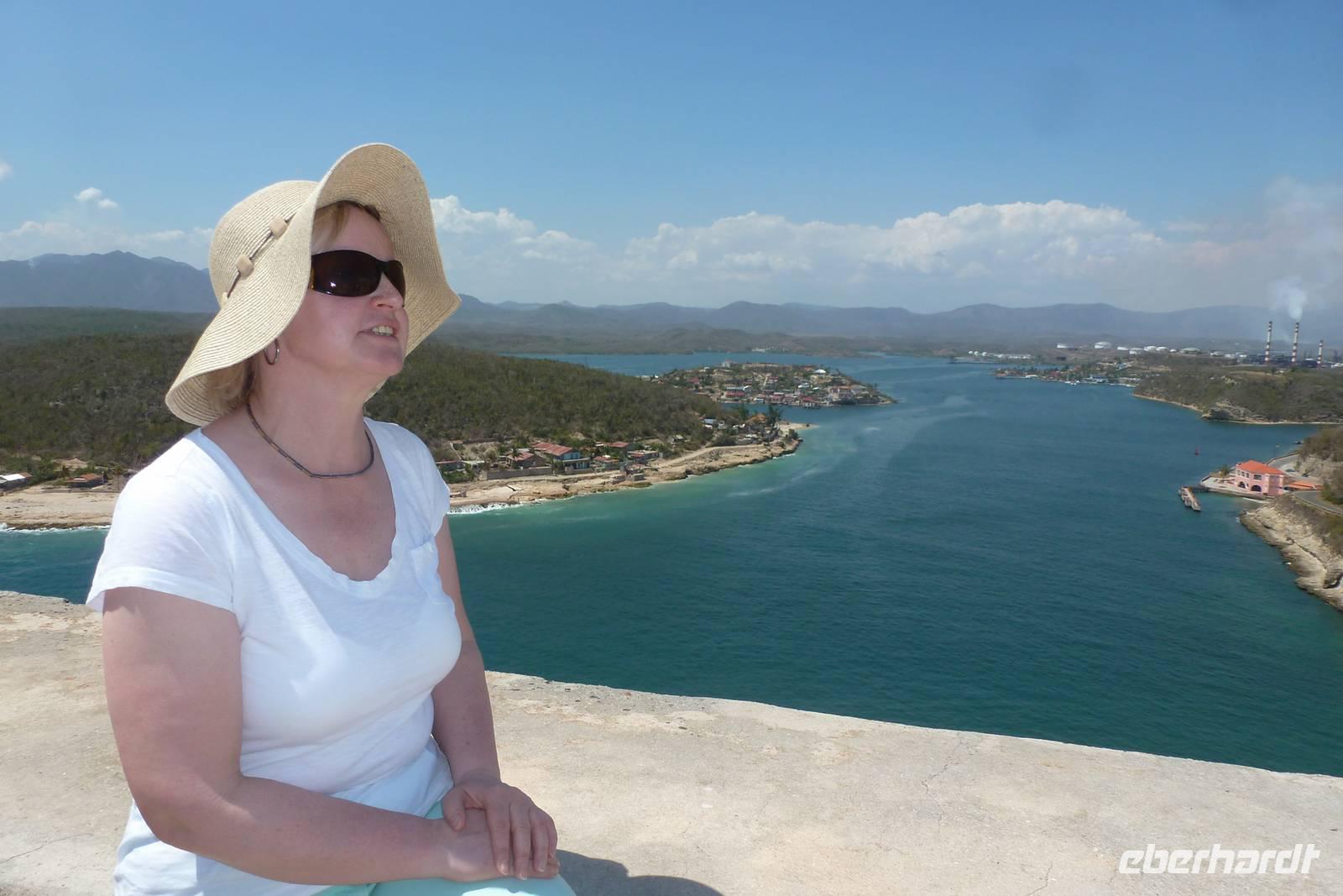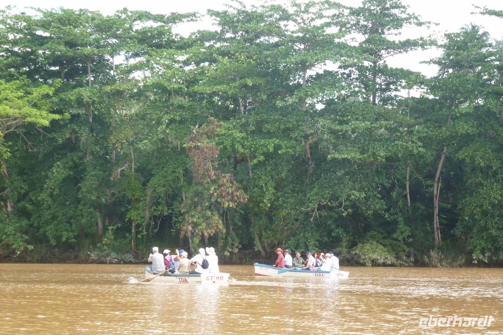 Nach dem schönen Frühstück machten wir einen Spaziergang durch den ältesten Ort Kubas - Baracoa. Zuerst hinauf zum Castilla - einem Hotel welches über den Dächern der Stadt liegt mit einer tollen Aussicht über den Ort und das Meer. Danach spazierten wir weiter durch die Gassen bis zur Kirche Nuestra Senora de Concepcion mit dem über 500 Jahre alten Kreuz „Cruz de la Parra", welches Kolumbus bei seiner Entdeckung Kubas an diesem schönen Ort gelassen hat. Nun verließen wir den Ort und fuhren hinaus in die grüne Natur - zum Rio Toa, einem Fluss umgeben von dichter grüner Vegetation. Wir fuhren zur wunderschönen gleichnamigen Finca, wo wir nach einem Rundgang durch den Regenwald eine Bootsfahrt auf traditionellen Holz-Ruderbooten unternahmen. Das war toll, denn an den Ufern war dichter Regenwald mit Königs- und Kokospalmen. Nach diesem Erlebnis erwartete uns in einer typisch kubanischen Strohhütte ein traditionelles Mittagessen. Wir aßen Suppe aus Bambusschalen, welche in einem Topf aus Palmenblättern serviert wurde. Und die jungen Männer grillten uns ein leckeres Spanferkel über dem offenen Feuer, welches wir uns dann schmecken ließen. Der Cocktail wurde in einer ausgehöhlten Zitrusfrucht serviert, kubanische Musiker spielten tolle Musik für uns....uns ging es gut! Schließlich fuhren wir am Nachmittag zurück nach Santiago de Cuba, wo wir am Abend auf der Dachterrasse eines Hotels direkt am Hauptplatz mit der Kathedrale und dem Rathaus unser Abendessen über den Dächern der Stadt genossen.
