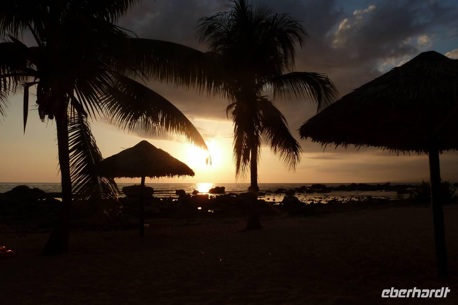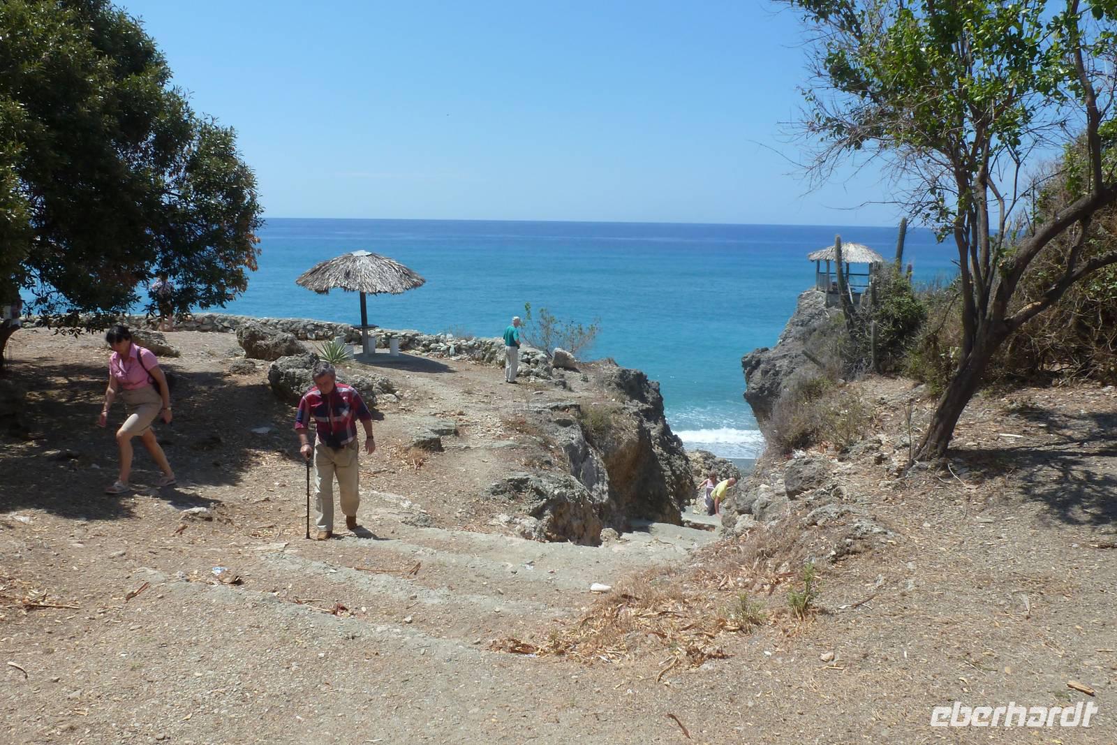 Nach dem Frühstück ging es los Richtung Osten. Wir hatten circa fünf Stunden Fahrt nach Baracoa vor uns. Es war eine wunderschöne Strecke in die Provinz Guantanamo. Am großen Willkommensschild für die für den amerikanischen Militärstützpunkt bekannten Provinz machten wir unser erstes Gruppenbild. Und dann fuhren wir vorbei an der gleichnamigen Stadt, machten in einem Hotel unseren ersten Kaffeestop und fuhren dann weiter auf einer herrlichen Straße entlang der karibischen Küste, bis wir an einem kleinen Strand unsere „Futterbeutel"-Pause einlegten. Wir haben uns unter einen Stroh-Sonnenschirm am Meer gesetzt und unser belegtes Sandwich und frisches Obst gegessen. Kuba PUR! Am schönen kleinen Strand haben wir unsere Füße dann noch im Badewannen-warmen Wasser „abgekühlt" bevor wir weiter fuhren. Wir haben die Karibik dann verlassen und sind durch die Bergwelt der Sierra Maestra gefahren. Es wurde dann alles viel grüner und die Landschaft veränderte sich sehr - aus der trockenen Gegend an der Südküste wurde auf einmal grüner Regenwald - apropos Regen, es fing dann wirklich an zu regnen und in Baracoa am atlantischen Ozean angekommen wurde es noch viel heftiger - ein richtiger tropischer Regen begleitete uns nun den gesamten restlichen Tag. Wir besuchten das kleine Stadtmuseum der ehemaligen Festung von Baracoa und spazierten dann entlang der vom letzten Tsunami im Jahre 2009 getroffenen Küstenstraße des Ortes. Und dann hatten wir eine kleine Überraschung für unsere Gäste geplant: wir besuchten außerplanmäßig eine Bauernfamilie, welche eine Kakaoplantage betreibt. Ein junger Bauer führte uns durch die grüne Plantage und zeigte uns die Kakaobäume. Er erklärte uns, wie Kakao aus der eigentlichen Frucht gewonnen und verarbeitet wird. Es war wirklich toll und nach dem Rundgang durch die Plantage haben wir in der wunderschönen Finca unter dem Strohdach ein leckeres Schokogetränk aus Kokosmilch mit Kakao getrunken. Uns ging es gut...nach diesem Erlebnis fuhren wir in unser Hotel Porto Santo. Es regnete immer noch und so konnten wir die tolle Anlage mit Blick nach Baracoa leider nicht so wirklich genießen. Wir aßen dann im Hotelrestaurant zu Abend und nachher machten wir es uns mit einem Begrüßungsgetränk - wieder Cuba Libre aus Rum und Cola - an der Poolbar direkt am Meer gemütlich. Es war ein sehr schöner Ausklang des Tages...