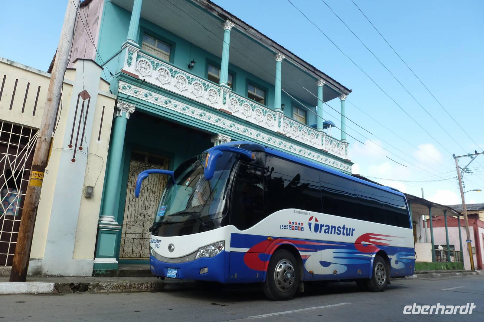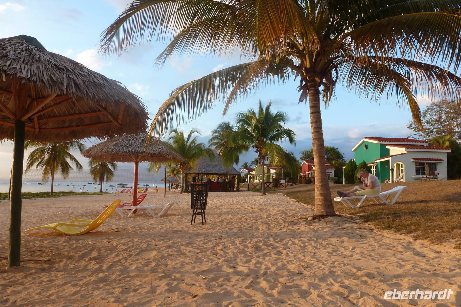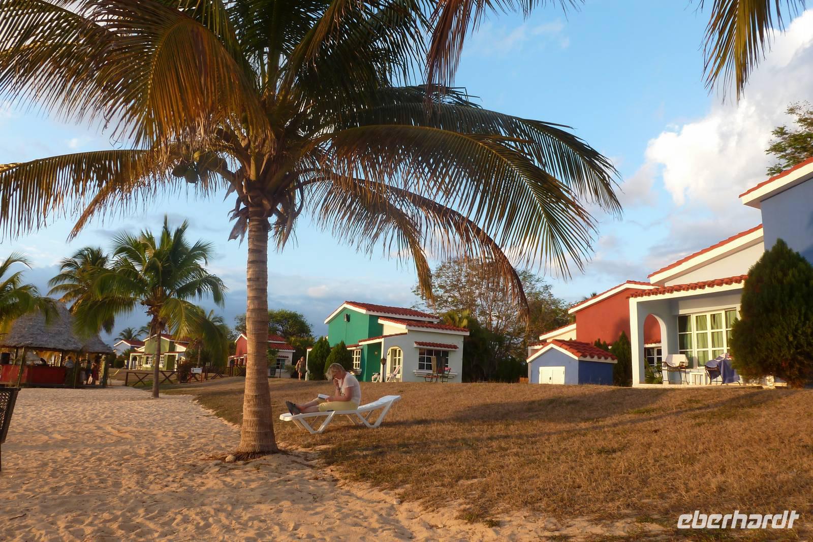 Am Morgen erwartete uns ein weiterer Höhepunkt der Reise: eine Fahrt mit einem Fahrradtaxi, einem „Bici-Taxi" durch die Gassen von Camaguey. Immer zwei Gäste pro Bici und los ging es - eine ganz tolle Art, diese schöne Stadt kennenzulernen. Wir stoppten unterwegs immer wieder und Lois zeigte uns die schönsten Kirchen, Häuser, Plätze und ein Lebensmittelkarten-Geschäft. Denn in Kuba bekommen die Menschen Lebensmittelkarten, mit denen sie monatlich Ihre Grundnahrungsmittel wie Reis, Zucker und Mehl kaufen können. Nach dieser tollen Rundfahrt fuhren wir mit unserem Bus weiter Richtung Westen in die Stadt Sancti Spiritus, wo wir nach dem Mittagessen einen Stadtbummel über den Bauernmarkt und durch die Fußgängerzone der Stadt machten. Wir überraschten die Gäste noch mit einem kurzen Stopp in dem Casa de las Trovas - dem Musikhaus, in dem eine tolle Band für uns gespielt hat und Eberhardt die Gäste auf einen tropischen Cocktail eingeladen hat. Wir haben sogar Salsa mitgetanzt - das war Kuba PUR! Am Nachmittag stoppten noch bei einem Landhaus eines ehemaligen Zuckerrohrbaronen, welches wir uns anschauten und Lois uns einiges über das Leben der Zuckerbaronen und der vielen Sklaven erzählte. Schließlich erreichten wir am Abend unsere schöne Hotelanlage Club Costa Sur, wo wir das kommende Wochenende am Strand des karibischen Meers verbrachten. Lois hat es organisiert, dass unsere Gäste die exklusiven Bungalows direkt am Strand bekommen und nicht wie alle anderen Reisegruppen in einem der Reihenhäuser übernachten. Drei Tage in tollen großzügigen Bungalows, nur wenige Schritte entfernt vom schönen Sandstrand und dem warmen, türkisfarbenen Wasser der Karibik...ach war das schön. Wir hatten „All Inklusive", das heißt Essen und Trinken war alles inklusive, und so ließen wir den Abend beim Buffet und bei einem Cocktail an der Poolbar mit einer tollen afro-amerikanischen Tanzshow ausklingen.