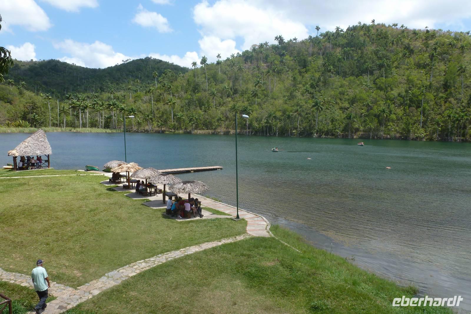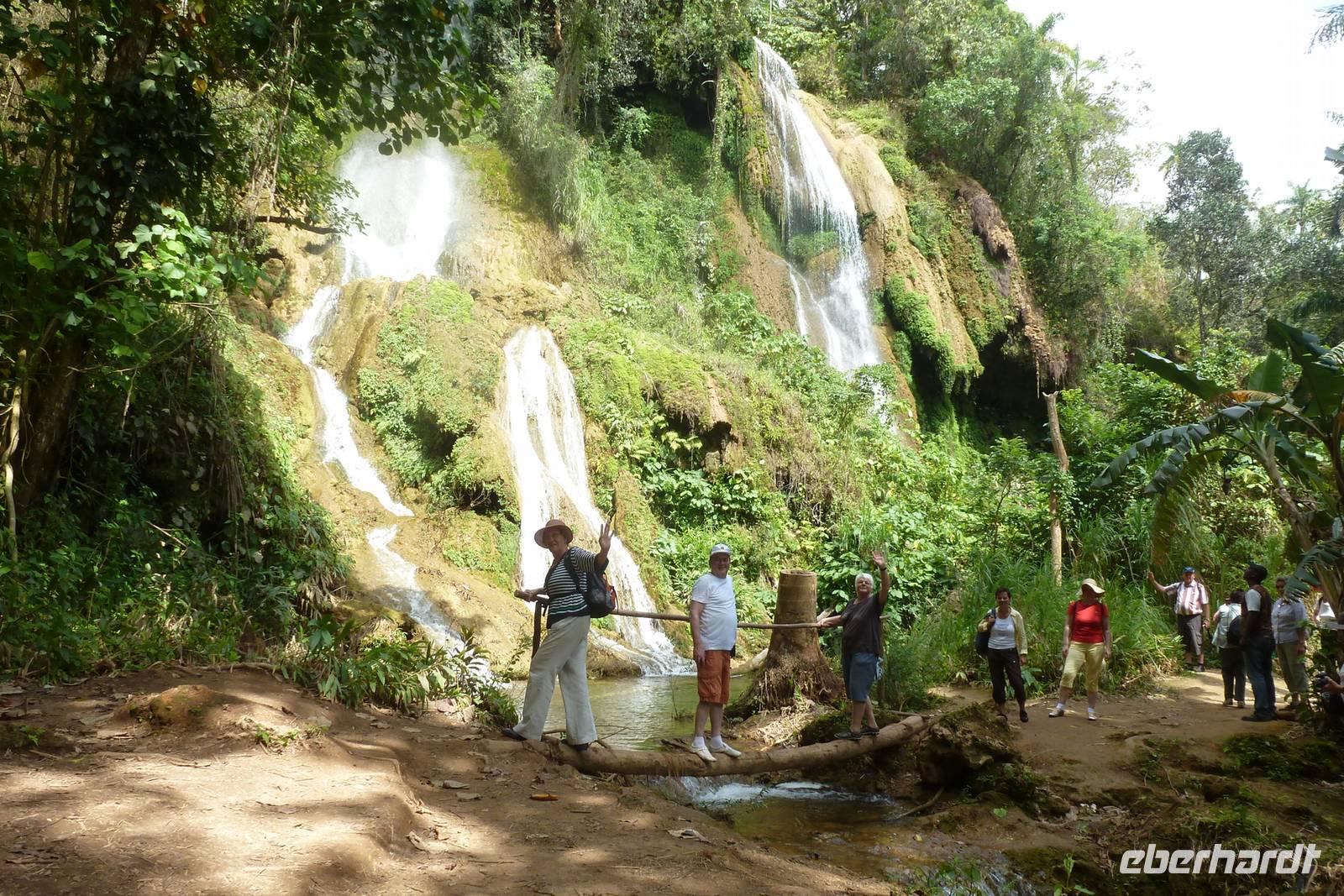 Nach dem Frühstück haben wir das karibische Meer verlassen und wir sind hinauf ins Gebirge gefahren. Eine interessante Strecke immer weiter hinauf in die Sierra del Escambray. In dem Luftkurort Topes de Collantes sind wir in unsere „russische Limousine" umgestiegen. Das ist ein offener LKW mit Sitzplätzen, der uns noch tiefer in den Nationalpark des tropischen Regenwaldes hineingefahren hat. Die Fahrt war ein Abenteuer, bergauf - und runter, wir hatten viel Spaß. Dann sind wir ausgestiegen und mit unserem örtlichen Naturführer Omar gemütlich durch den Wald gewandert. Omar hat uns mit seiner freundlichen Art sehr viel über die Bäume, Kaffeesträucher und die Natur erzählt. Es ging Stufen hoch und runter und vorbei an einer Höhle und einem Wasserfall bis zur einer Badelagune. Das war ein natürliches Becken mit einem kleinen Wasserfall und so einladend. Also haben sich einige Mutige gefunden und wir sind ins kalte Nass gesprungen, das war eine tolle Abkühlung. Die anderen Gäste haben sich derweil an der „Naturbar" ein kühles Getränk gegönnt. Weiter ging es immer entlang des Flusses und durch eine wunderschöne Naturlandschaft bis zu einem kleinen Restaurant - das Ende unserer schönen Wanderung und gleichzeitig der Ort, wo ein leckeres Mittagessen mit frischem Hühnchen auf uns wartete. Schließlich fuhren wir mit dem LKW zurück, stoppten noch an einer kleinen Stohhütte, wo wir frisches Obst und gerösteten Kaffee kauften und schließlich zu unserem Bus. Nun fuhren wir wieder raus aus dem Gebirge und dann entlang der Karibik nach Cienfuegos. Wir stoppten unterwegs beim botanischen Garten von Cienfuegos, aber leider regnete es auf einmal ganz doll, so dass wir diesen tollen Ort nur kurz genießen konnten. So fuhren wir also in unser Hotel Jagua in Cienfuegos und ließen den Abend bei dem wunderbaren Buffet und nachher bei einer Tanzvorführung am Pool ausklingen.