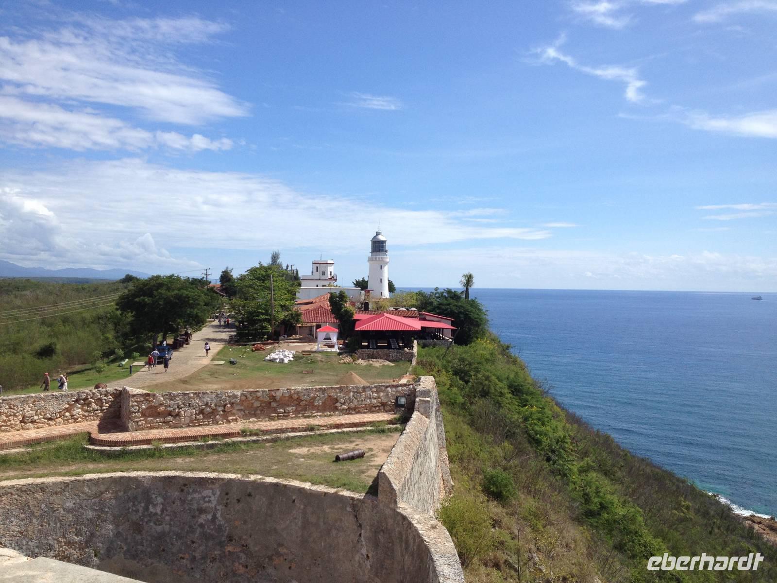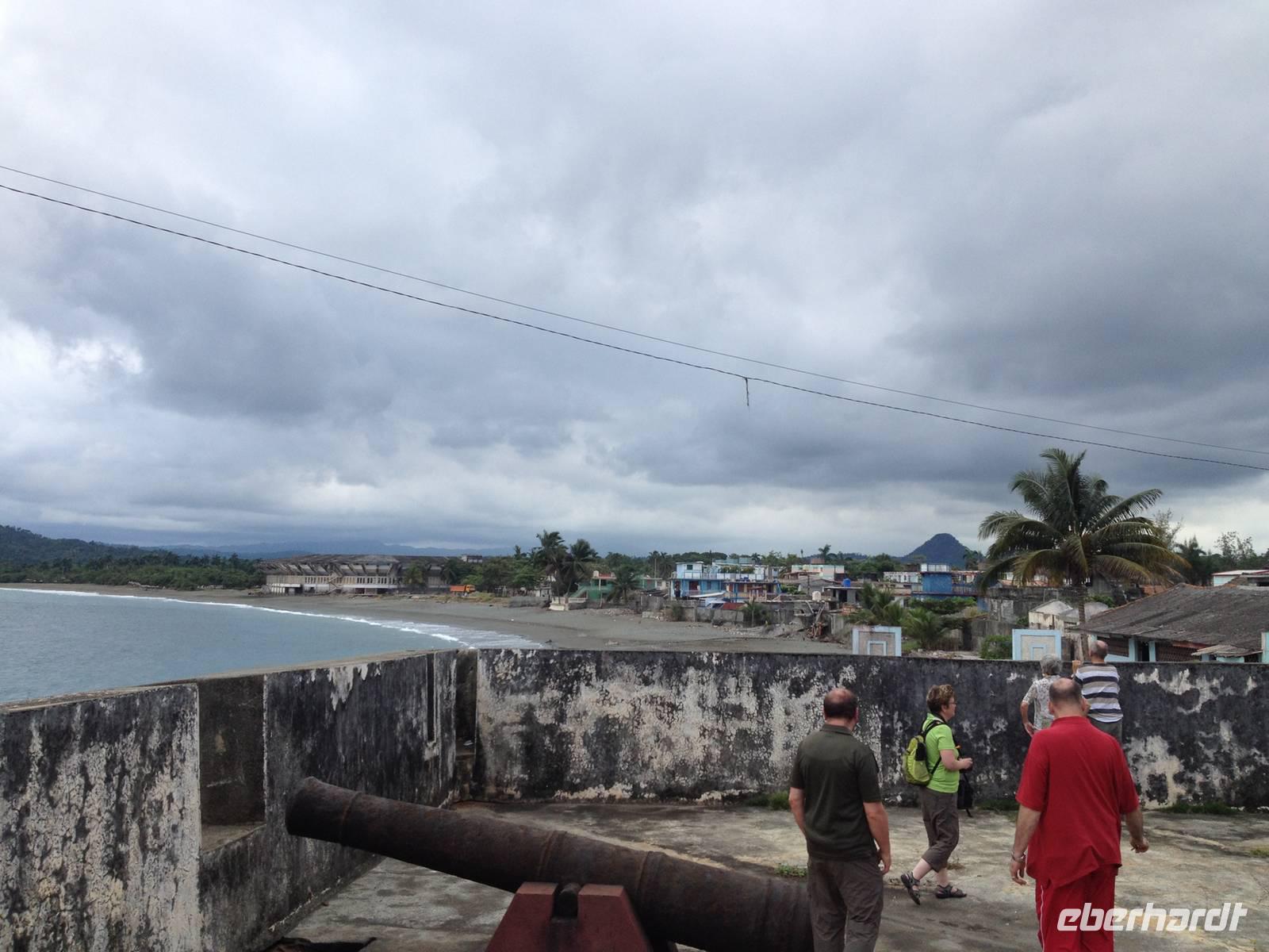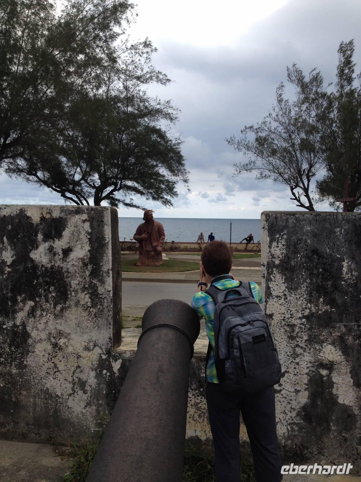 Weiter fahren wir Richtung Baracoa. Zwischen den Kakteen am Straßenrand kann man immer wieder die Küste zu sehen. Unterwegs trafen wir wieder viele Kinder, welchen wir Stifte und Süßigkeiten schenkten. An einem Aussichtspunkt auf einem Berg konnten wir sehr schön die Küste von oben sehen. Bei diesem Stopp kamen sehr viele Dorfbewohner um uns ihre Produkte zu verkaufen. In Baracoa besichtigten gemeinsam mit unserer netten und lustigen örtlichen Reiseleiterin die Festung der Stadt. Temperamentvoll erzählt sie uns die Geschichte von der Region, die Kultur, die Kunstarten und die unterschiedlichen Ethnen die dort gewohnt haben. Auch wenn die Zeit der Spanier in Kuba schon lange vorbei ist, merke ich, das die Reiseleiterin sich auf lustige Art und Weise immer ein bisschen gegen mich kämpft, weil ich Spanier bin. Bitte vergessen Sie nicht die Lieblingsgeschichte unserer Reiseleiterin! Es war die lustige Geschichte vom dem Doktor die endlich eine Frau ist.
