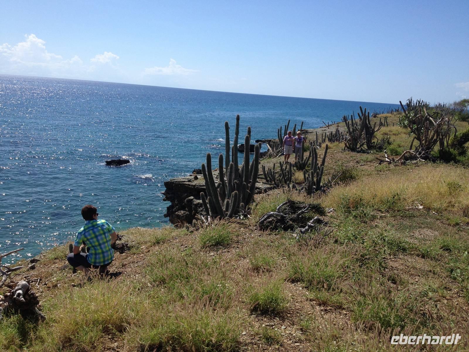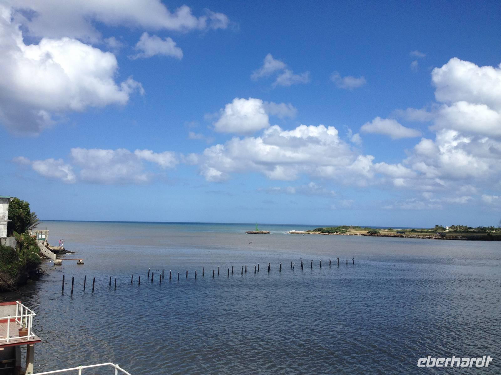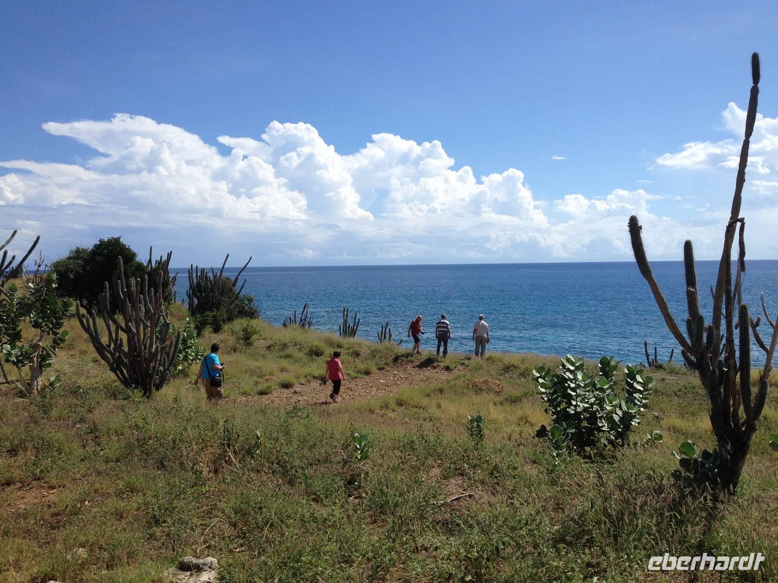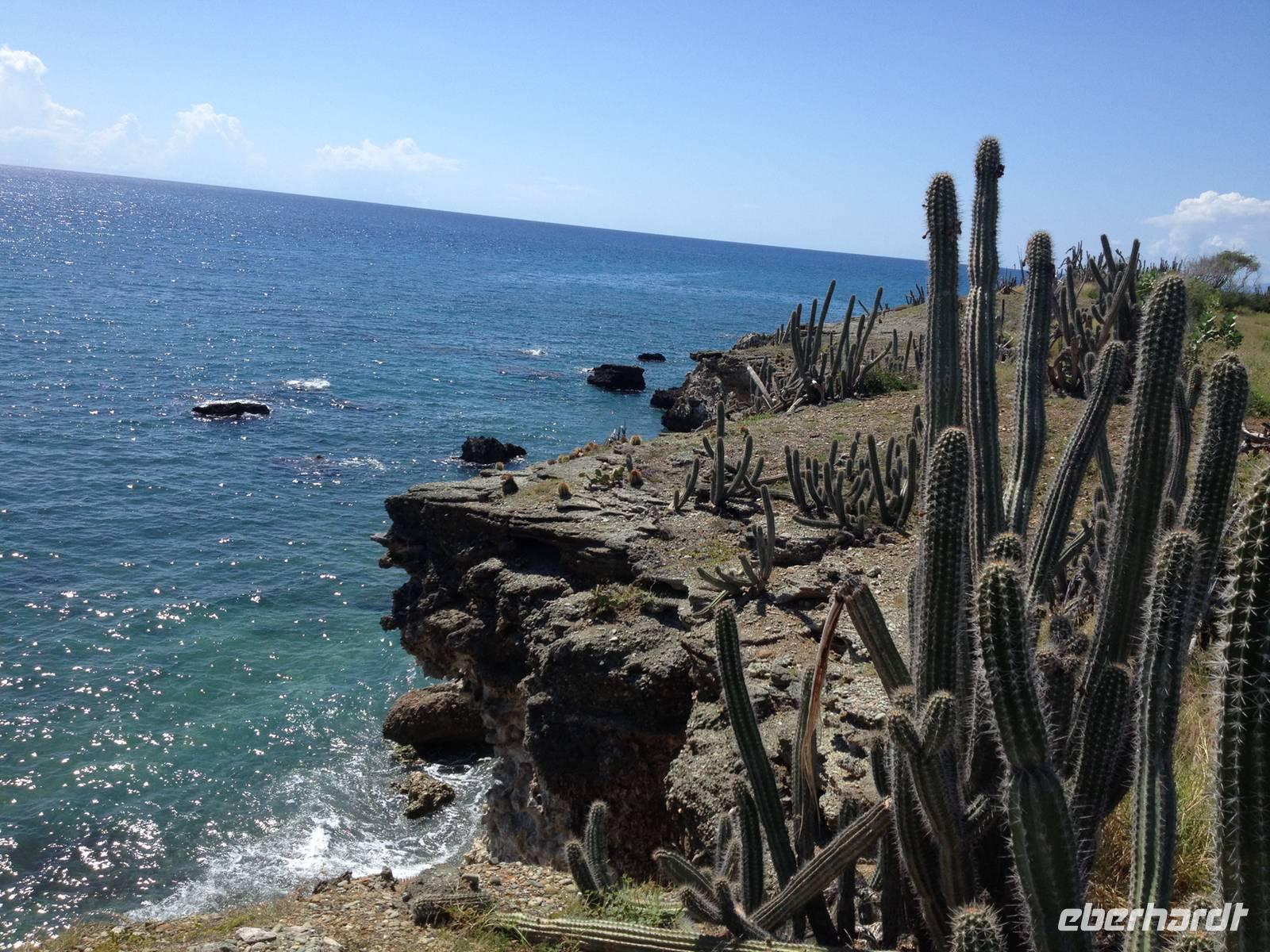 Weiter fahren wir Richtung Baracoa. Zwischen den Kakteen am Straßenrand kann man immer wieder die Küste zu sehen. Unterwegs trafen wir wieder viele Kinder, welchen wir Stifte und Süßigkeiten schenkten. An einem Aussichtspunkt auf einem Berg konnten wir sehr schön die Küste von oben sehen. Bei diesem Stopp kamen sehr viele Dorfbewohner um uns ihre Produkte zu verkaufen. In Baracoa besichtigten gemeinsam mit unserer netten und lustigen örtlichen Reiseleiterin die Festung der Stadt. Temperamentvoll erzählt sie uns die Geschichte von der Region, die Kultur, die Kunstarten und die unterschiedlichen Ethnen die dort gewohnt haben. Auch wenn die Zeit der Spanier in Kuba schon lange vorbei ist, merke ich, das die Reiseleiterin sich auf lustige Art und Weise immer ein bisschen gegen mich kämpft, weil ich Spanier bin. Bitte vergessen Sie nicht die Lieblingsgeschichte unserer Reiseleiterin! Es war die lustige Geschichte vom dem Doktor die endlich eine Frau ist.