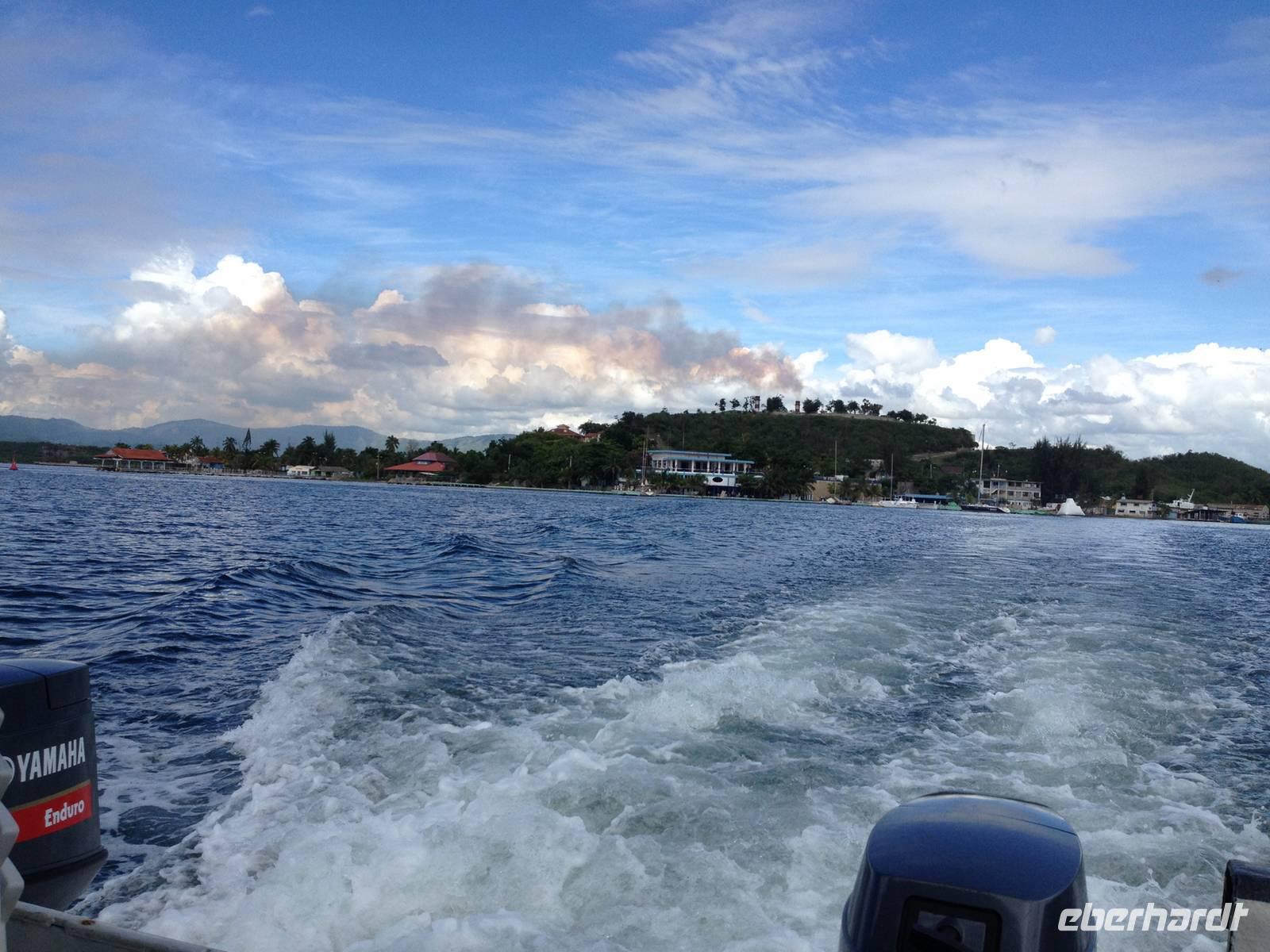 Im Hafen Punta Gorda nehmen wir am Abend das Boot nach dem Restaurant El Cayo genommen. Es ist Restaurant mit einer Terrasse, welche einen spektakulären Blick über die Bucht bietet. Im Restaurant konnten wir auch Seesterne und lokale Muscheln probieren.