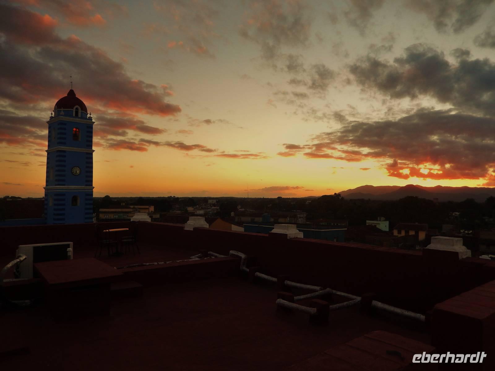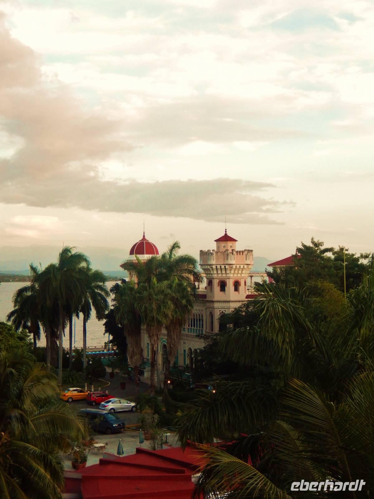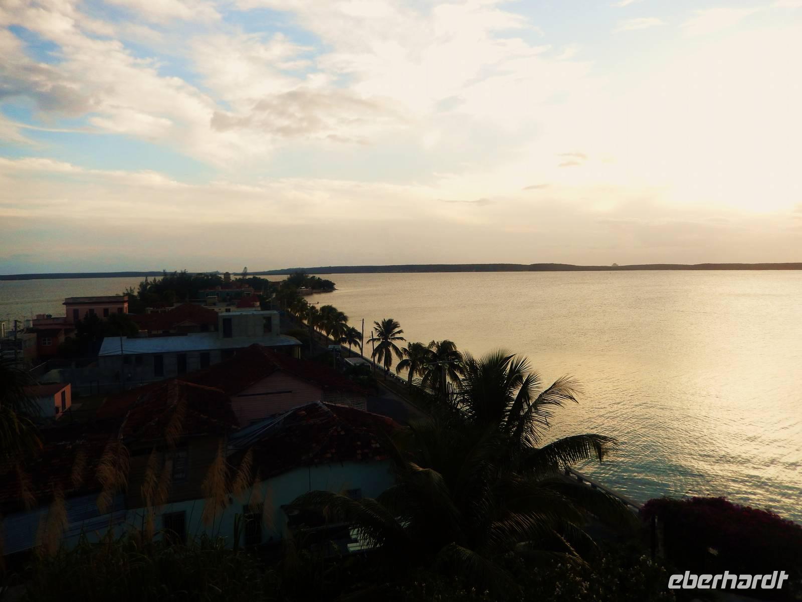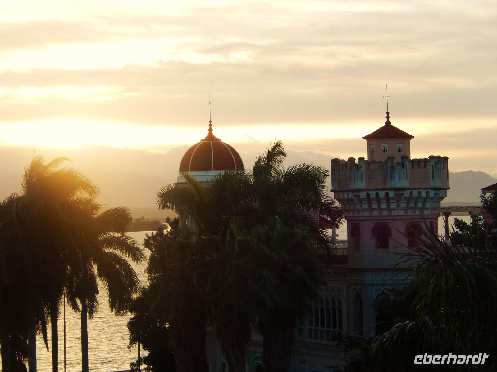 Vorbei an Karibikstränken und Palmentälern gelangen wir am Nachmittag zum Jardín Botanico in der Nähe von Cienfuegos. Gegründet wurde dieser Park 1901 von einem US-amerikanischen Zuckerbaron, welcher seltene und wertvolle Arten aus aller Welt sammelte. Wir lernen verschiedene Palmen-, Fikus- und Hibiskusarten kennen. Ein kubanischer Naturführer begleitet und und zeigt uns Bambusarten, einen Ebenholzbaum, Kanonenkugelbaum, Lidschibäume und vieles mehr. Danach fahren wir zum heutigen Übernachtungsort, nach Cienfuegos. Gleich neben unseren schönen Hotel Jagua befindet sich das Palacio de Valle. Während sich Luis um den Check in kümmert, besuchen wir das schöne Gebäude, welches kostbare Elemente der gotischen, venezianischen, barocken und maurischen Baukunst aufweist. Wie aus einem Märchen aus 1001 Nacht erscheint das Gebäude, und scheint so gar nicht hier hin zu gehören. Auf der Dachterrasse genießen wir bei einem Cocktail atemberaubenden Blick über das Meer und die Stadt, die gerade in goldenes Abendlicht getaucht wird. Später entspannen wir im Hotel, begleitet von einem unvergesslichen Sonnenuntergang. Nach dem Abendessen am reichhaltigen Hotelbuffet verweilen wir noch bei einem Drink an der Bar.