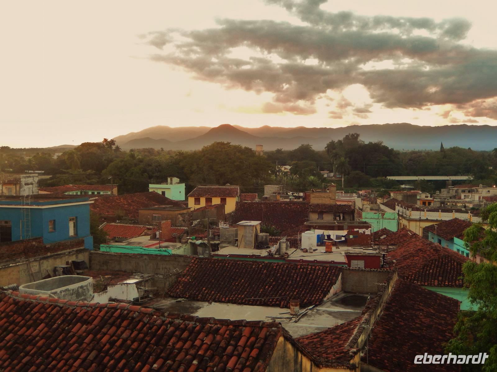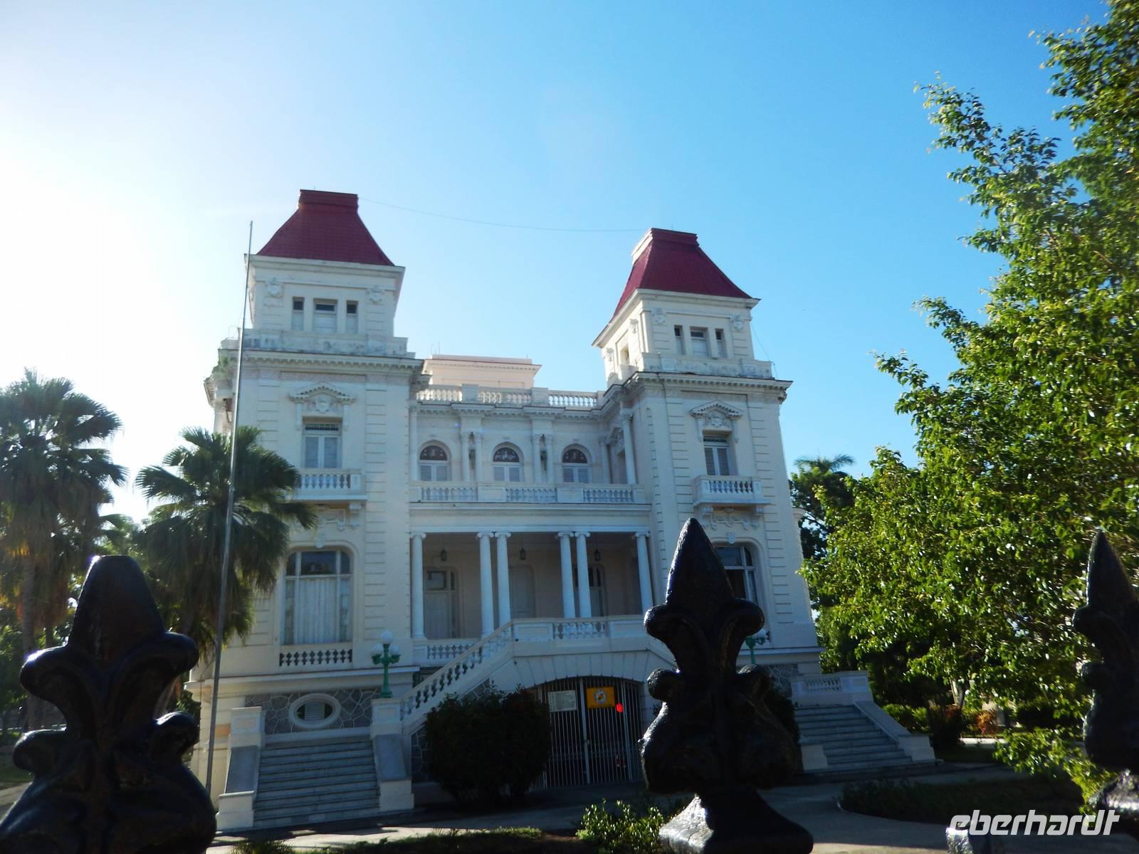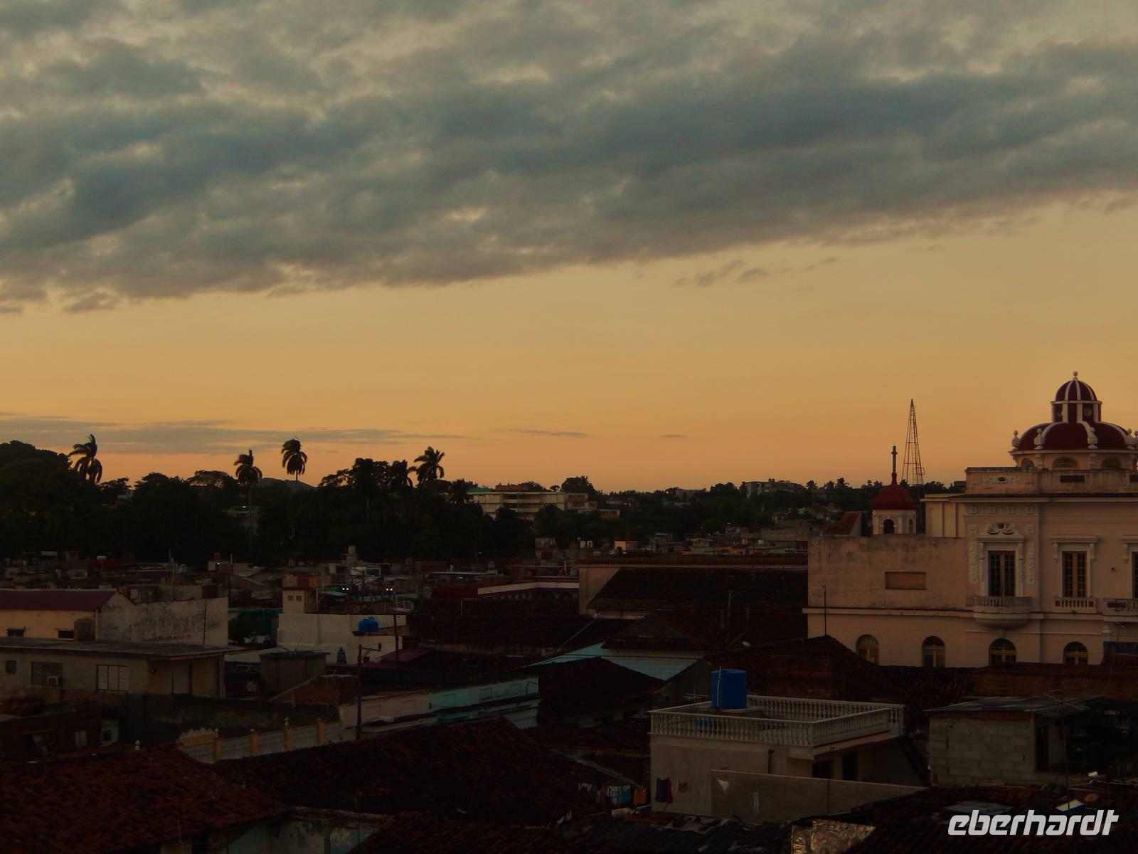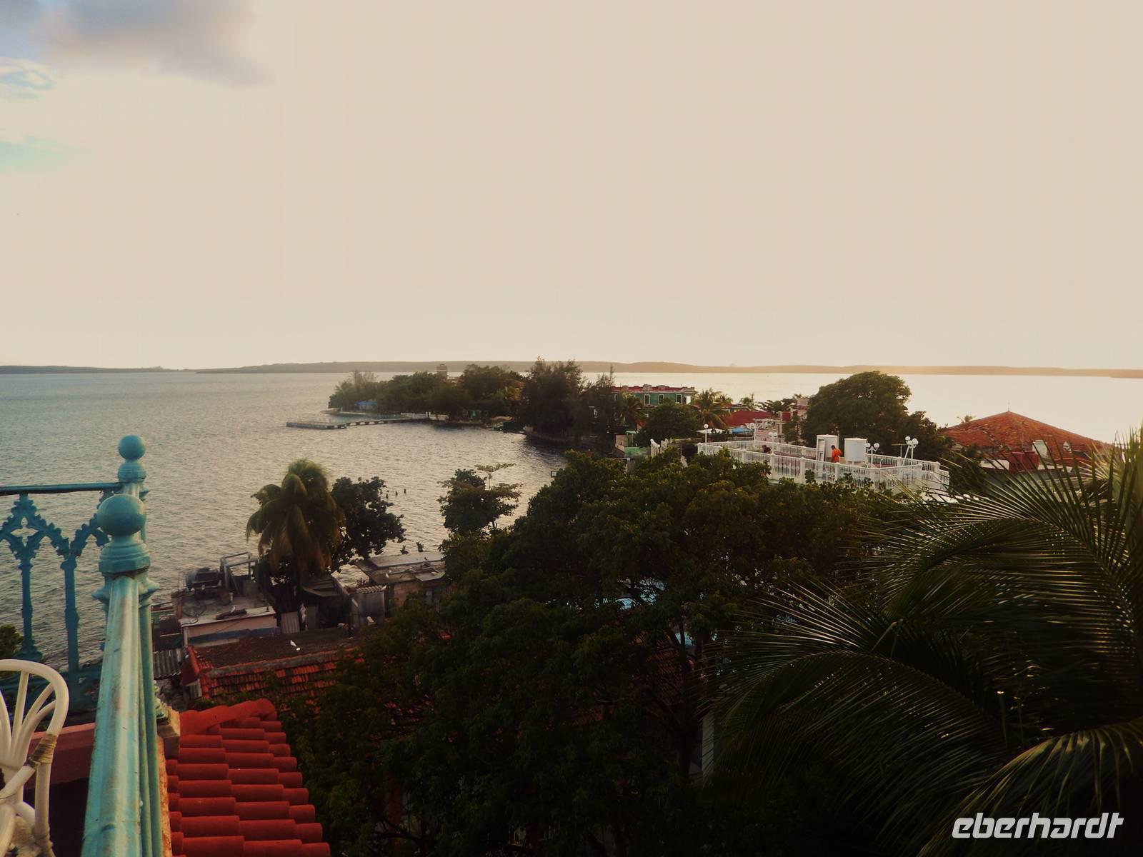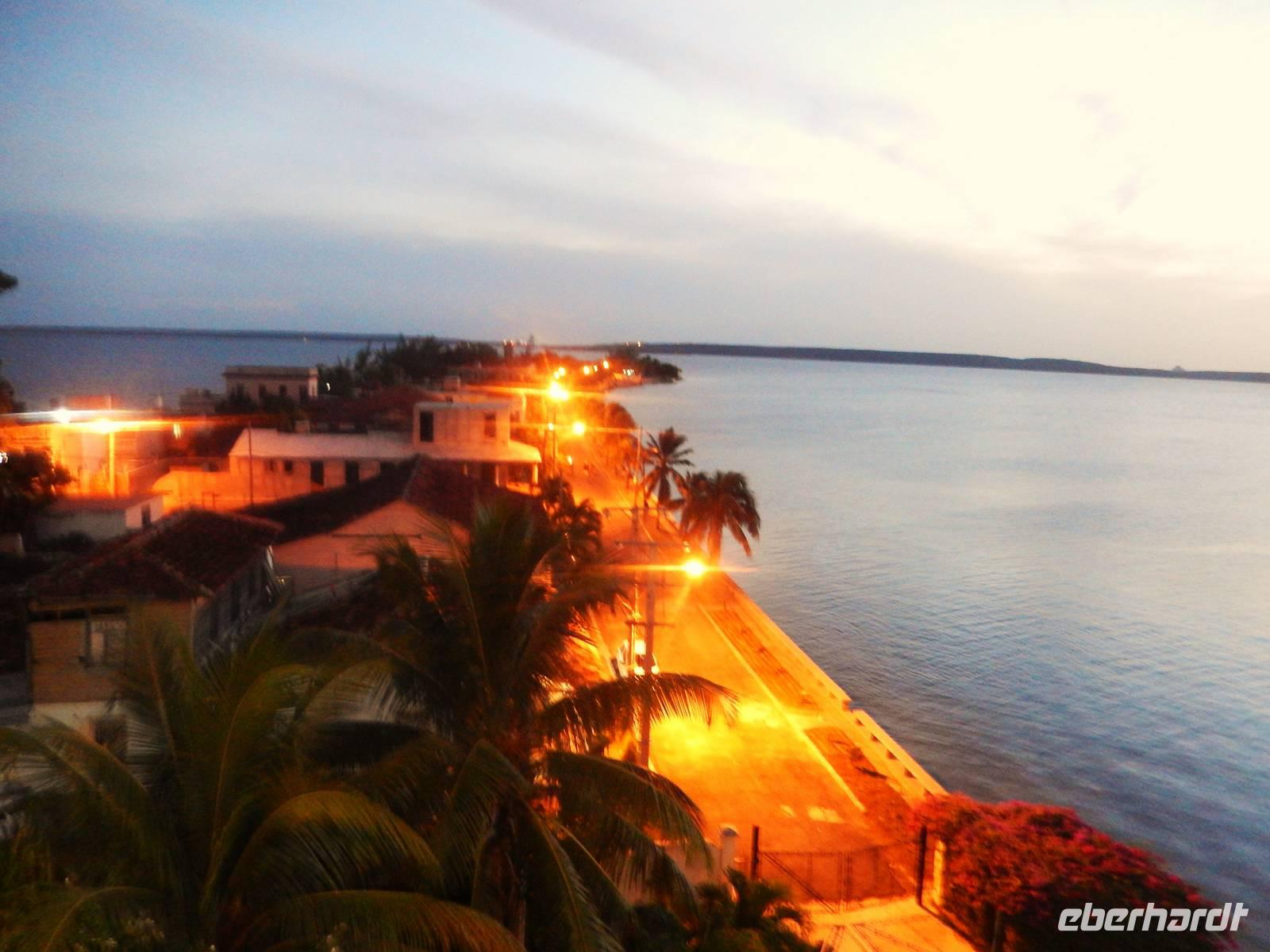 Vorbei an Karibikstränken und Palmentälern gelangen wir am Nachmittag zum Jardín Botanico in der Nähe von Cienfuegos. Gegründet wurde dieser Park 1901 von einem US-amerikanischen Zuckerbaron, welcher seltene und wertvolle Arten aus aller Welt sammelte. Wir lernen verschiedene Palmen-, Fikus- und Hibiskusarten kennen. Ein kubanischer Naturführer begleitet und und zeigt uns Bambusarten, einen Ebenholzbaum, Kanonenkugelbaum, Lidschibäume und vieles mehr. Danach fahren wir zum heutigen Übernachtungsort, nach Cienfuegos. Gleich neben unseren schönen Hotel Jagua befindet sich das Palacio de Valle. Während sich Luis um den Check in kümmert, besuchen wir das schöne Gebäude, welches kostbare Elemente der gotischen, venezianischen, barocken und maurischen Baukunst aufweist. Wie aus einem Märchen aus 1001 Nacht erscheint das Gebäude, und scheint so gar nicht hier hin zu gehören. Auf der Dachterrasse genießen wir bei einem Cocktail atemberaubenden Blick über das Meer und die Stadt, die gerade in goldenes Abendlicht getaucht wird. Später entspannen wir im Hotel, begleitet von einem unvergesslichen Sonnenuntergang. Nach dem Abendessen am reichhaltigen Hotelbuffet verweilen wir noch bei einem Drink an der Bar.