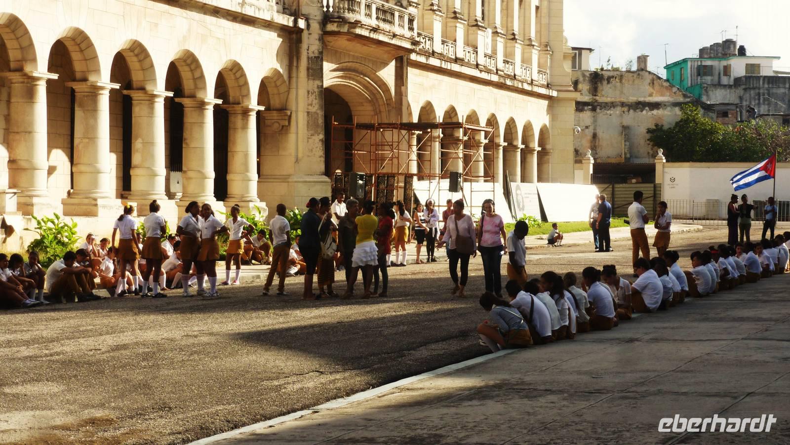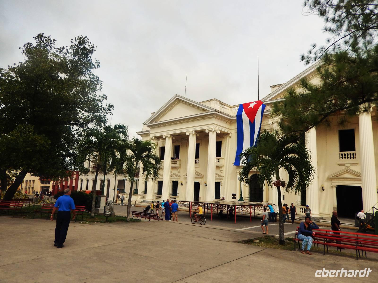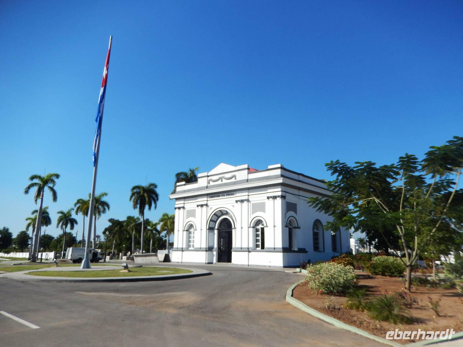 Wir fahren durch die Avenida Garzon, mit den bunten Kololnialhäusern, und stoppen auf der Pista Alegre, einem vom Orkan zerstörten Reichenviertel, wo wir auch das restaurierte Haus der Bacardi Familie sehen. Am Baseballstadion (Nationalsport Kubas) stoppen wir am Revolutionsplatz und an der Moncada Laserne, wo am 26.07.1953 die erste Revolution stattfand. Fidel Castro hat hier an jenem Tag mit dem Überfall des zweitgrößten Amreestützpunktes des Landes, ein Zeichen zum Beginn des bewaffneten Kampfes gegen die Diktatur gegeben. An der heutigen Schule verweilen wir etwas und Luis erklärt uns den damals stattgefundenen Überfall und bringt uns die Geschichte Kubas näher.