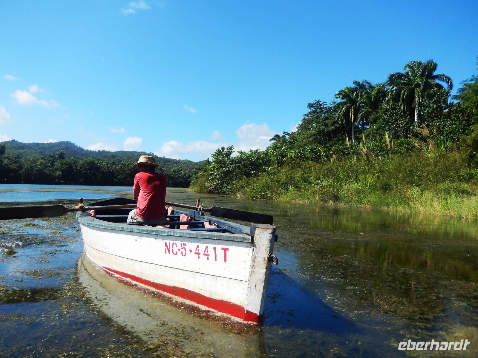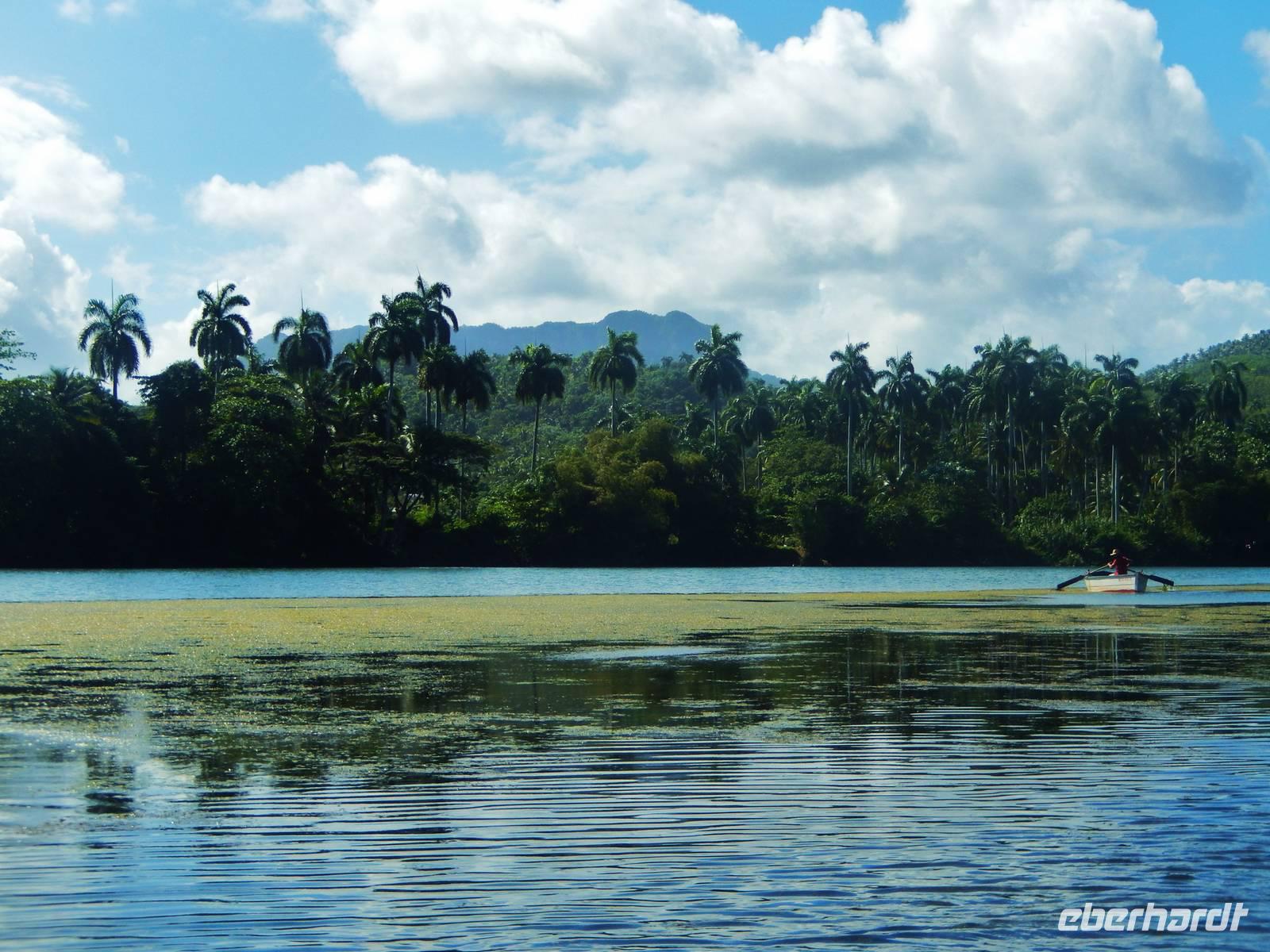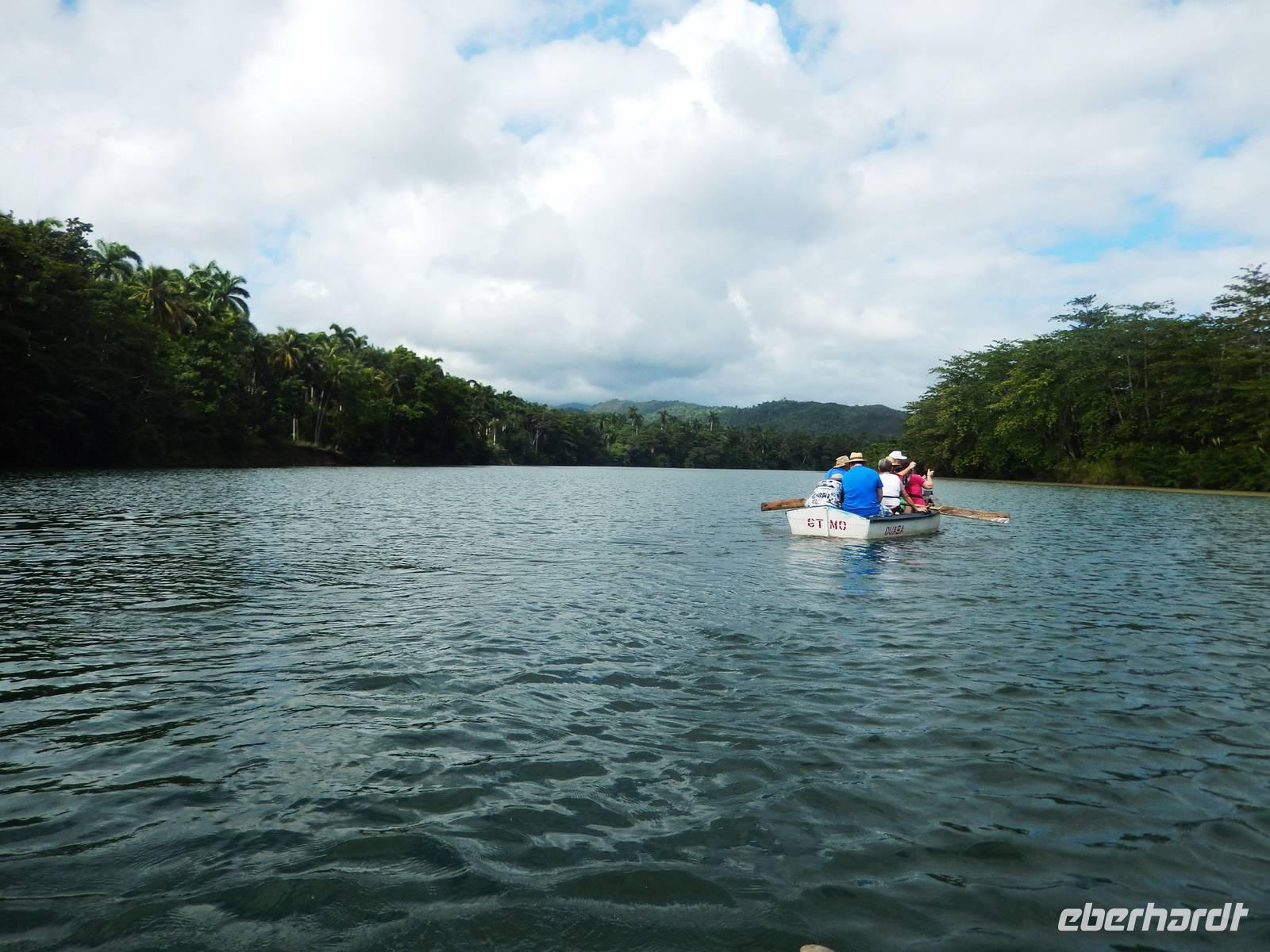 Dann geht es weiter zum Fluss Rio Toa mit der Finca Rancho Toa, wo wir von einigen kubanischen Jungs mit Booten erwartet werden. Die Gruppe wird auf zwei Holzruderboote verteilt und schon gleiten wir auf dem Fluss ans andere Ufer und genießen unter der heißen Mittagssonne die atemberaubende Aussicht auf die uns umgebenden Regenwälder. Der Río Toa verfügt über ca. 50 Nebenflüsse und führt das meiste Wasser hier auf Kuba. Am Ufer spazieren wir durch den Regenwald und lassen uns die verschiedenen Pflanzen und Baumarten erklären. Inmitten im Wald sehen wir auch Schweine, die es sich hier gut gehen lassen und ebenso ein Chamäleon.