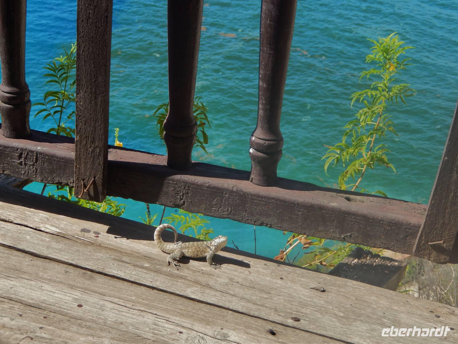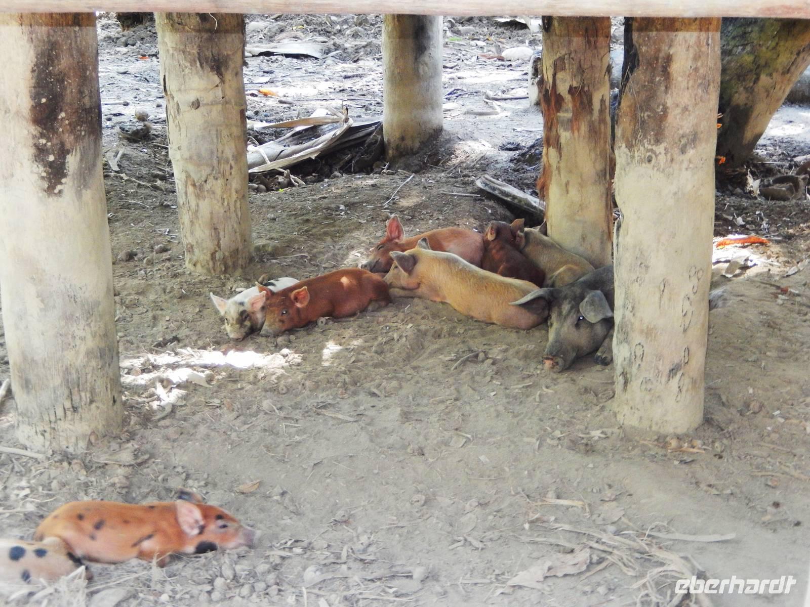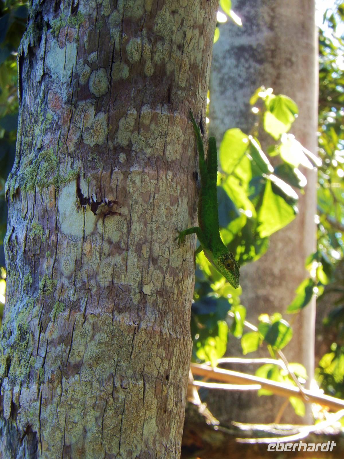 Dann geht es weiter zum Fluss Rio Toa mit der Finca Rancho Toa, wo wir von einigen kubanischen Jungs mit Booten erwartet werden. Die Gruppe wird auf zwei Holzruderboote verteilt und schon gleiten wir auf dem Fluss ans andere Ufer und genießen unter der heißen Mittagssonne die atemberaubende Aussicht auf die uns umgebenden Regenwälder. Der Río Toa verfügt über ca. 50 Nebenflüsse und führt das meiste Wasser hier auf Kuba. Am Ufer spazieren wir durch den Regenwald und lassen uns die verschiedenen Pflanzen und Baumarten erklären. Inmitten im Wald sehen wir auch Schweine, die es sich hier gut gehen lassen und ebenso ein Chamäleon.