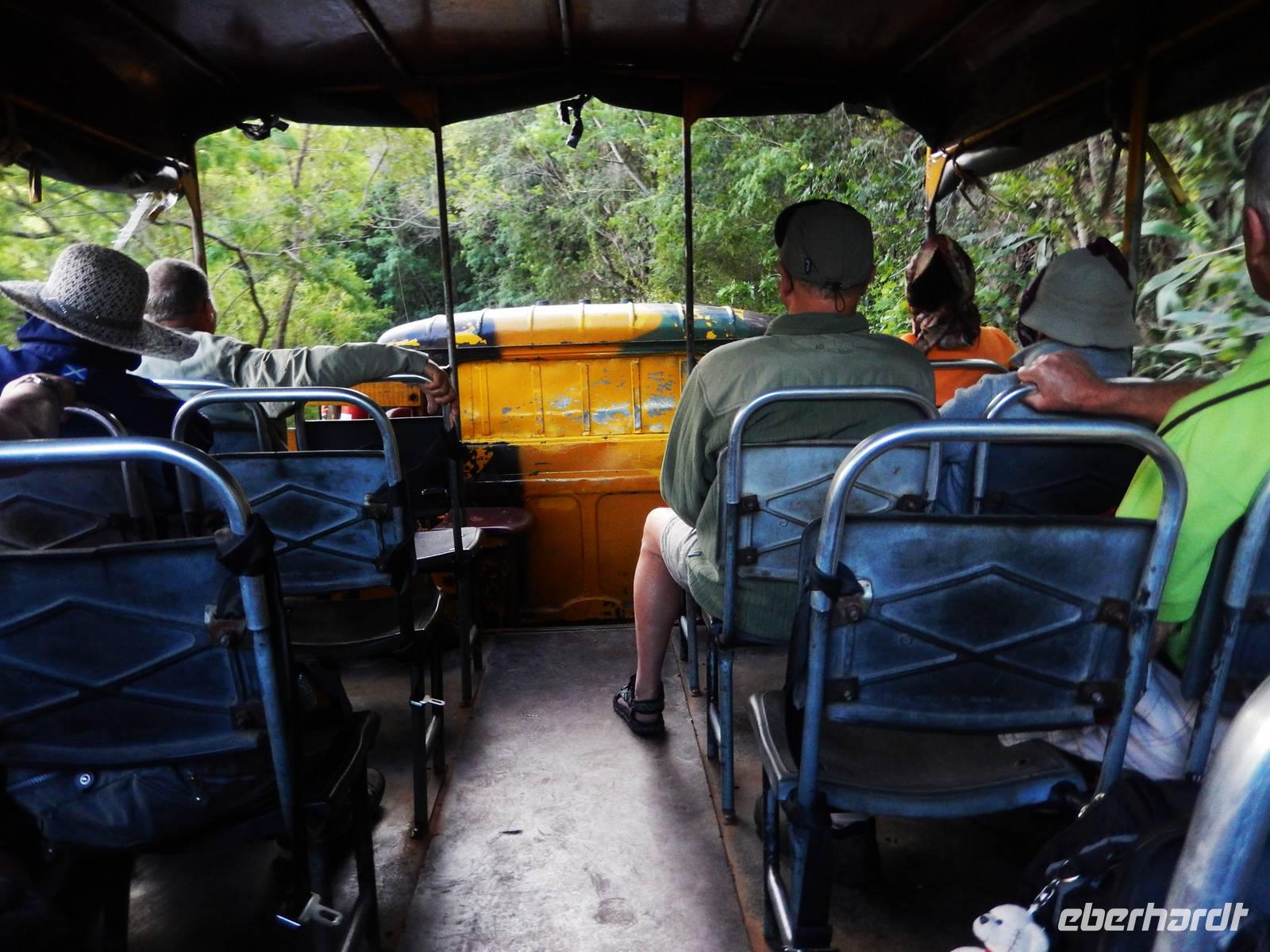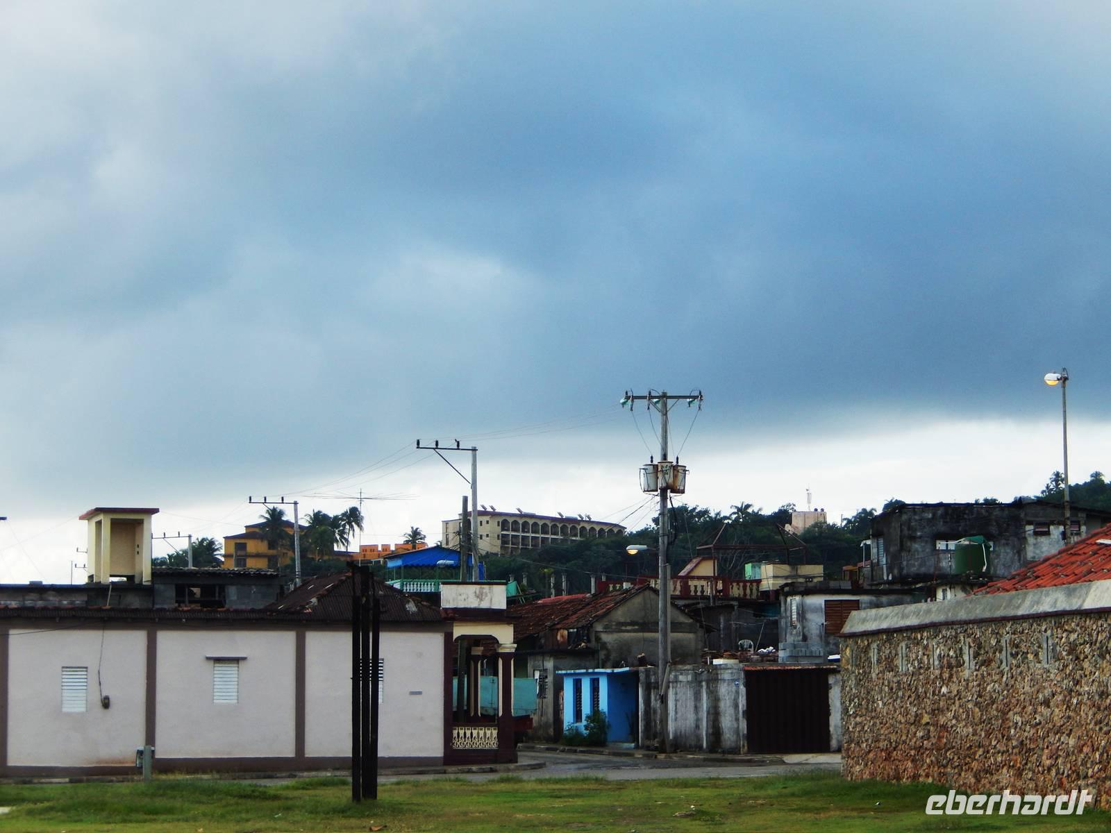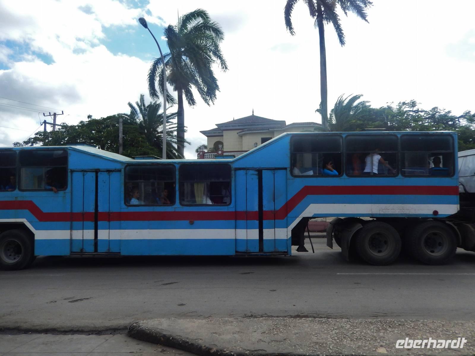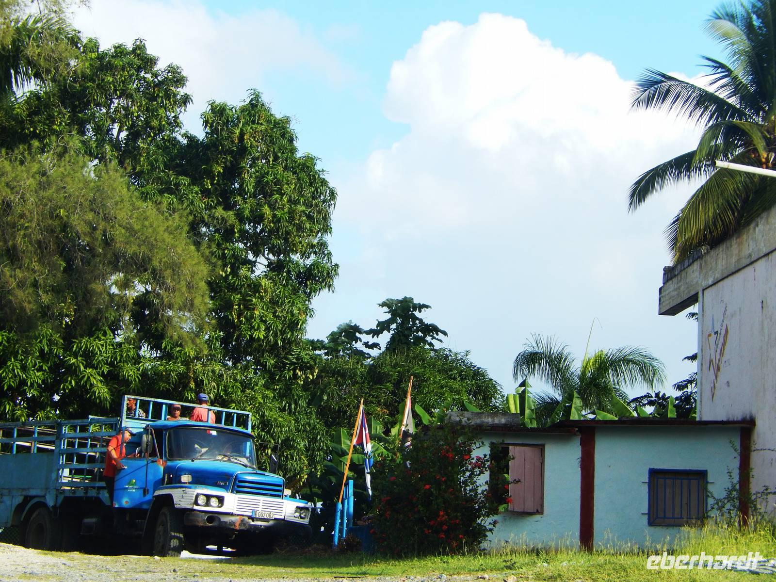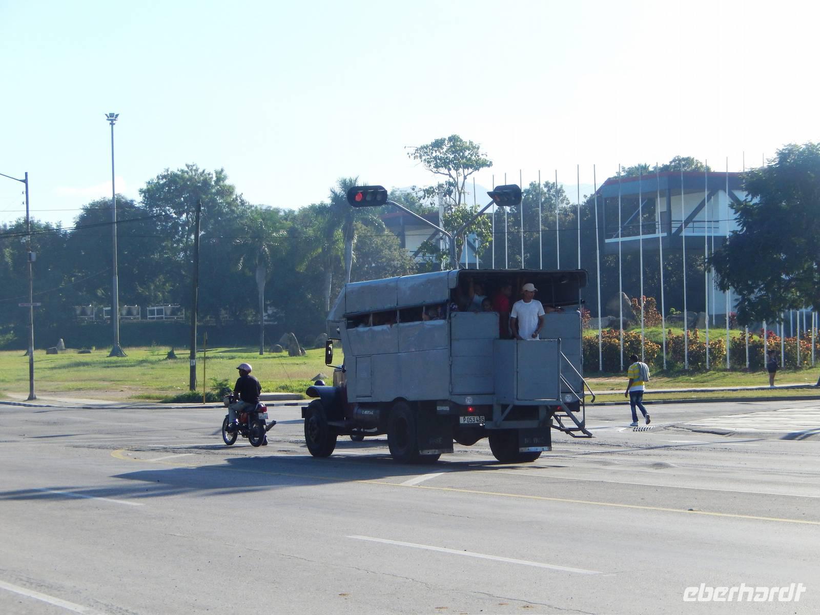 Wir begeben uns auf unsere Stadtrundfahrt durch Santiago de Cuba und Luis gibt uns erste Erläuterungen zum Land mit seinen Wohnungs- und Transportproblemen. Unser sympatischer und ständig gut gelaunter Luis hat 3 Jahre in der DDR gelebt. In Santiago de Cuba sind wir erstaunt über die hier üblichen Busse: alte Lastwagen in allen Formen und Größen und immer bis zum letzten Zentimeter vollgestopft mit Kubanern. Diese sitzen auch geduldig am Straßenrand und warten laut Luis manchmal stundenlang auf einen Bus.