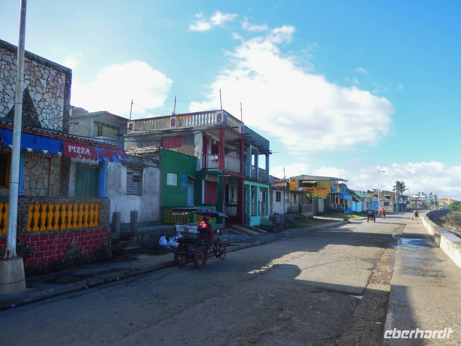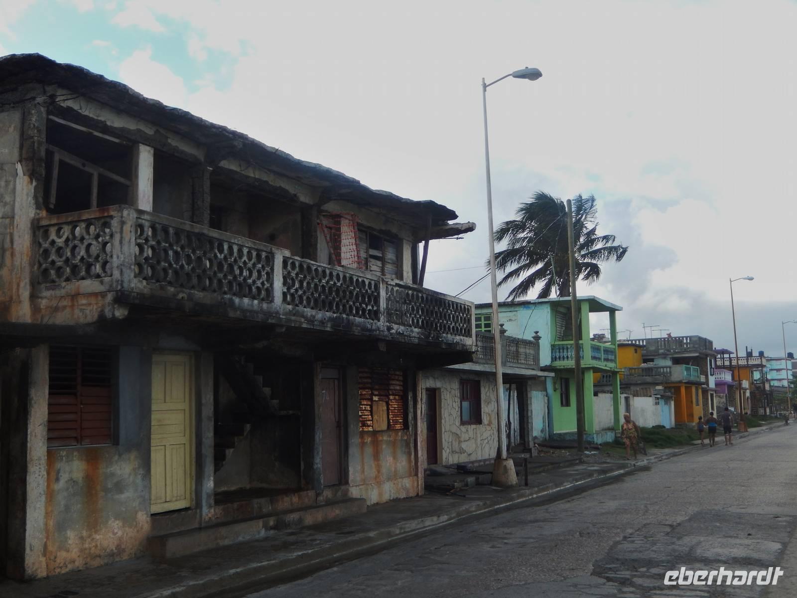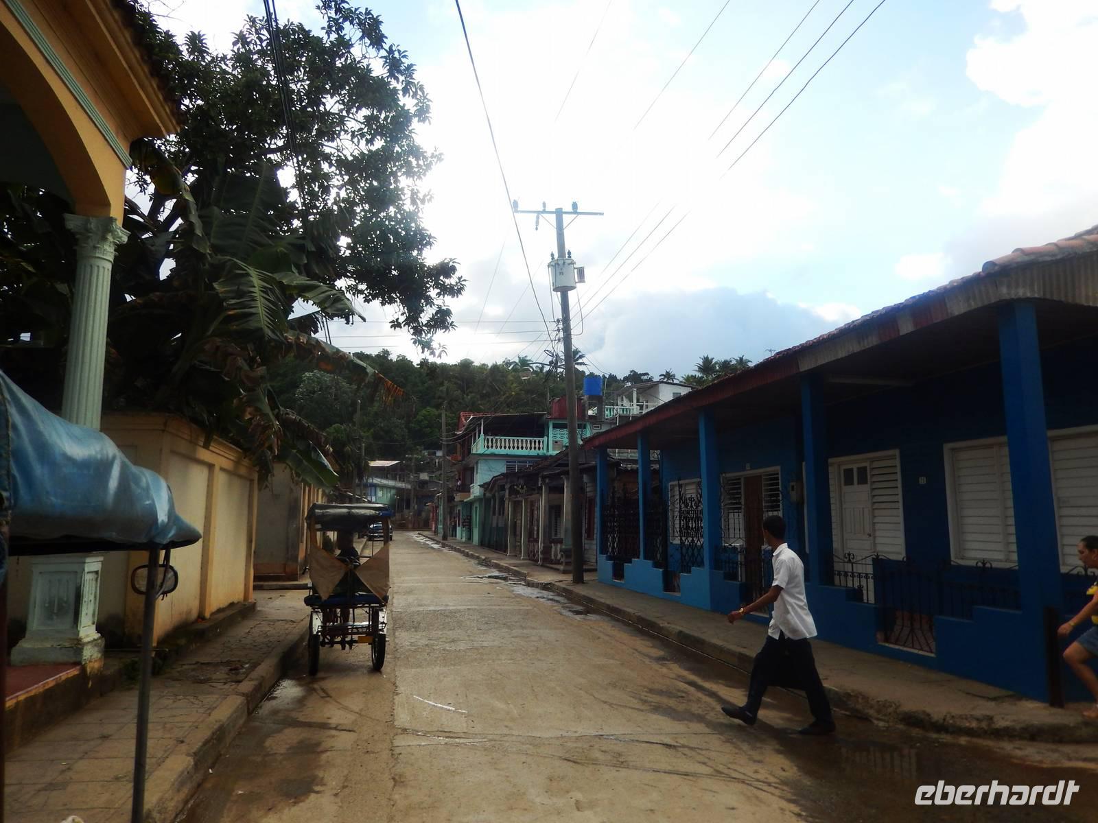Das Gebiet rund um Baracoa ist für seinen ausgezeichneten Kakao bekannt. 80 Prozent von Kubas Kakao wird hier in Baracoa produziert. Auf der Strecke finden wir einen Tamarindebaum, eine afrikanische Hülsenfrucht, die uns unser Reiseleiter pflückt. Wir kosten kleine Bananen, die hier erstaunlich zitronig schmecken. An Zuckerrohrfeldern und Karibikstränden schlängelt sich unser Weg in Richtung Guantanamo zur nächsten Pause. Hier sehen wir Bauern, die noch wie in vergessenen Zeiten mit Ochsenkarren ihre Felder bestellen. Diese Rinderart trägt den Namen Cebu. Ebenso begegnen uns neben unzähligen Pferdekutschen und Lastwagen, die hier den Personentransport darstellen, hin und wieder auch einer der berühmten Kamelbusse. Am Vormittag legen wir in Guantanamo eine Pause im Hotel Islazul ein, genießen einen Mojito und schauen einem tanzenden Paar zu. Weiter geht es entlang an der weißblauer Karibikküste, wo wir gegen Mittag eine Picknickpause einlegen. Luis und Busfahrer Che Lenin haben uns Sandwiches, Guaven und Mandarinen besorgt. An der kleinen Traumbucht, die an unserem Rastplatz schließt, entspannen wir am Strand. Hier finden wir tolle Muscheln und Fossilien und genießen eine bilderbuchgleiche Aussicht. Vorbei an kleinen cubanischen Dörfchen passieren wir erreichen endlich die berühmte Passstraße La Farola. Busfahrer Che Lenin hat es heute gar nicht so einfach, denn die über 300 Kurven der 50 km langen steilen Straße erfordern viel Konzentration. Während der Panoramafahrt haben wir Sicht auf das sattgrüne Tal mit den dicht bewaldeten Bergen der Sierra de Purial und Cuchillas de Baracoa. Überall an der Straße versuchen Einheimische die vorbeikommenden Touristen anzuhalten, unter anderem, um das hier bekannte Cucuruchu zu verkaufen. Luis kauft jedem von uns eine dieser Leckereien. Cucuruchu ist eine in Tütchen aus Palmenblättern gefüllte Süßspeise, ein Brei aus Kokosraspeln, Zucker, Honig, Mandeln und Früchten. Diese lassen wir uns auf dem Rest der Traumstraße schmecken und erreichen bald unseren Übernachtungsort Baracoa. Der kleine Küstenort zeugt von viel Geschichte und widerfahrenem Leid. Die bunten Kolonialhäuser sind besonders an der Küste arg beschädigt. Schuld daran ist der Hurrikan Ike, der hier im Jahre 2008 wüstete und ca. 200 Häuser an der Küste komplett zerstörte. Ein trauriger Anblick, nur wenige Häuser sind schon renoviert und in den Ruinen wohnen weiterhin Menschen. In der Innenstadt sieht es da schon freundlicher aus. Baracoa, die älteste Stadt Kubas, verzaubert uns mit bunten Plattenhäusern und einem quirligen Zentrum.