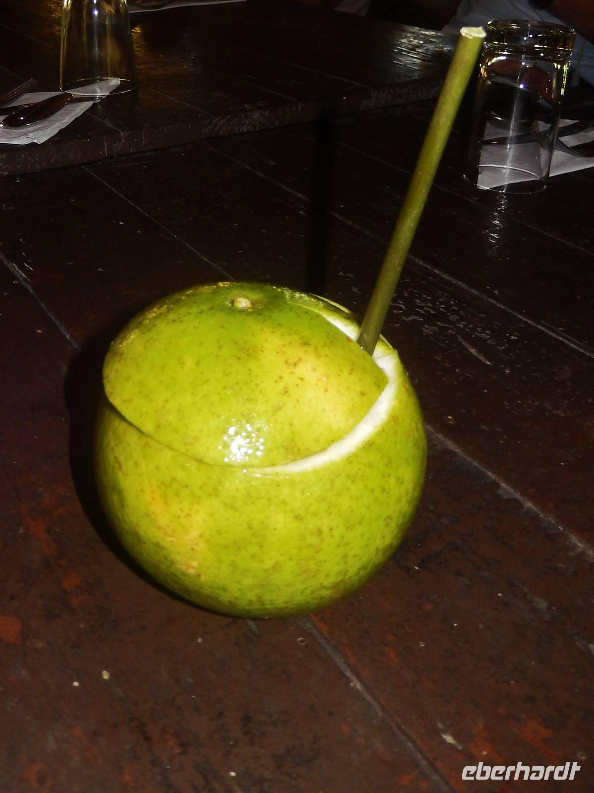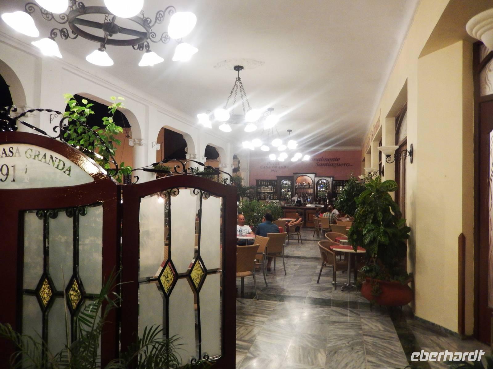 Später schippern wir wieder zurück zur Finca und bekommen in der traditionellen Anlage mit Palmendachhütten ein leckeres Mal vorgesetzt. Wir kosten das für Kuba bekannte Maniok, dazu gebackene Kochbananen. Es gibt leckeres Gänsefleisch und eine Suppe, die wir in Bambusrohren serviert bekommen. Als Abschluss wird ein Dessert aus weichem Kokosnussfleisch serviert. Dieses ist sehr süß und für uns eher gewöhnungsbedürftig. Ein Augenschmaus und Genuss sind auch die Cocktails in Naturgefässen. Wir trinken aus Grapefruit- und Kokosnussbehältern und lassen uns von kubanischen Musikern in die richtige Stimmung versetzen. Nach diesem ereignisreichen Tag fahren wir wieder zurück nach Santiago de Cuba. Unser Fahrer Che Lenin bringt da wieder eine Glanzleistung, denn die kurvenreichen Straßen erfordern auf der 5 Stunden Fahrt hohe Konzentration. Bei strömenden Regen erreichen wir das Zentrum von Santiago de Cuba und checken im Zentrumshotel Casa Granda, direkt neben der berühmtesten Casa de la Trova von Kuba ein. Im Restaurant probieren einige von uns zum ersten Mal Ropa Vieja oder wie wir es ab sofort scherzhaft nennen Alte Lumpen. Darunter versteht man zerrupftes Rindfleisch, sehr schmackhaft zubereitet. Nach diesem langen Tag fallen wir anschließend nur noch ins Bett.